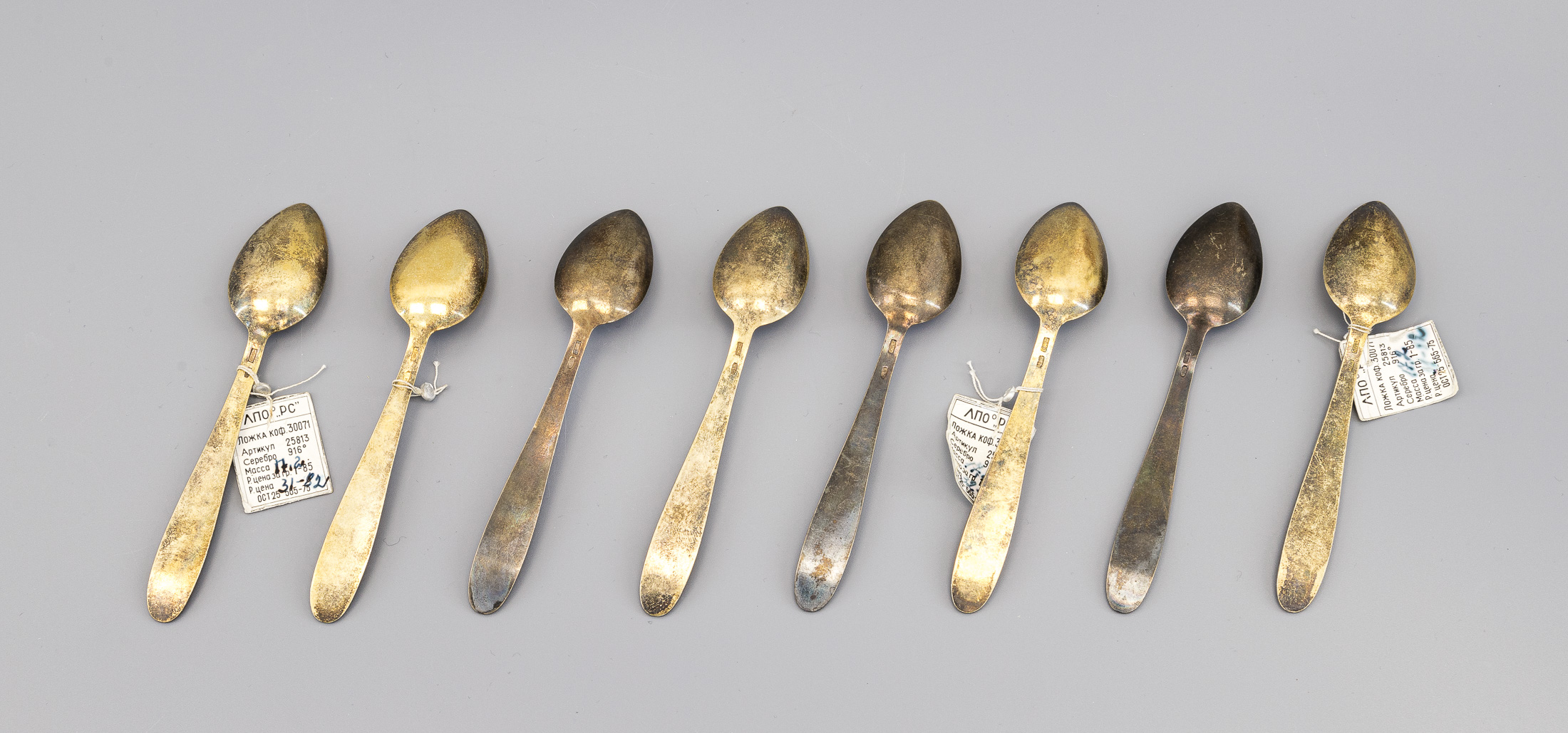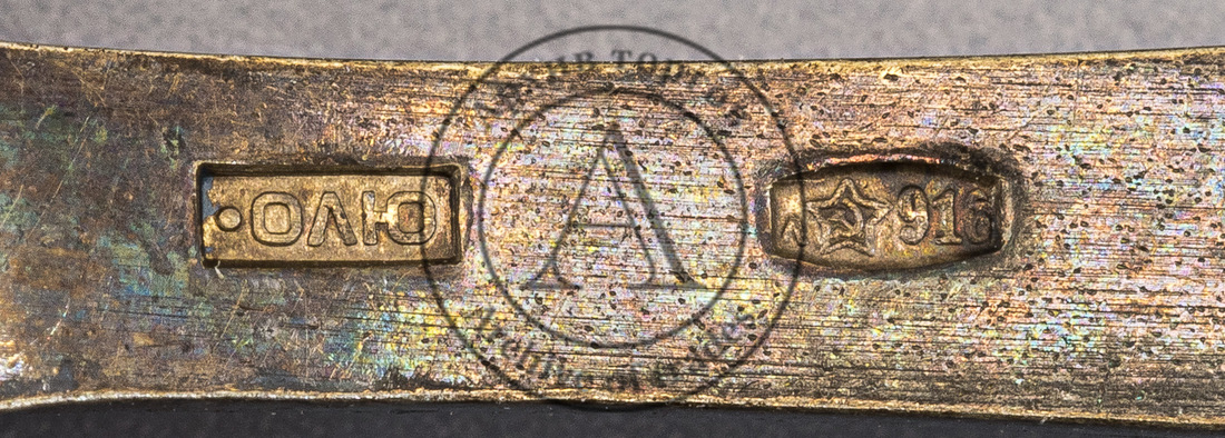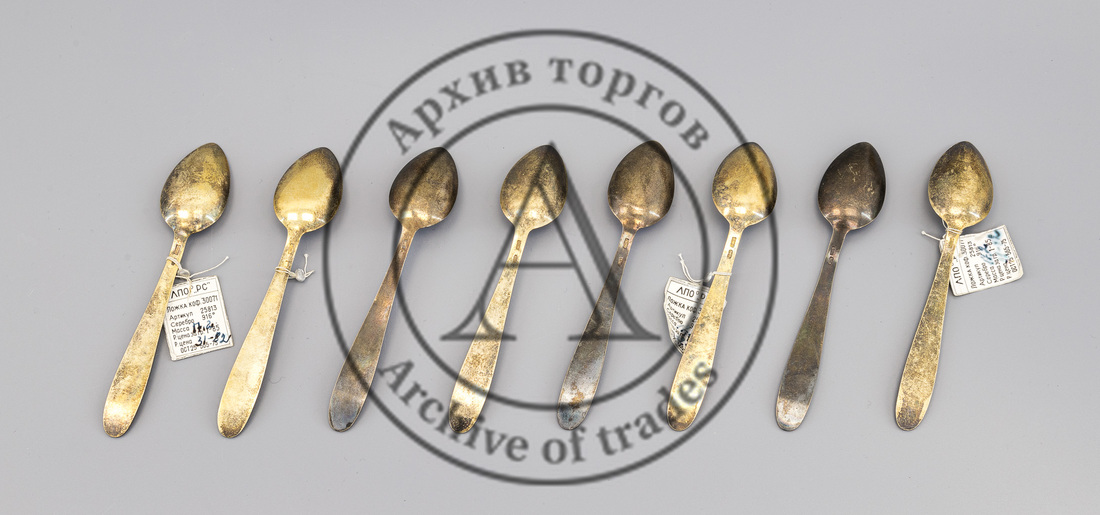 Клейма: 1) 916-й пробы с серпом и молотом на фоне пятиконечной звезды и литерой «л» (Северо-Западная государственная инспекция, г. Ленинград, 1958-1991 гг.), в щитке в виде прямоугольника с выпуклыми противоположными горизонтальными сторонами; 2) в прямоугольных щитках клейма изготовителя с указанием года производства: «·0ЛЮ» (на семи ложках), «·9ЛЮ» (на одной ложке).