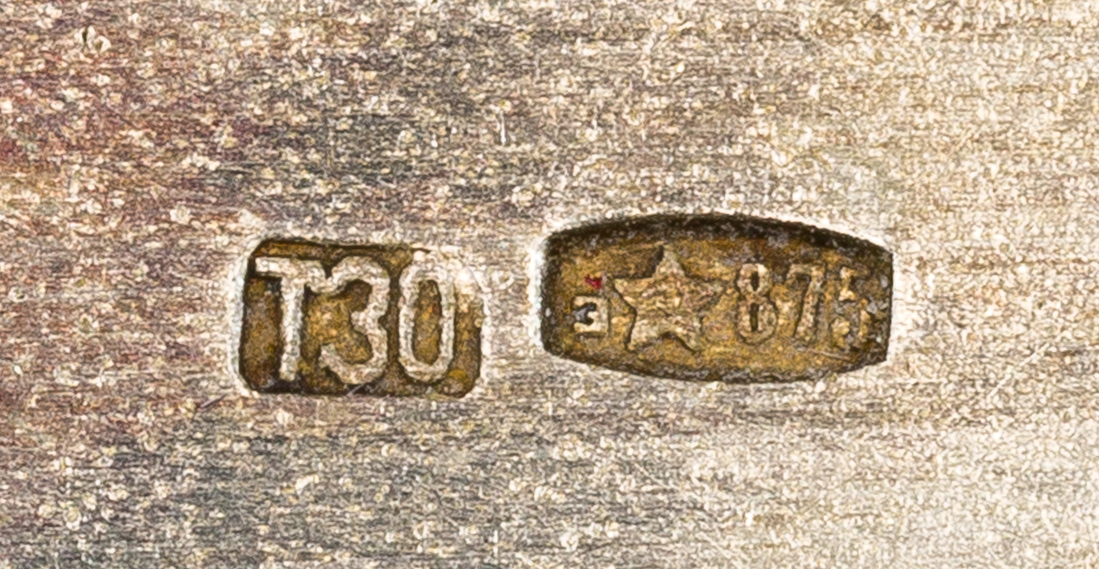 Клейма: 1) 875-й пробы с «серпом и молотом внутри пятиконечной звезды» и литерой «Э» (шифром Государственной инспекции пробирного надзора по Эстонской ССР, г. Таллин) в щитке в виде прямоугольника с выпуклыми противоположными сторонами (1958–1991 гг.); 2) клеймо завода с датой производства «ТЗ0» (1960) в прямоугольном щитке.