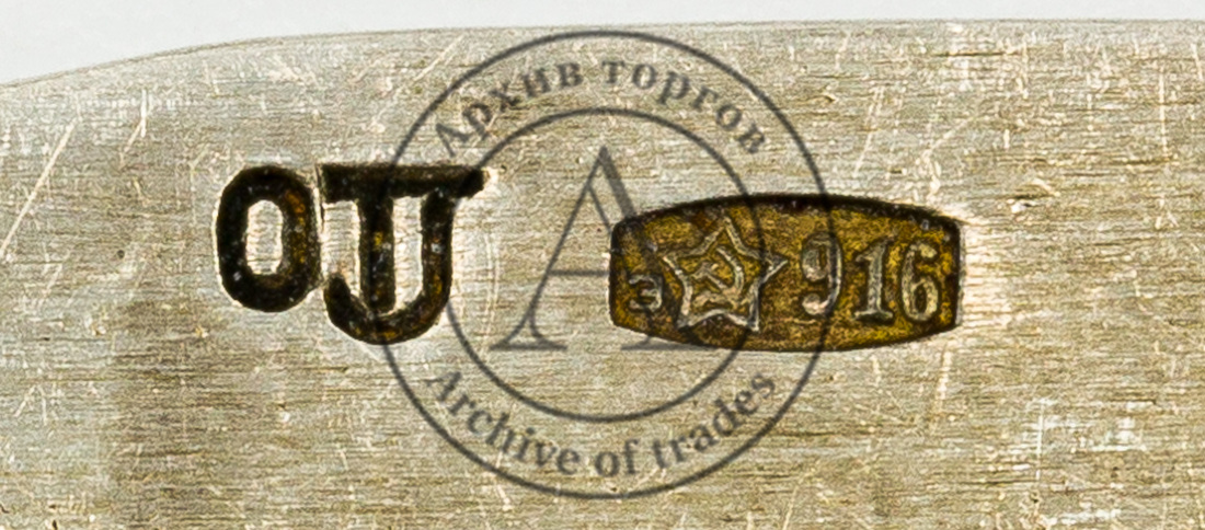 Клейма: 1) 916-й пробы с «серпом и молотом внутри пятиконечной звезды» и литерой «Э» (шифром Государственной инспекции пробирного надзора по Эстонской ССР, г. Таллин) в щитке в виде прямоугольника с выпуклыми противоположными сторонами (1958–1991 гг.); 2) клеймо завода с датой производства «0TJ».