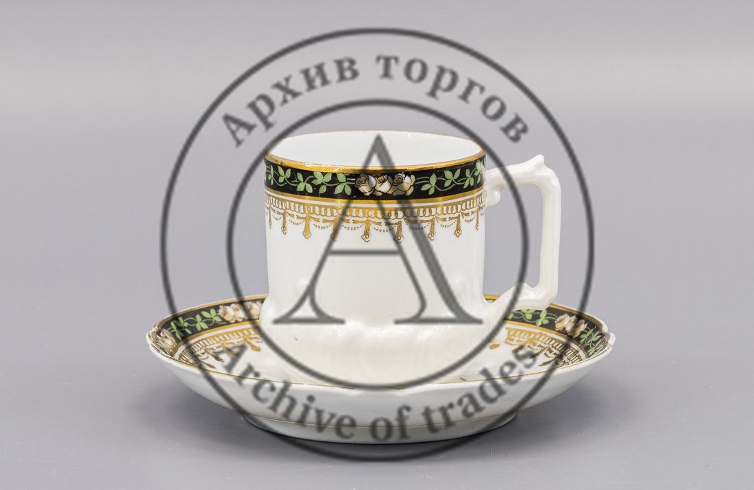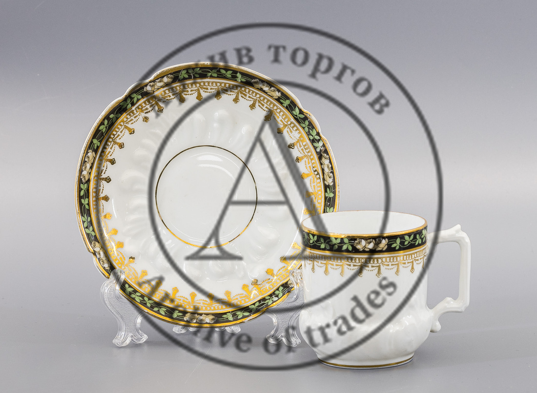 Сохранность: потертости золочения, небольшая трещина на стенке одной чашки; две сквозные трещины и скол на края второй чашки; следы трафаретной печати.