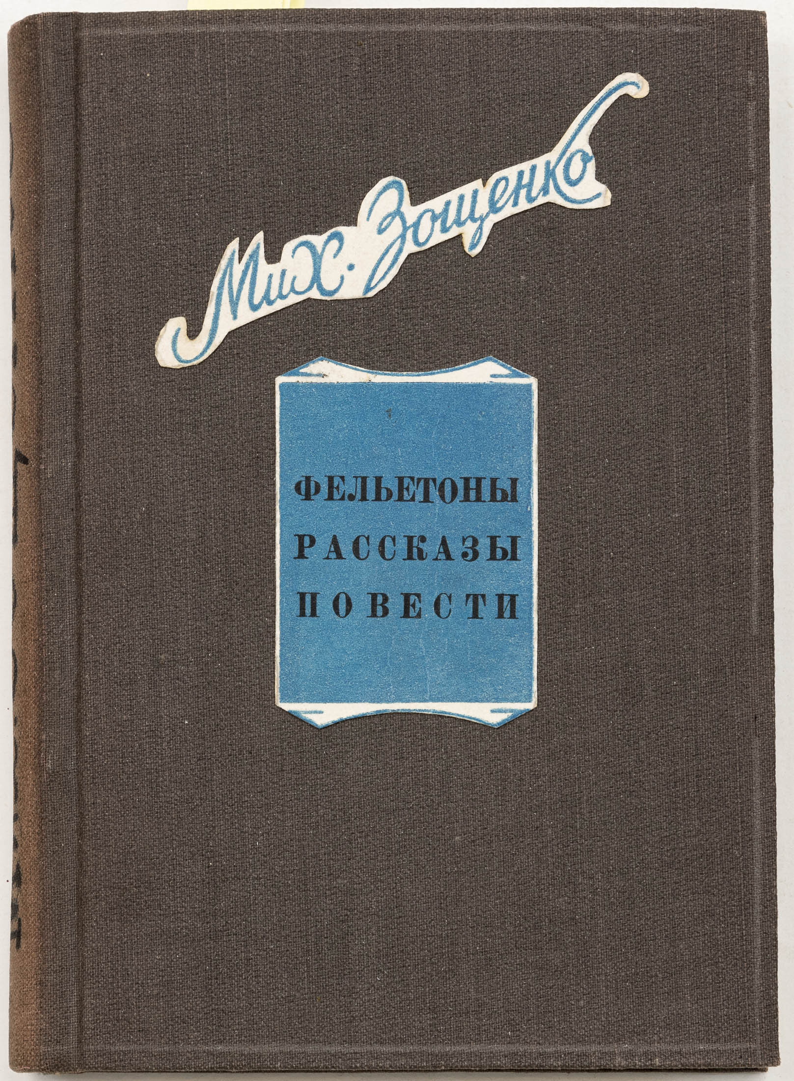 В твердом издательском переплете. На верхней крышке наклеены фрагменты обложки книги «Фельетоны. Рассказы. Повести». Сохранена лицевая издательская обложка книги «Рассказы Назара Ильича господина Синебрюхова».