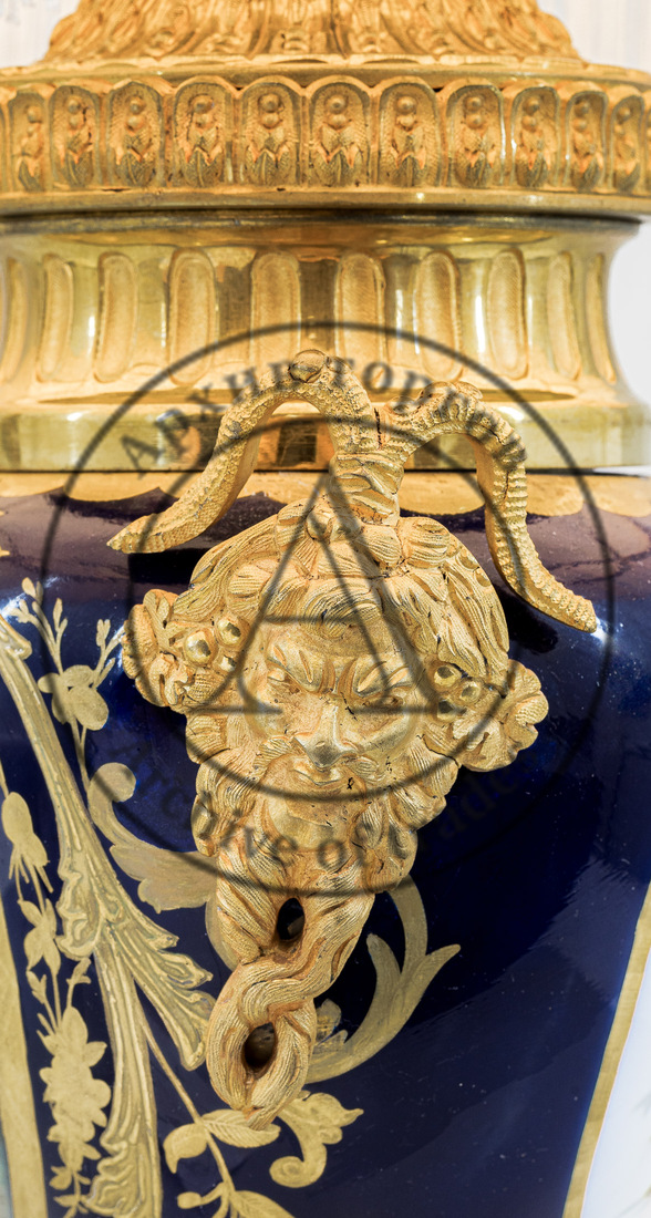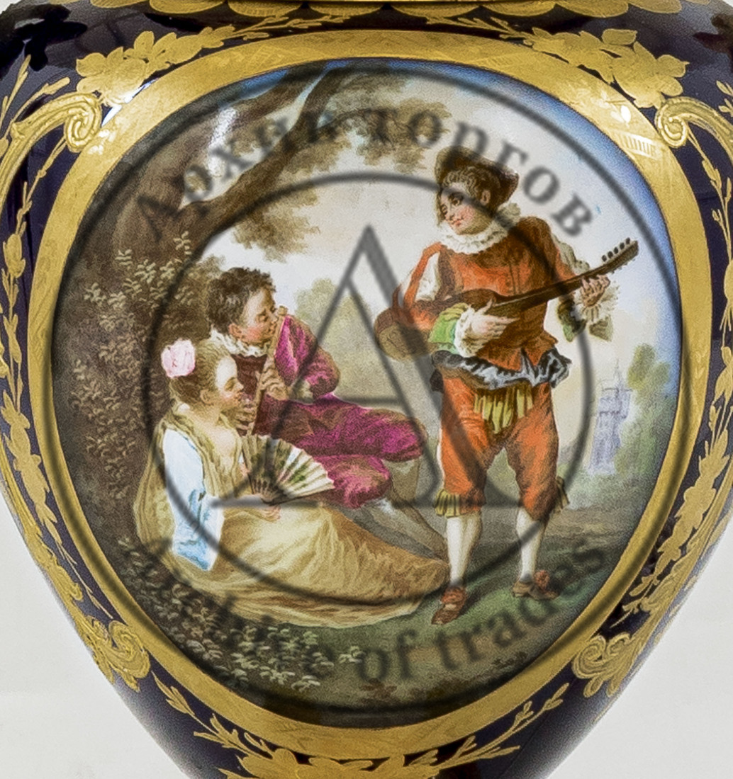Выполнено в духе Севрской фарфоровой мануфактуры. В медальонах с одной стороны изображена галантная сцена, с другой — букет цветов.