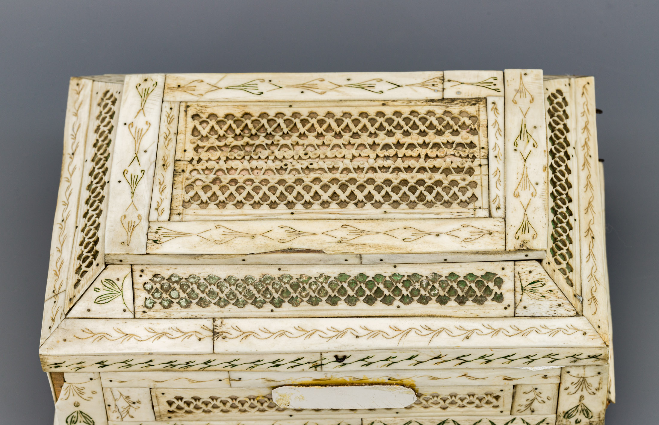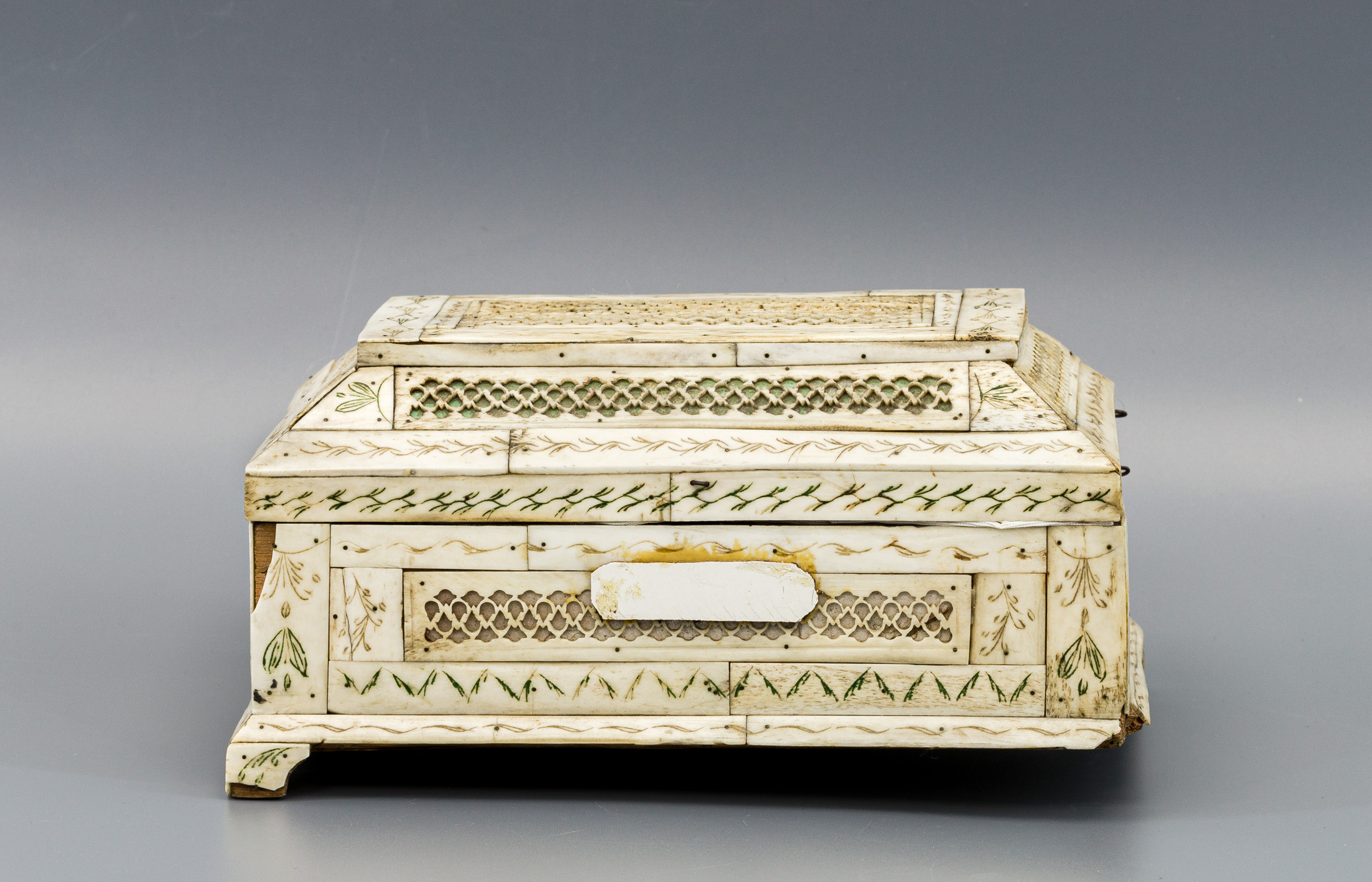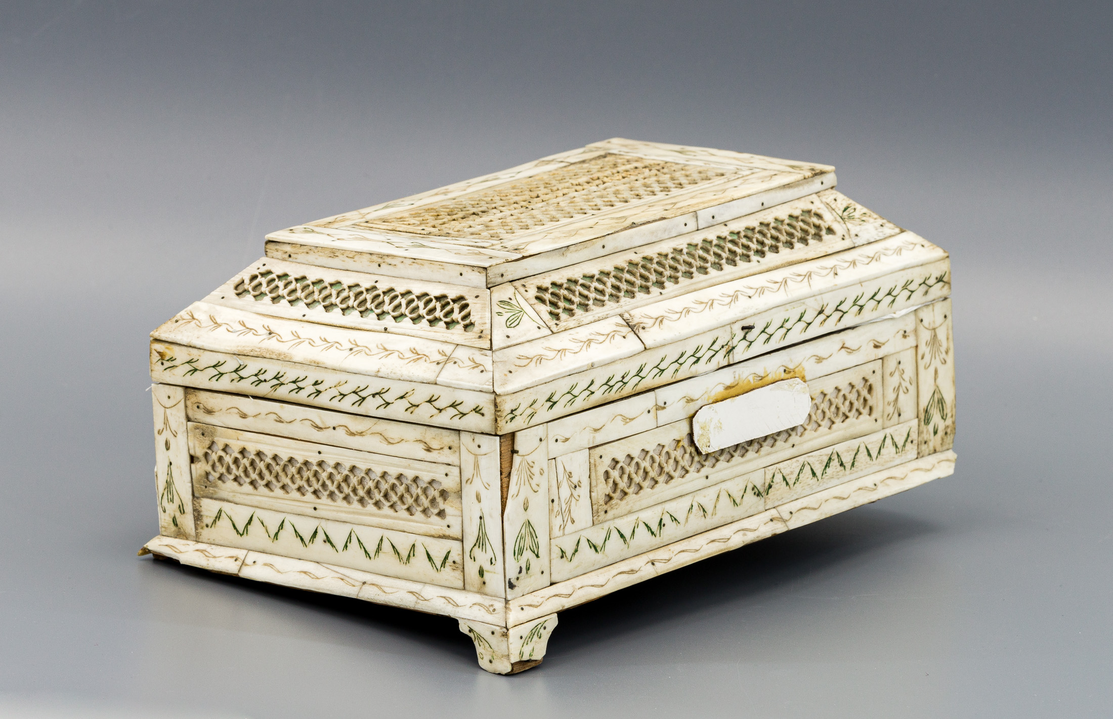 Сохранность: отсутствие двух ножек и крепления к одной петле, сколы, загрязнения, непрофессиональная реставрация, рассыхания.