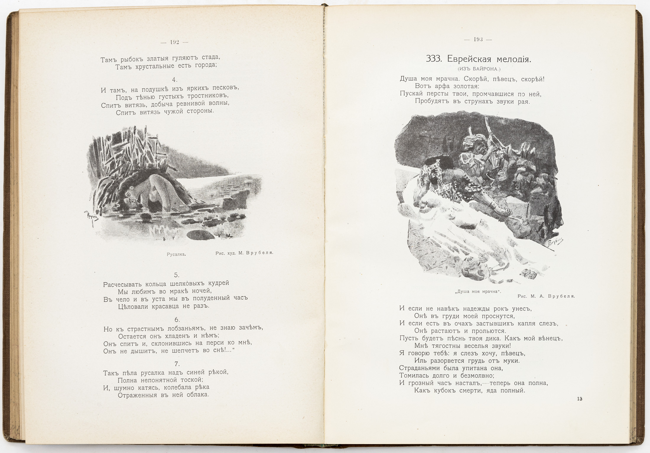 Издание подготовлено к столетнему юбилею со дня рождения М.Ю. Лермонтова; экземпляр в полукожаных переплетах с накладками по рисунку М.А. Врубеля – из меньшей, более дорогой части тиража. В оформлении издания использованы рисунки М.А. Врубеля, М.В. Васнецова, И.К. Айвазовского, И.Е. Репина, В.А. Серова, Д.И. Митрохина, С.П. Яремича, Л.О. Пастернака, К.А. Коровина, Е.Е. Лансере, А.Г. Якимченко, В.Д. Замирайло, князя Г.Г. Гагарина и др.