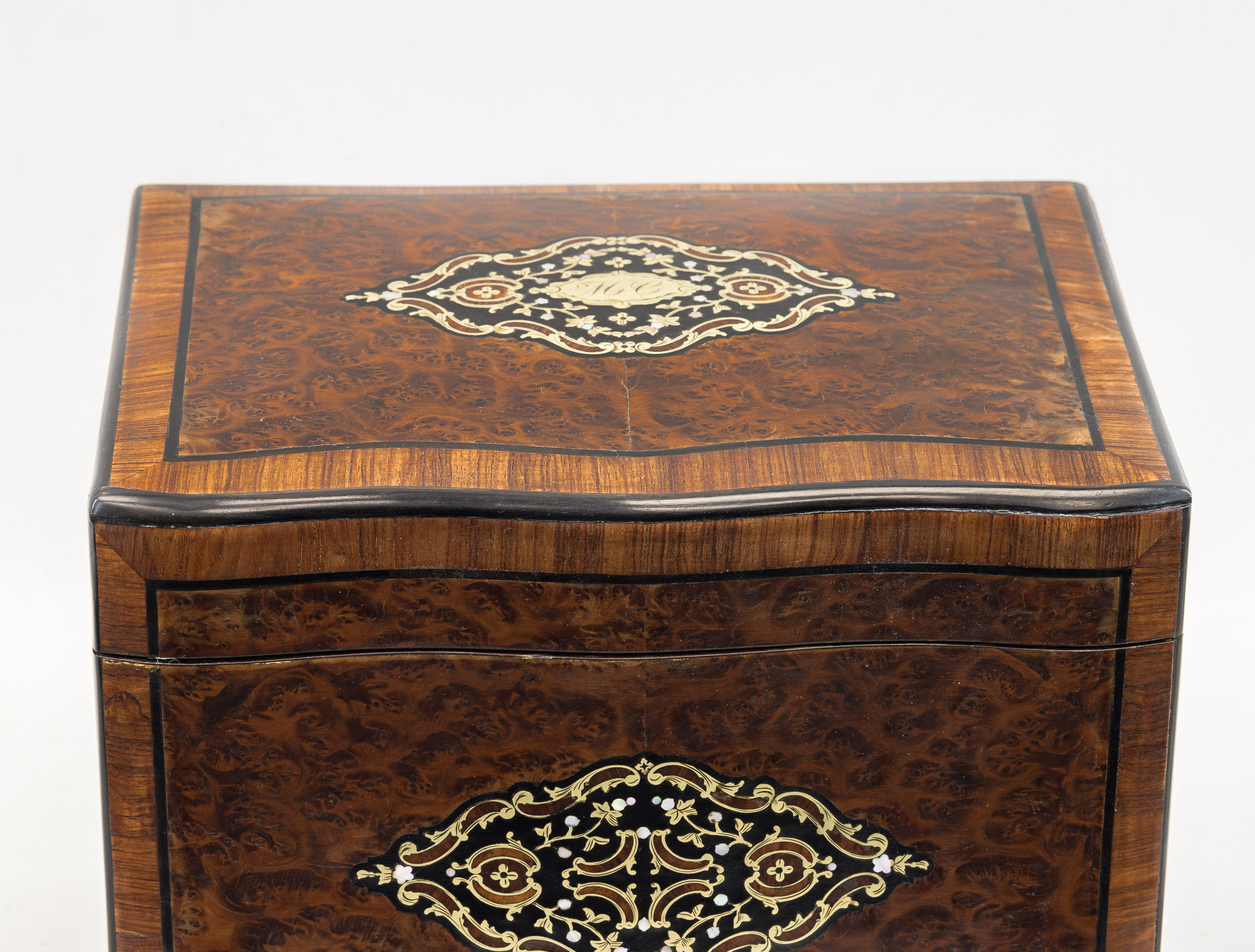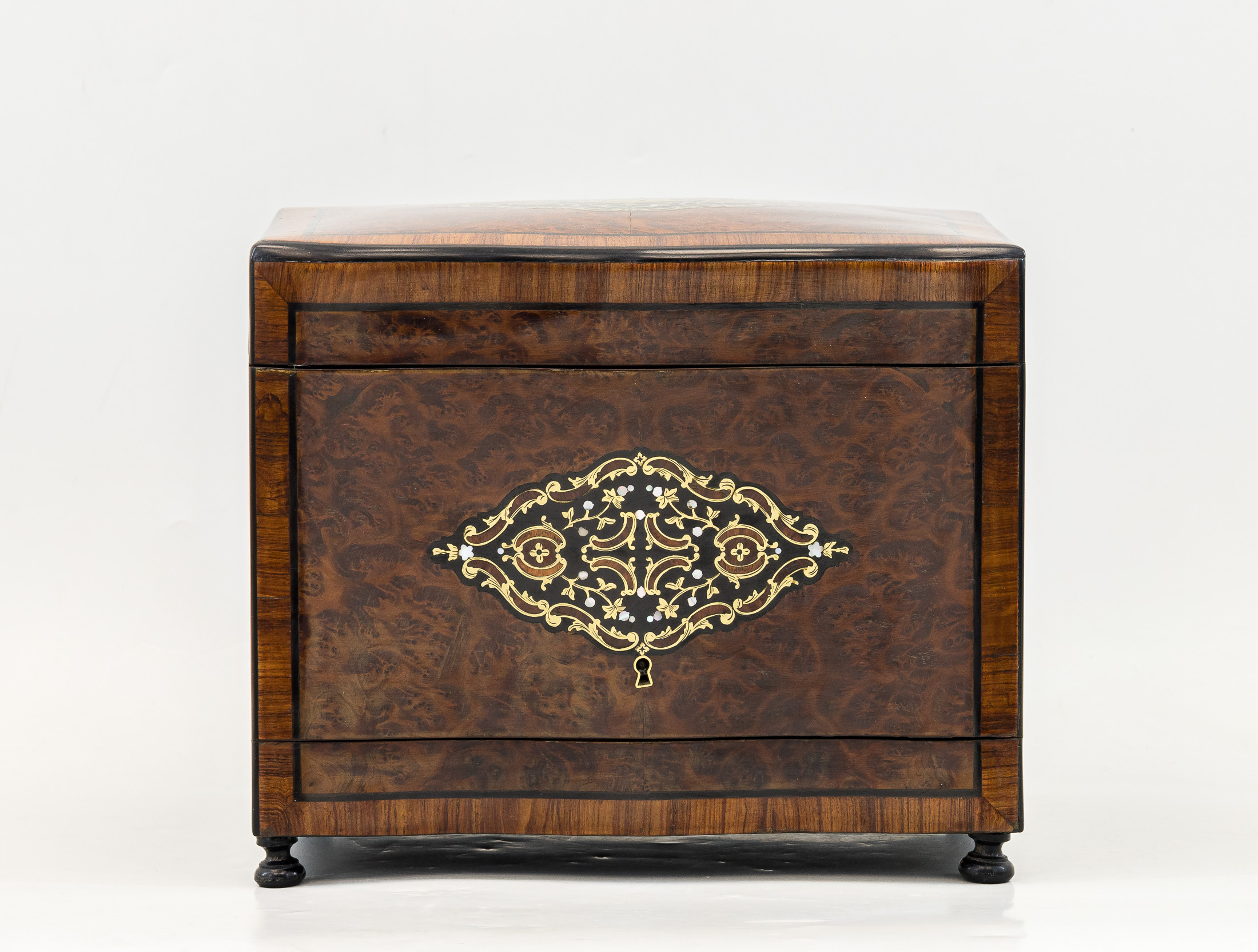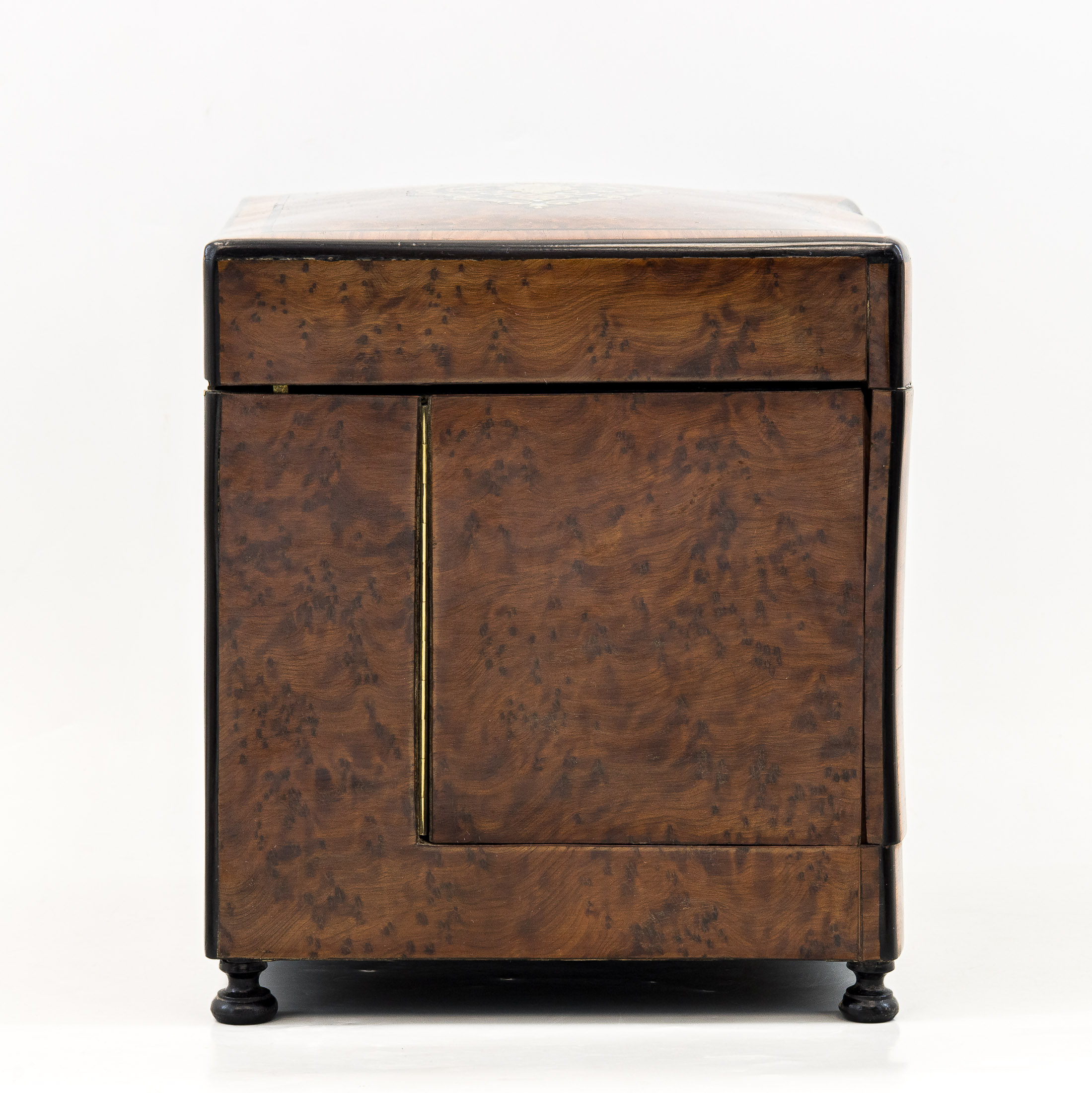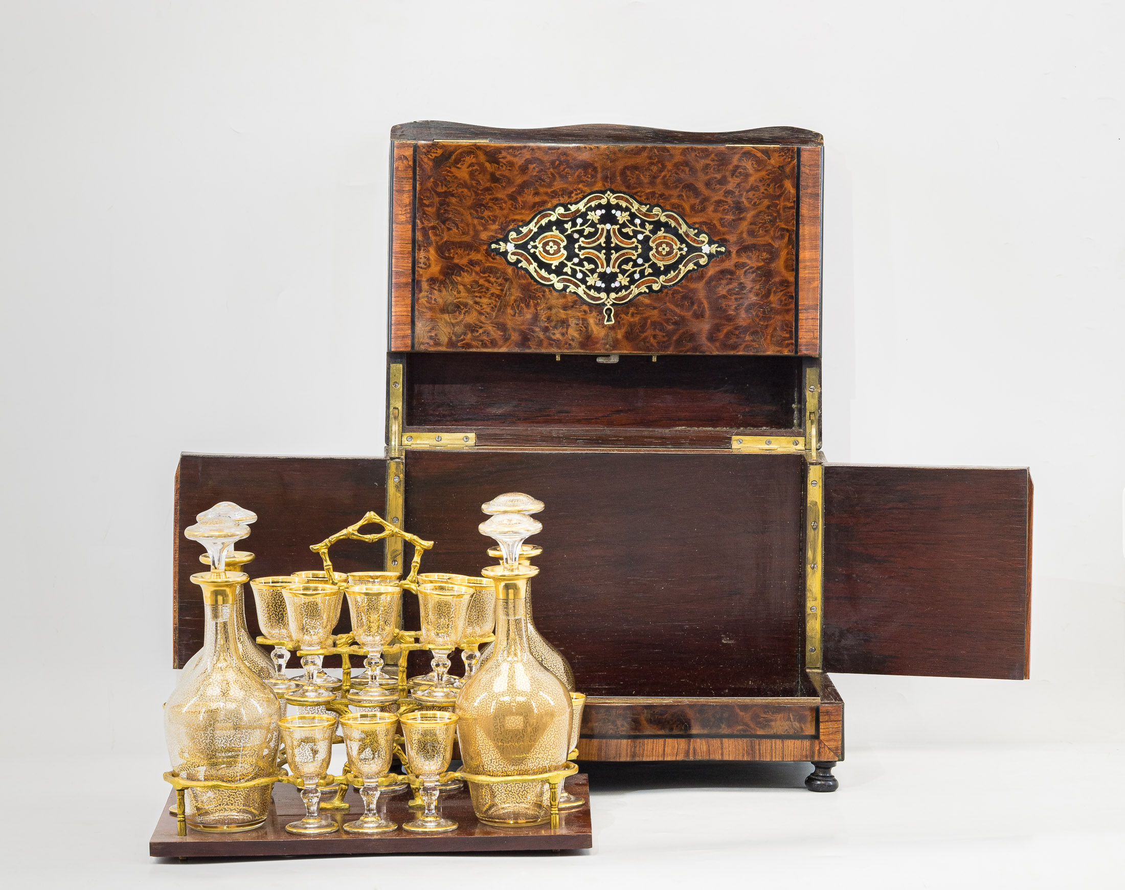 Стекло, золочение; дерево, резьба; шпон из капа и эбенового дерева; маркетри, перламутр; металлическая подставка.