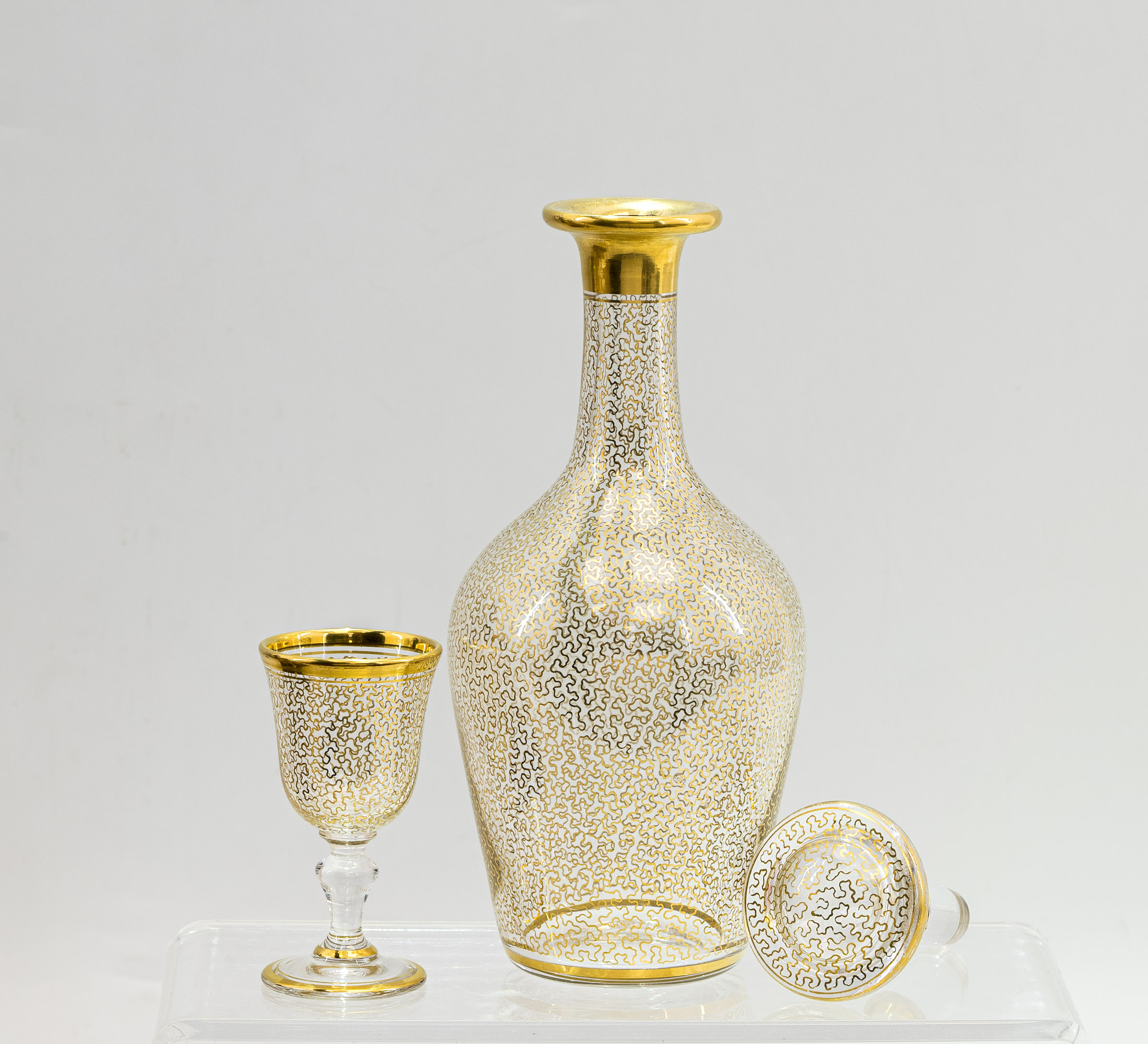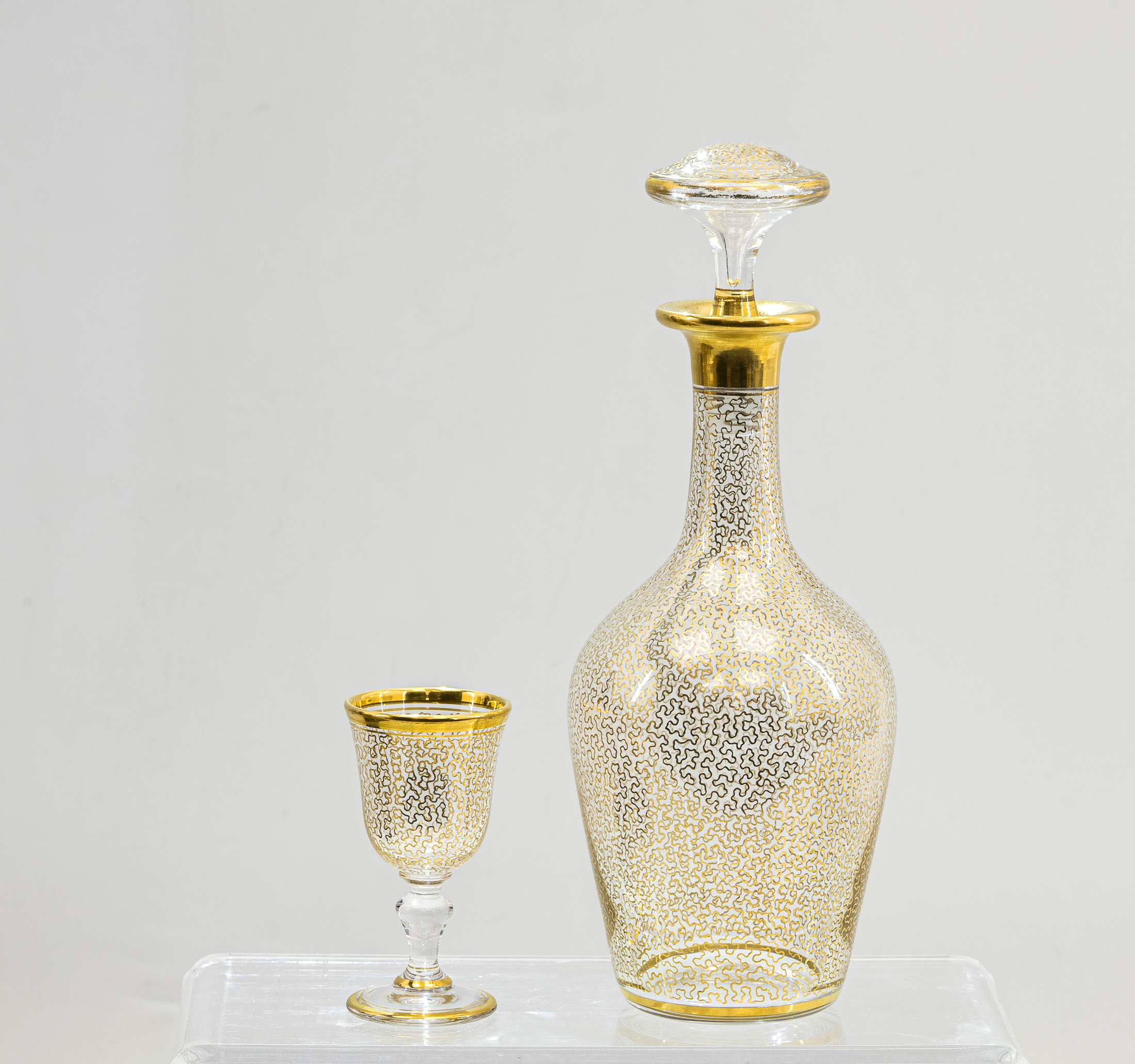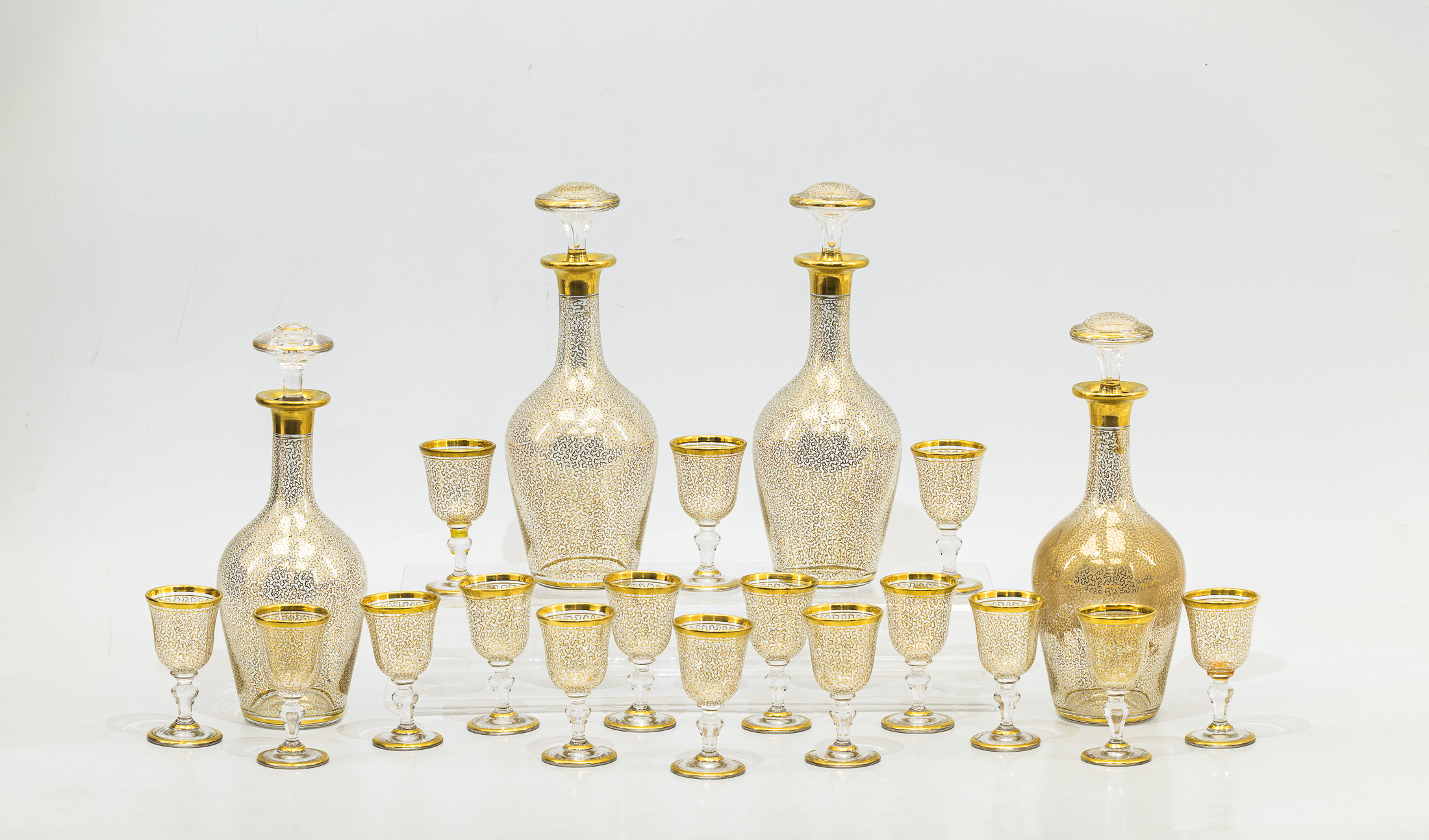 Сохранность хорошая, незначительные дефекты: небольшие трещина и рассыхания в футляре (cave à liqueur); легкие потертости золочения; крышка одного графина в замене; микроскольчик на одной крышке графина со внутренней стороны и на исподе дна 3 рюмок, незначительные царапинки на основании четырёх рюмок.