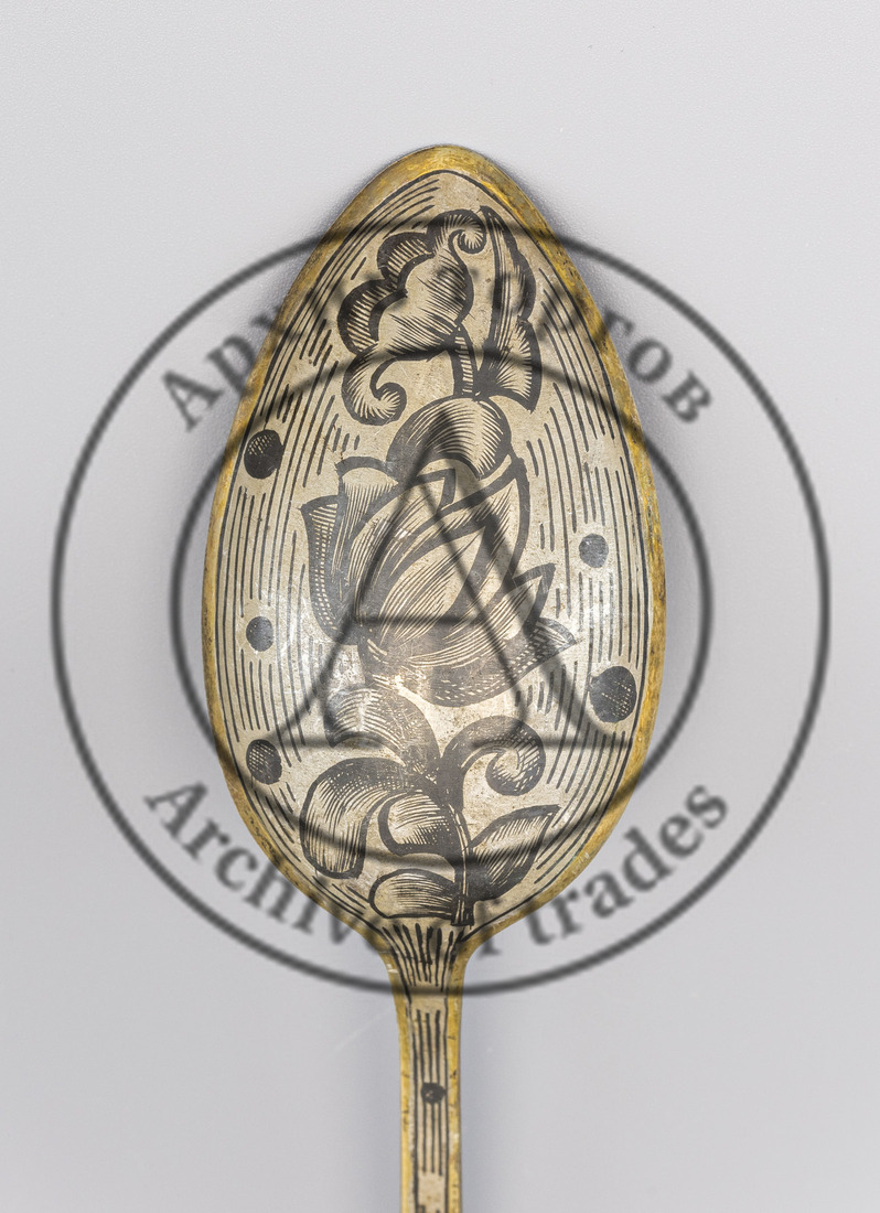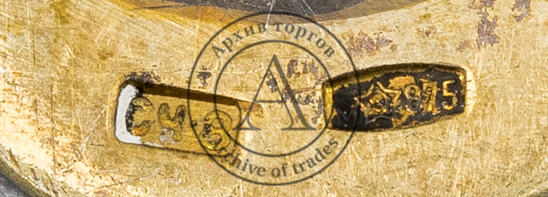 Клейма: 1) 875-й пробы с «серпом и молотом внутри пятиконечной звезды» и шифром московского пробирного управления (литерой «м») в щитке в виде прямоугольника с выпуклыми противоположными сторонами; 2) клеймо изготовителя  с годом выпуска «СЧ·8» в прямоугольном щитке.