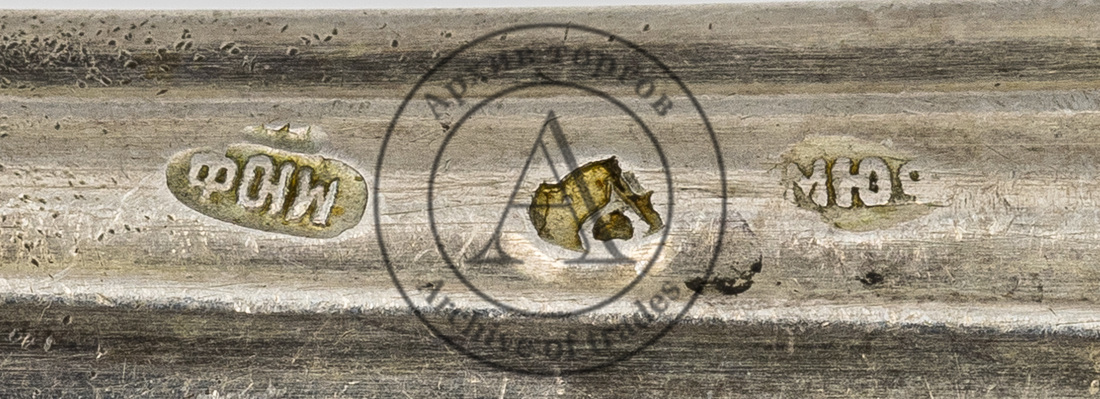 клейма перепробации советского периода: 5) «голова рабочего, повернутая вправо, с молотком, под ним литера «Δ» («дельта») и обозначение пробы «800» в щитке в виде усеченного овала (обозначение заграничного изделия при клеймлении на таможне с указанием пробы, 1927–1954 гг.); 6) МЮФ» в овальном щитке (Московская ювелирная фабрика; 7) «Р.» в фигурном щитке.