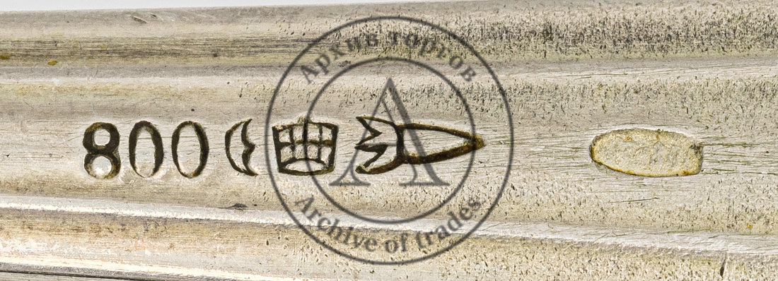 Клейма: 1-2) «800» (обозначение пробы) и «полумесяц и корона» (немецкое клеймо пробы серебра); 3) «факел» (клеймо фирмы «Bremer Silberwaren-Fabrik»;