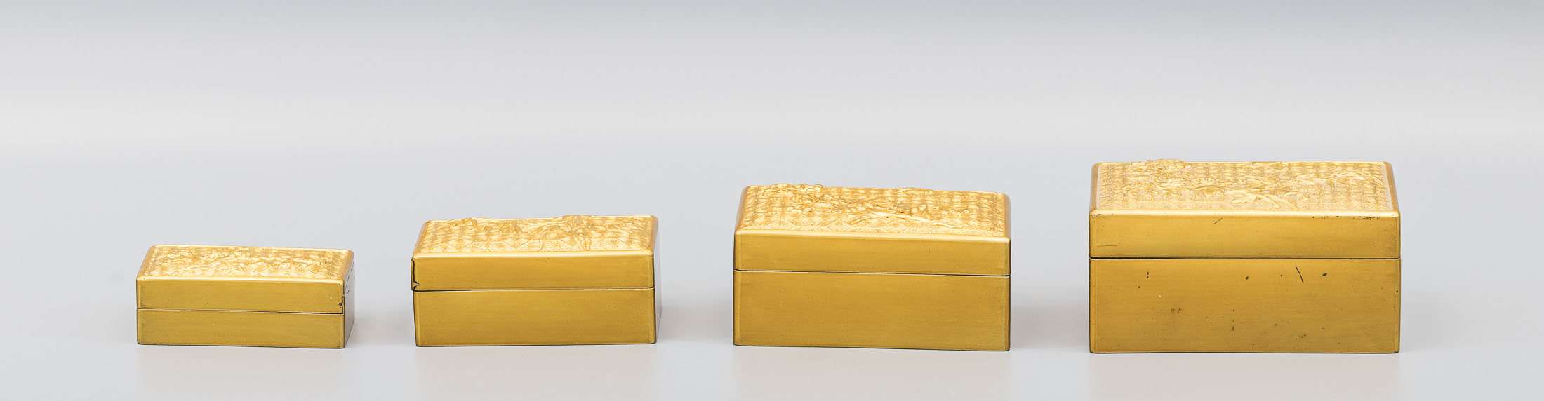 Сохранность: потертости, трещины на крышках двух коробок и в углу одной коробки, незначительные сколы на внутренних сторонах.