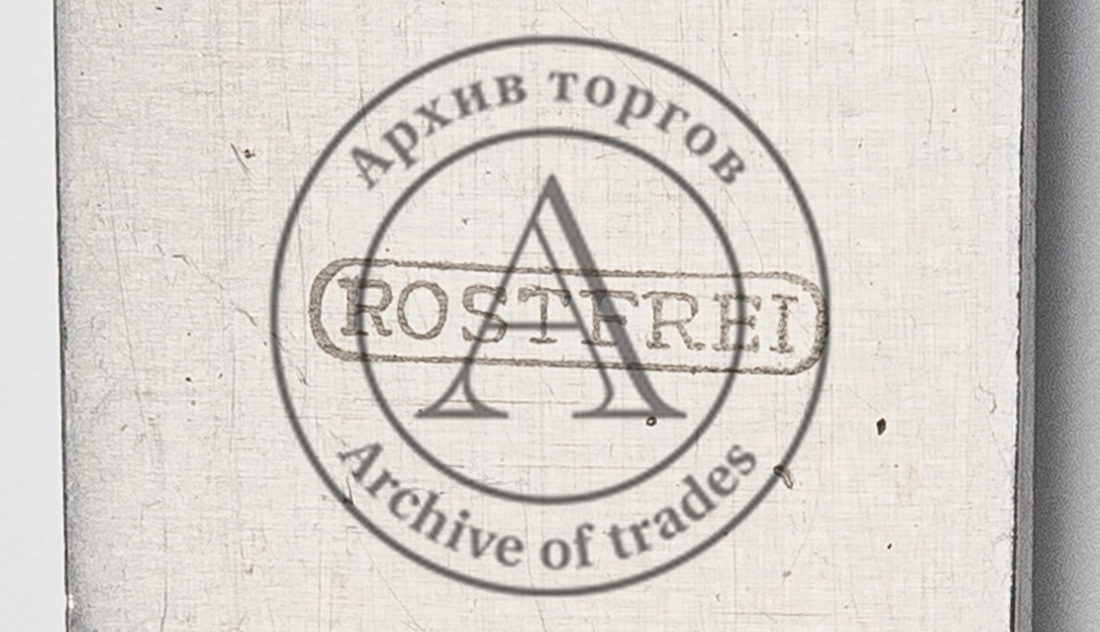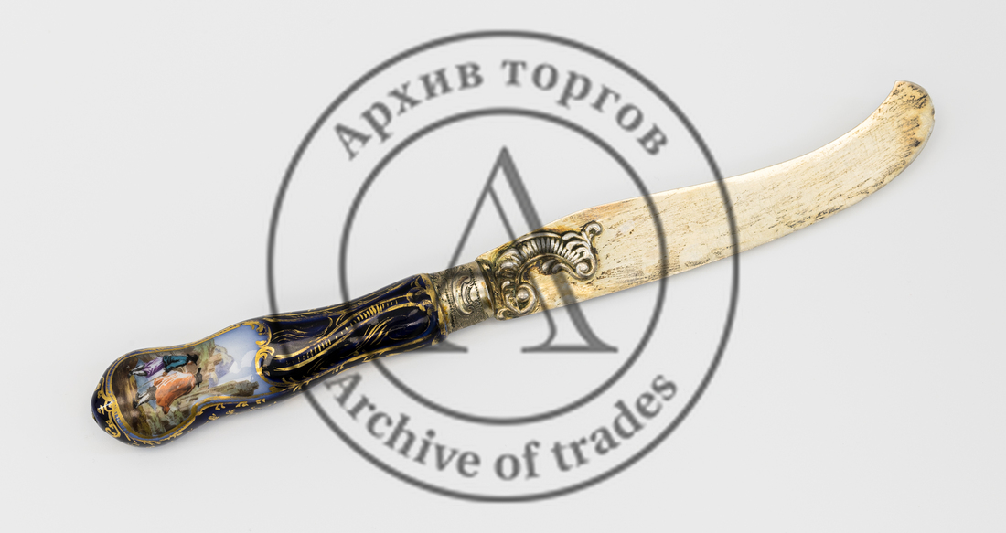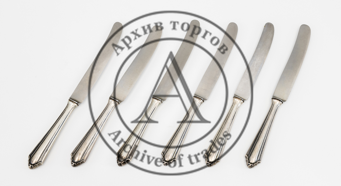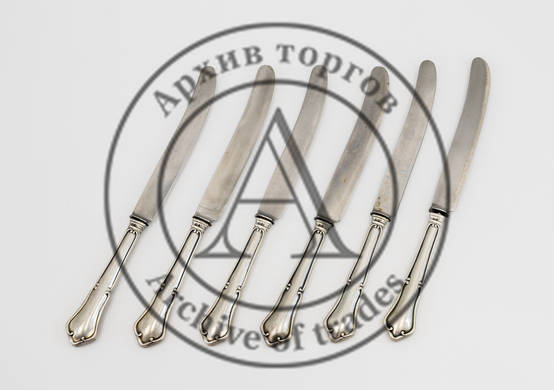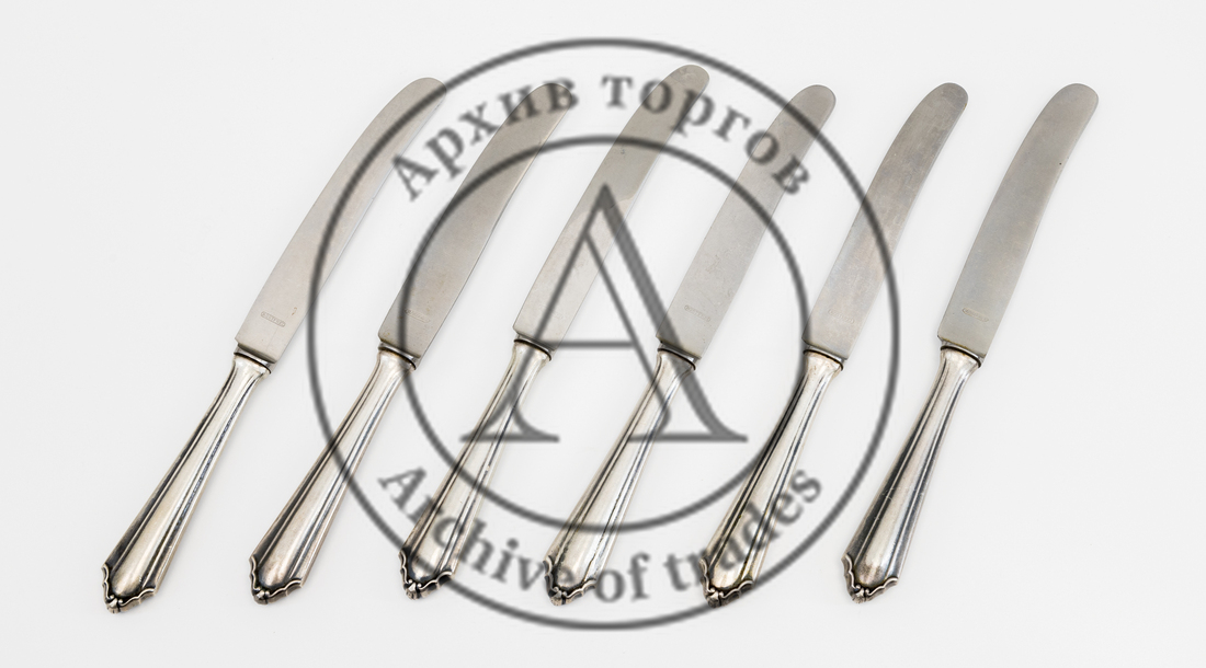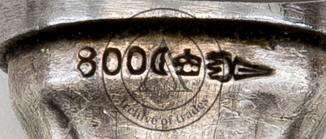 Клейма: 1-2) «800» и «полумесяц и корона» (немецкое клеймо пробы серебра); 3) «факел» (клеймо фирмы «Bremer Silberwaren-Fabrik»; 4) на лезвии клеймо «ROSTFREI» в овальном щитке (нержавеющая сталь).