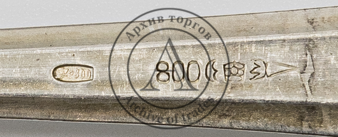 Клейма: 1-2) «800» (обозначение пробы) и «полумесяц и корона» (немецкое клеймо пробы серебра); 3) «факел» (клеймо фирмы «Bremer Silberwaren-Fabrik»);