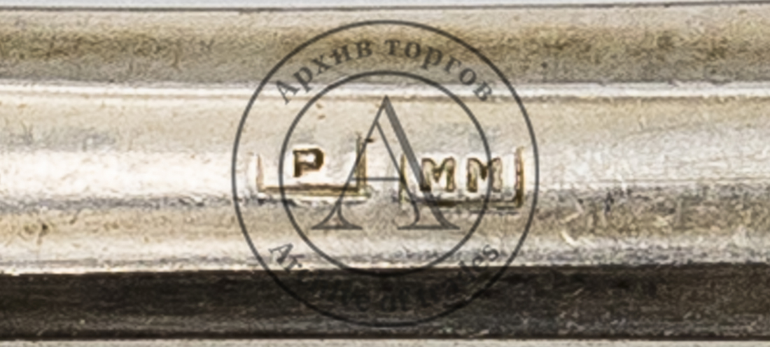 клейма перепробации советского периода: 4) «голова рабочего, повернутая вправо, с молотком, под ним литера «Δ» («дельта») и обозначение пробы «800» в щитке в виде усеченного овала (обозначение заграничного изделия при клеймлении на таможне с указанием пробы, 1927–1954 гг.); 5) «Р» в прямоугольном щитке; 6) «ММ» в прямоугольном щитке.