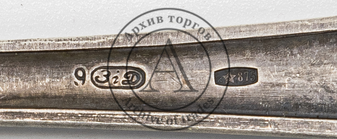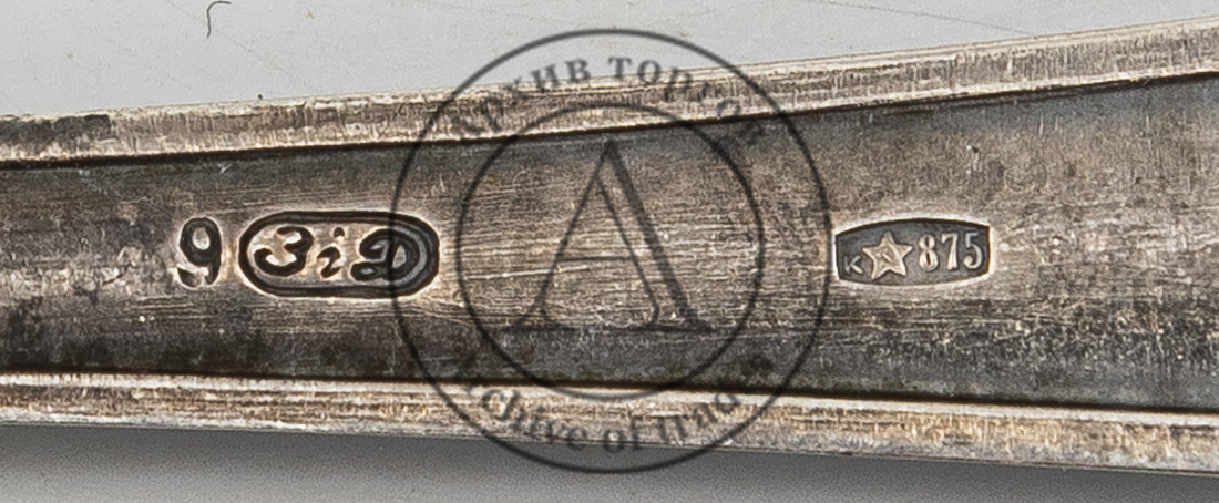 Клейма: 1) 875-й пробы с «серпом и молотом внутри пятиконечной звезды» и шифром Киевской инспекции пробирного надзора (литерой «к») в щитке в виде прямоугольника с выпуклыми противоположными сторонами (1958–1991 гг.); 2) клеймо завода с датой производства «9ЗiД», где «ЗiД» в овальном щитке.