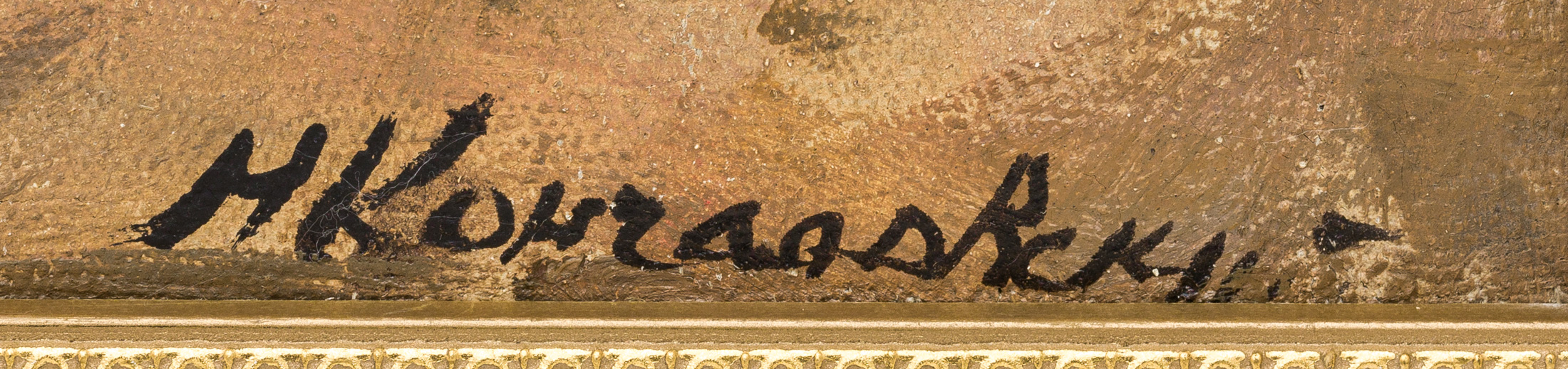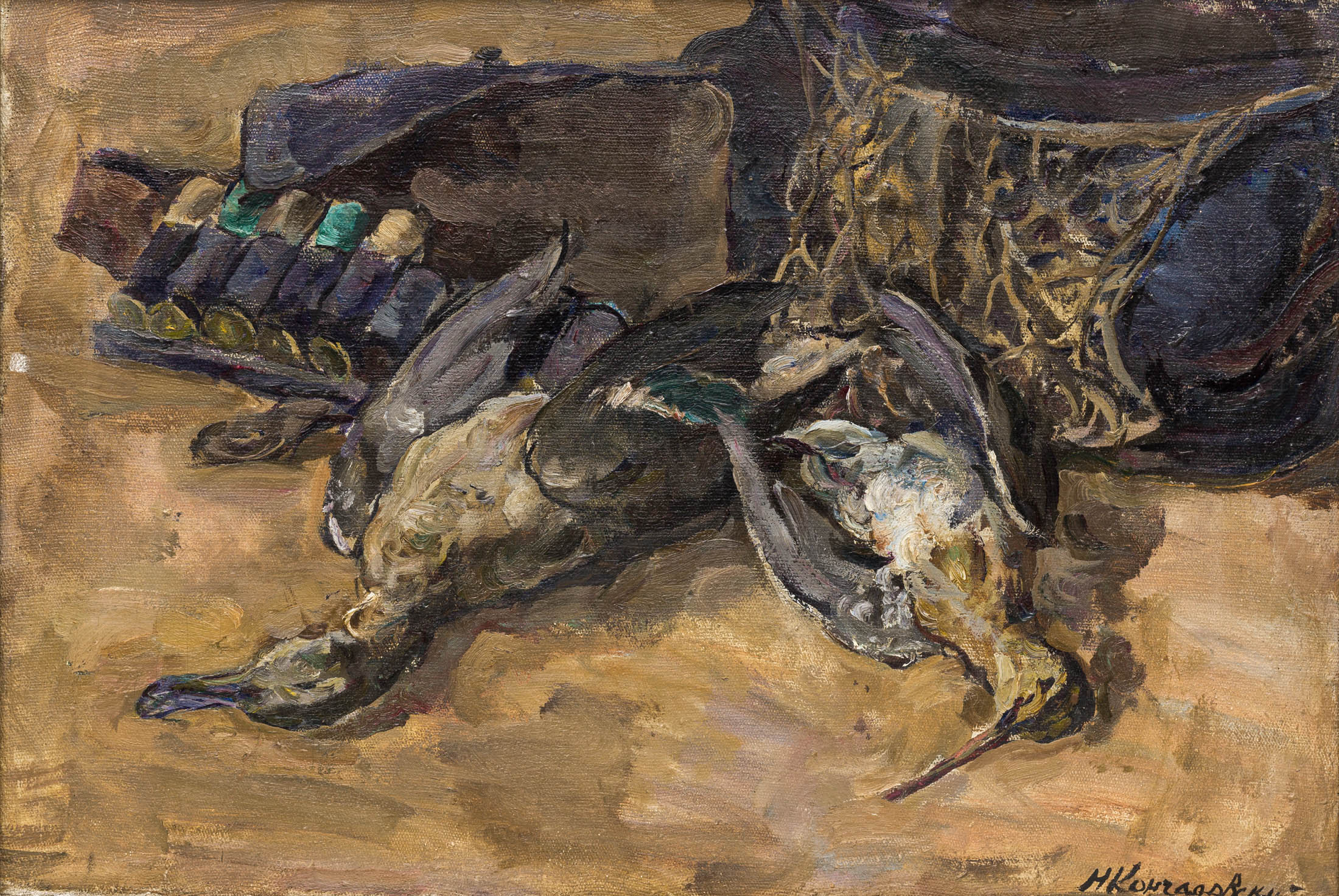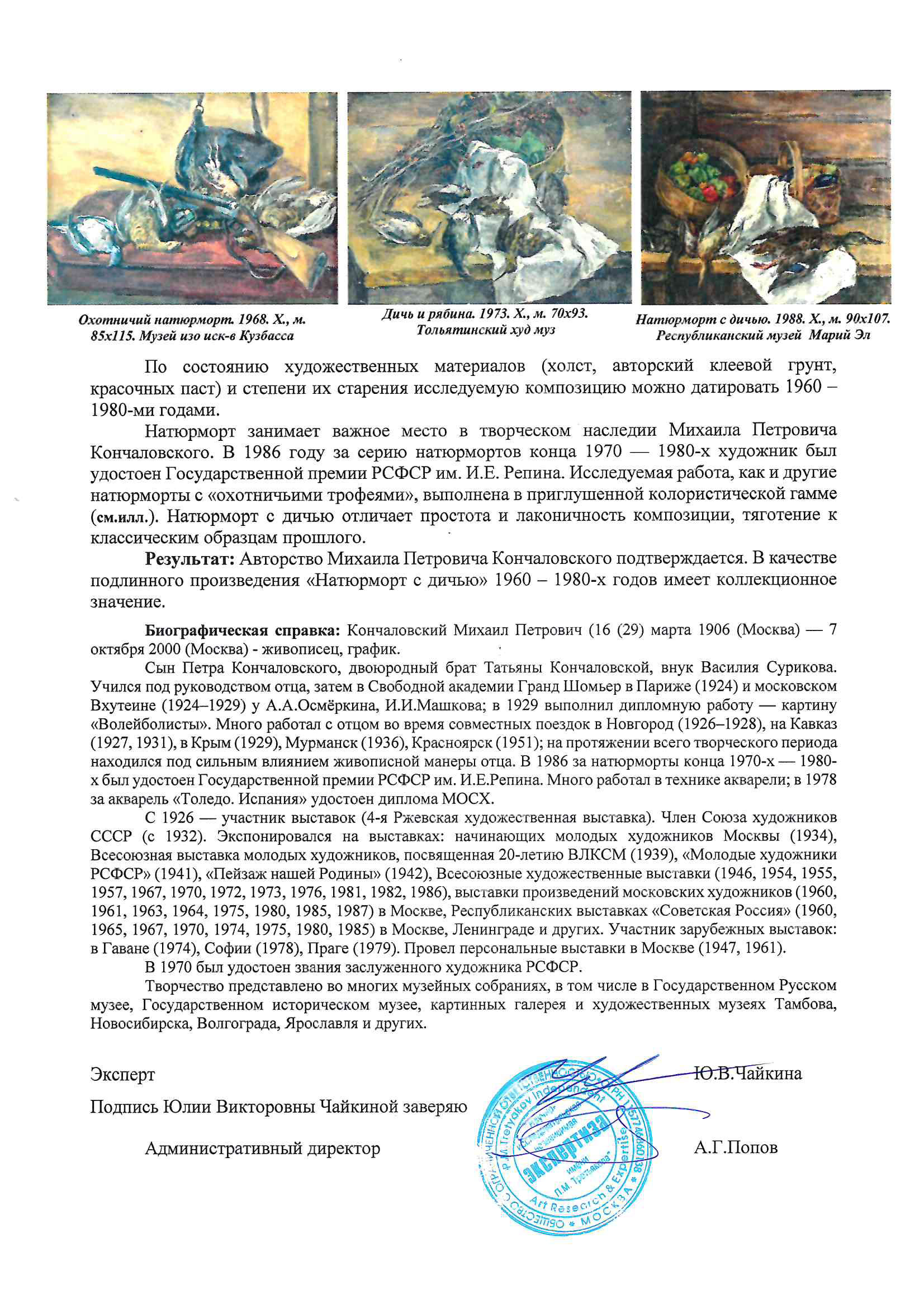 Кончаловский Михаил Петрович (1906–2000) - Сын П.П. Кончаловского. Живописец и график. Преимущественно писал натюрморты и пейзажи. Первые этюды маслом были созданы в 1924 г. в Венеции во время заграничного путешествия с отцом. Во время этой поездки посещал занятия в Свободной академии «Гранд Шомьер» в Париже. В 1924-1930-х гг. учился во ВХУТЕИНе в мастерских А.А. Осмеркина, И.И. Машкова. Много работал с отцом во время совместных поездок в Новгород (1926-1928), на Кавказ (1927,1931), в Крым (1929), Мурманск (1936), Красноярск (1951). Персональные выставки М.П. Кончаловского проходили в 1947 и 1961 гг.