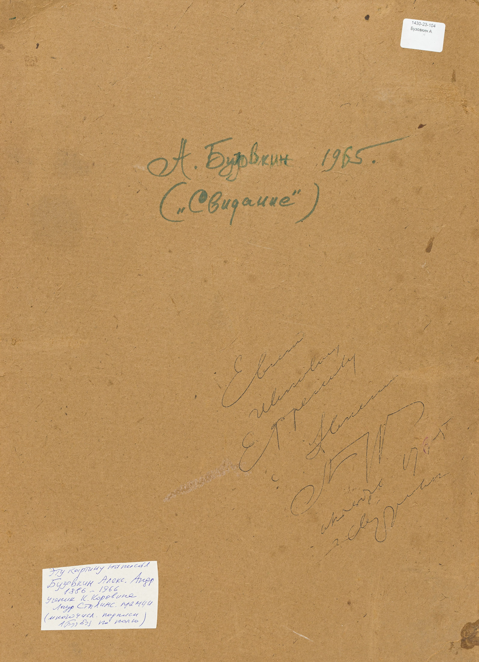 Бузовкин Александр Андреевич (1886-1966) - русский, советский художник, лауреат Сталинской премии. Родился в 1866 году в Тульской губернии. В 1906 году перехал из Тулы в Москву. В 1907 году поступил в Московское Училище живописи, ваяния и зодчества, которое закончил в 1913 году. Его непосредственными педагогами были А.Е. Абрамов, Н.А. Касаткин и К.А. Коровин.