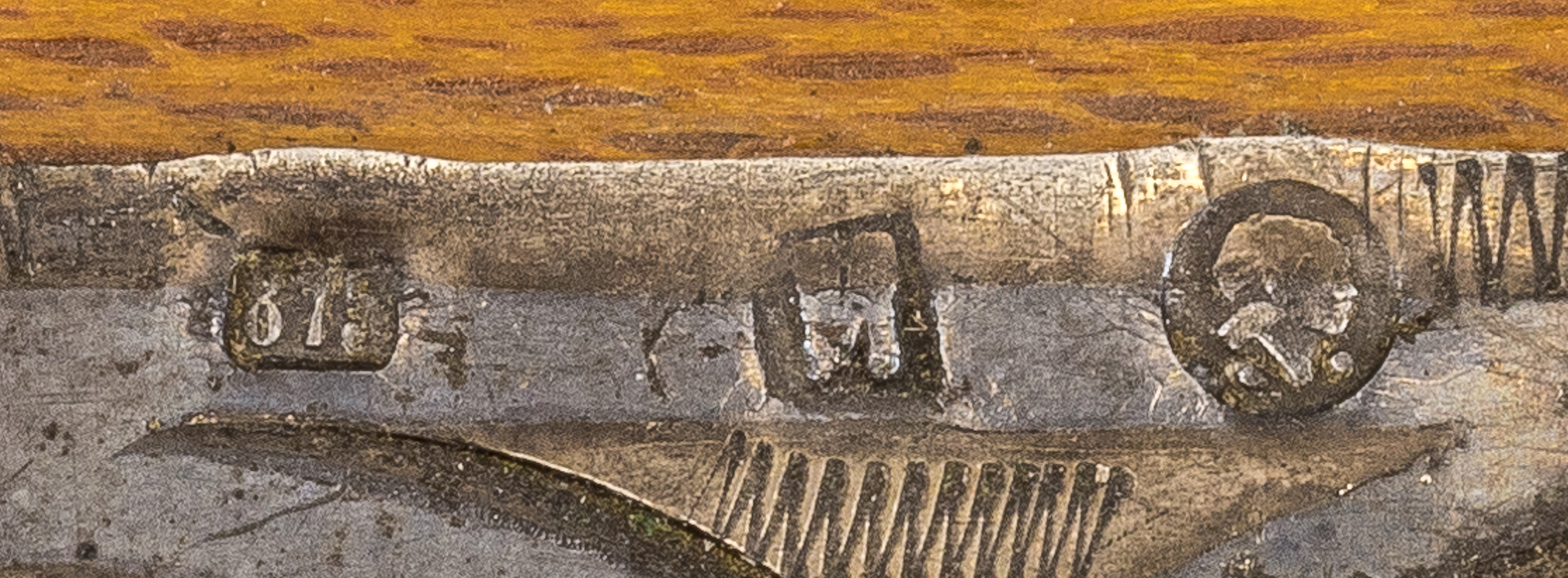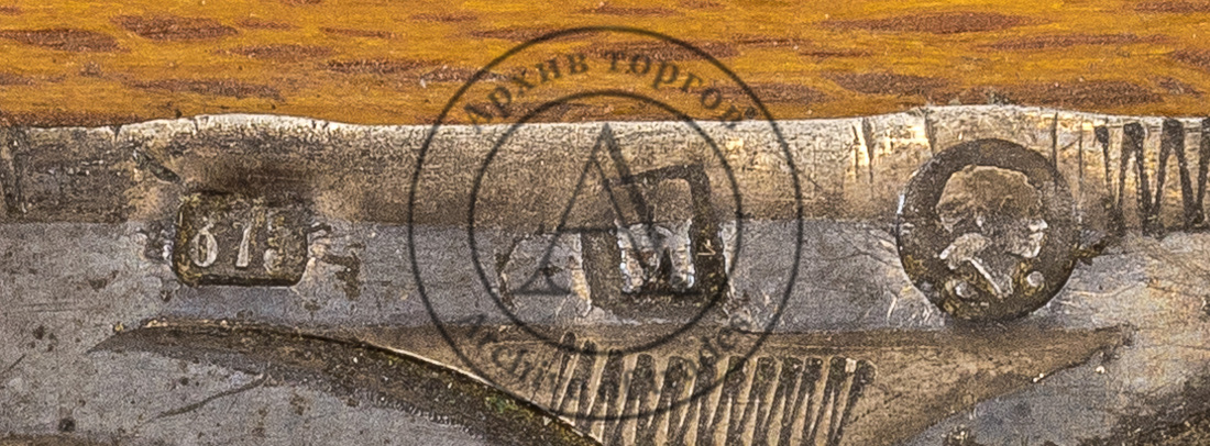 Клейма на накладке: 1) «875» в прямоугольном щитке; 2) «М» в прямоугольном щитке; 3) голова рабочего, обращенная вправо, с молотом и двумя точками слева и справа снизу от него (киевского окружного пробирного управления, 1927–1946 гг.).