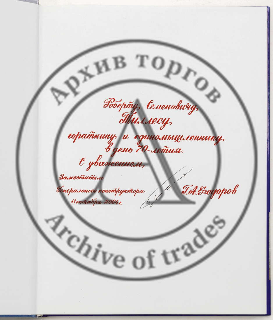 На форзаце дарственная надпись: «Роберту Семеновичу Тиллесу соратнику и единомышленнику в день 70-летия. С уважением, Заместитель Генерального конструктора Г.А. Федоров 11 октября 2004 г.».