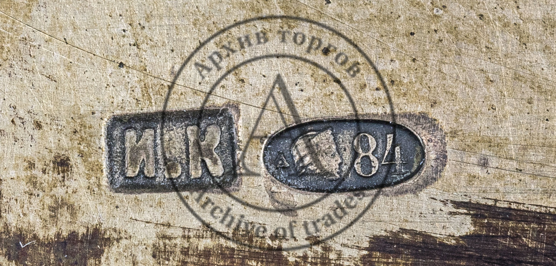 Клейма: 1) в овальном щитке «женская голова в кокошнике, обращенная вправо» с шифром московского пробирного округа («Δ», дельта) и обозначением пробы «84»; 2) именник «И.К» в прямоугольном щитке.