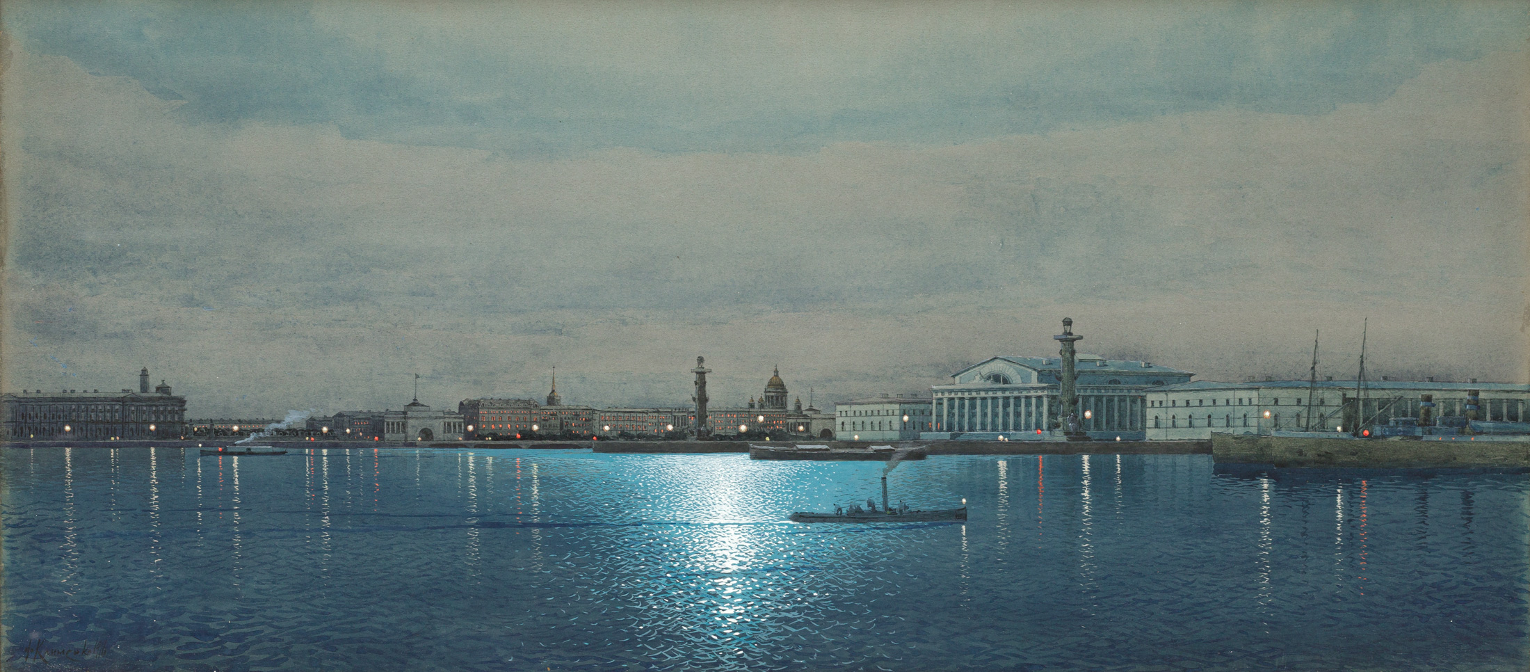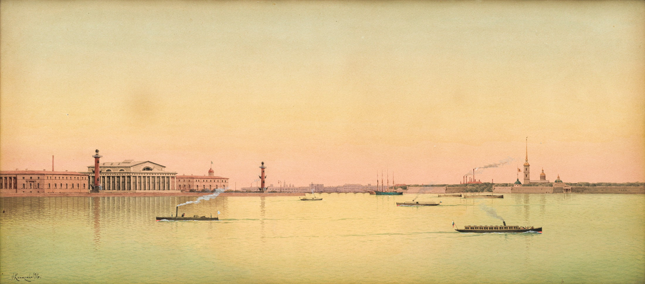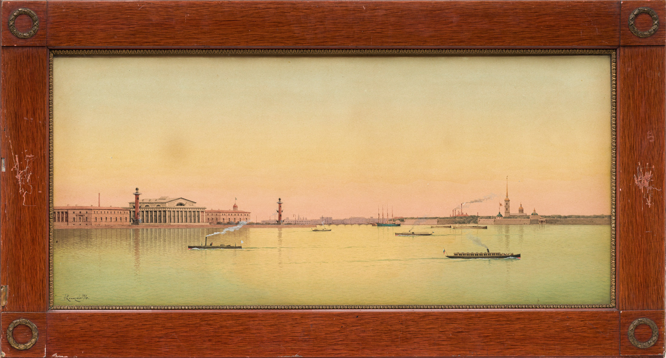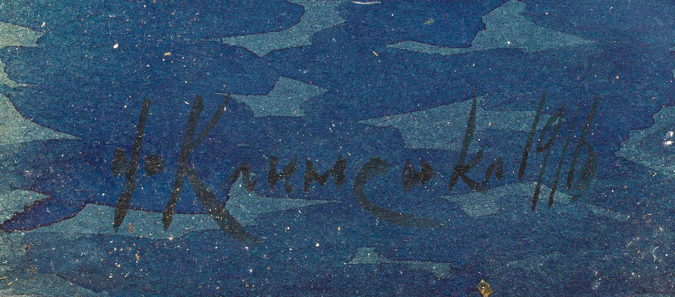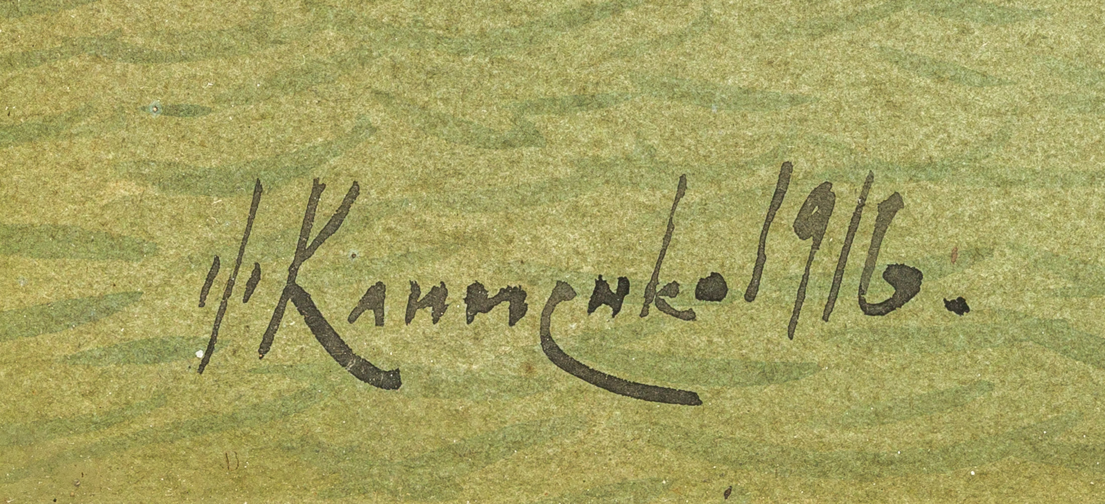 Россия, 1916 год. Картон, акварель, белила. 50 Х 90 см (каждая); размер в раме: 57 Х 106 см. Подпись и дата слева внизу на каждой. В рамах, под стеклом