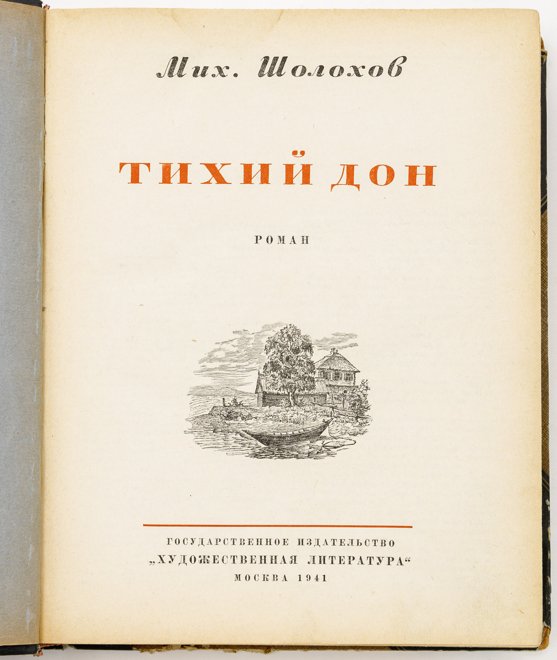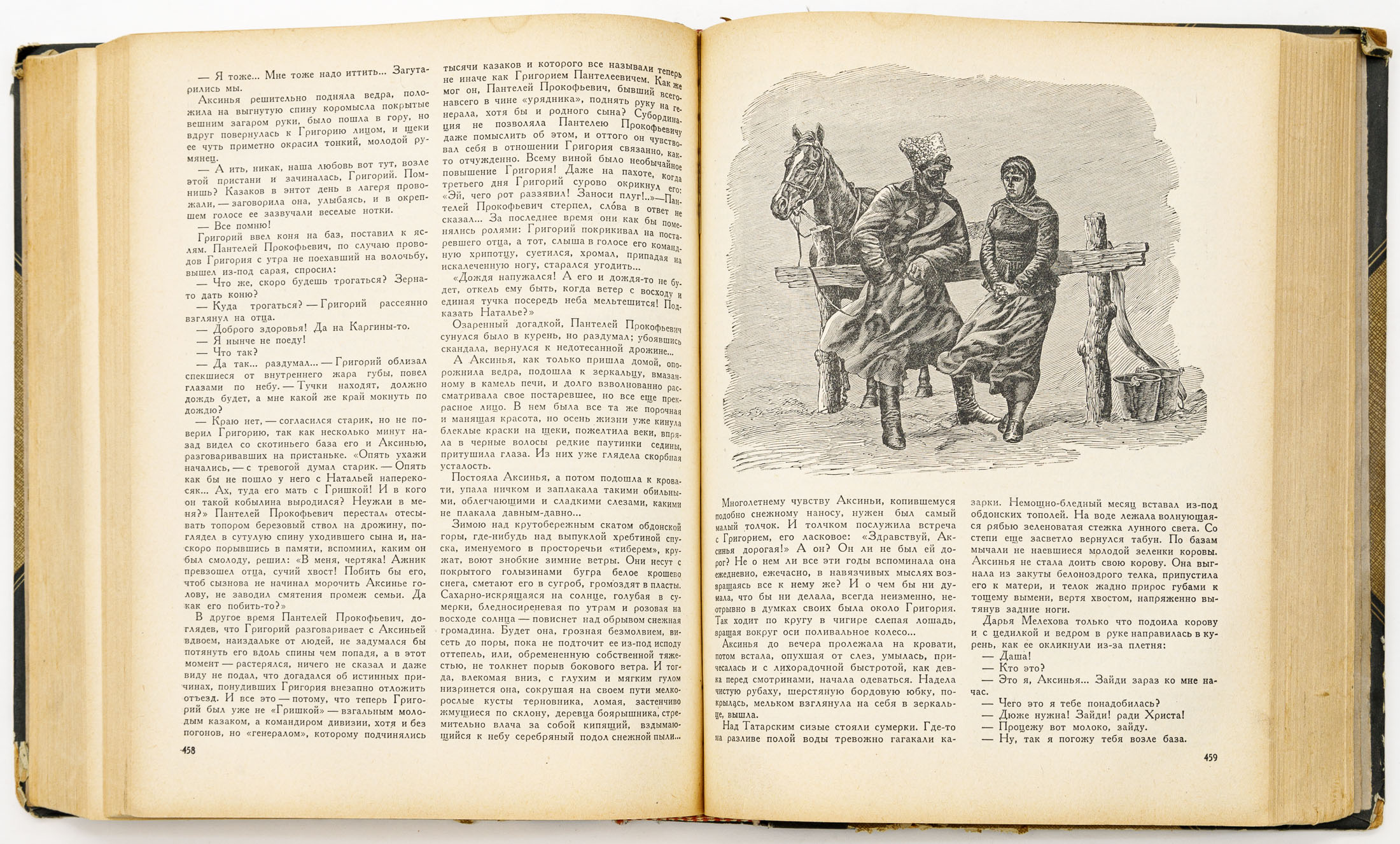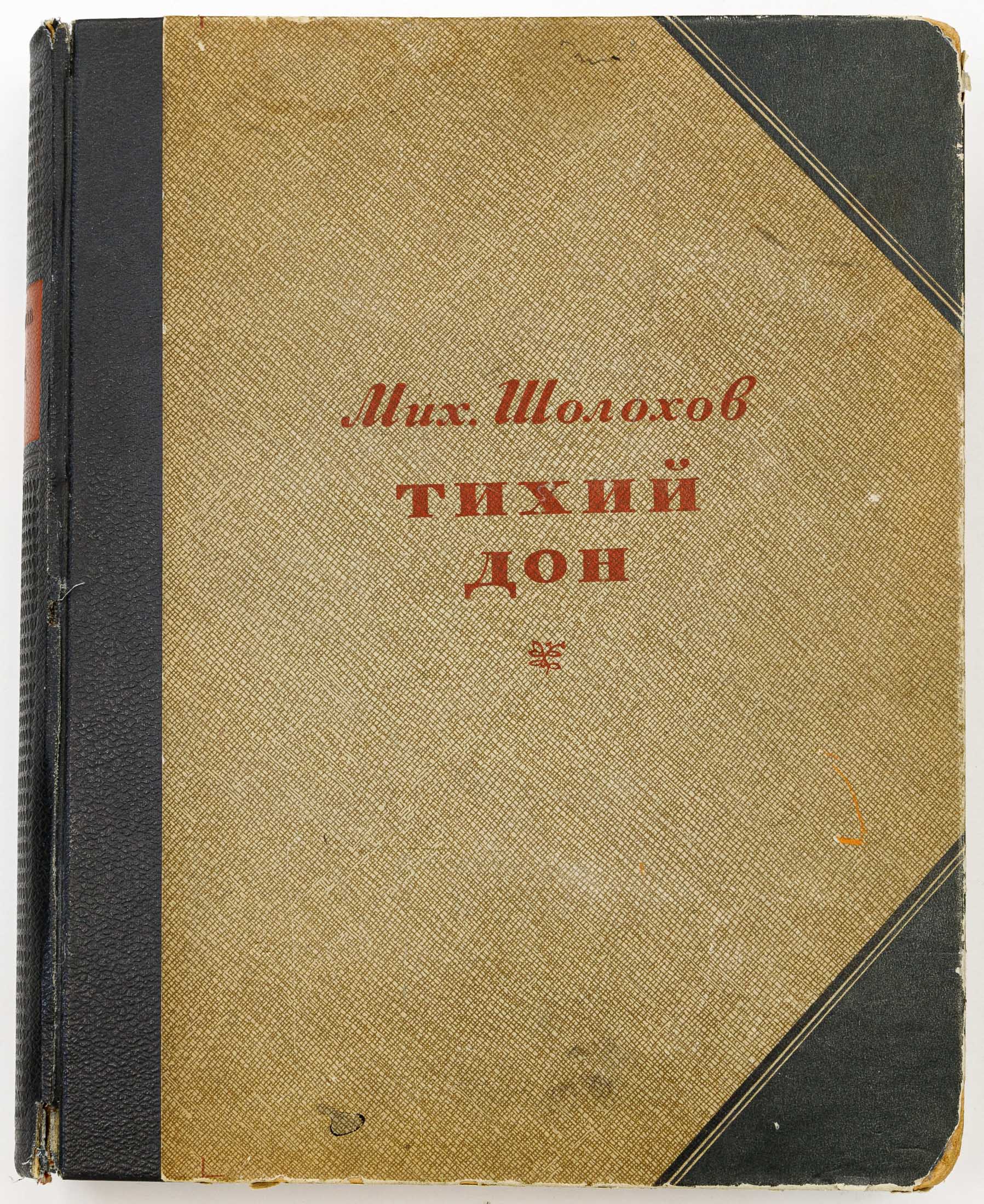 Первое полное издание романа «Тихий Дон» с гравюрами по рисункам С.Г. Королькова. Сергей Григорьевич Корольков (1905-1967) – русский скульптор и художник, вместе с Е.В. Вучетичем принимал участие в оформлении Драматического театра в Ростове-на-Дону, гостиницы «Ростов» и фонтана «Богатырь». Во время немецкой оккупации входил в состав Донского правительства, после отступления немцев бежал в Германию, впоследствии переехал в США. Иллюстрации Королькова к «Тихому Дону» публиковались в изданиях отдельных глав в 1930-е гг. и в первом полном издании 1941 г., впоследствии в советские годы не переиздавались.