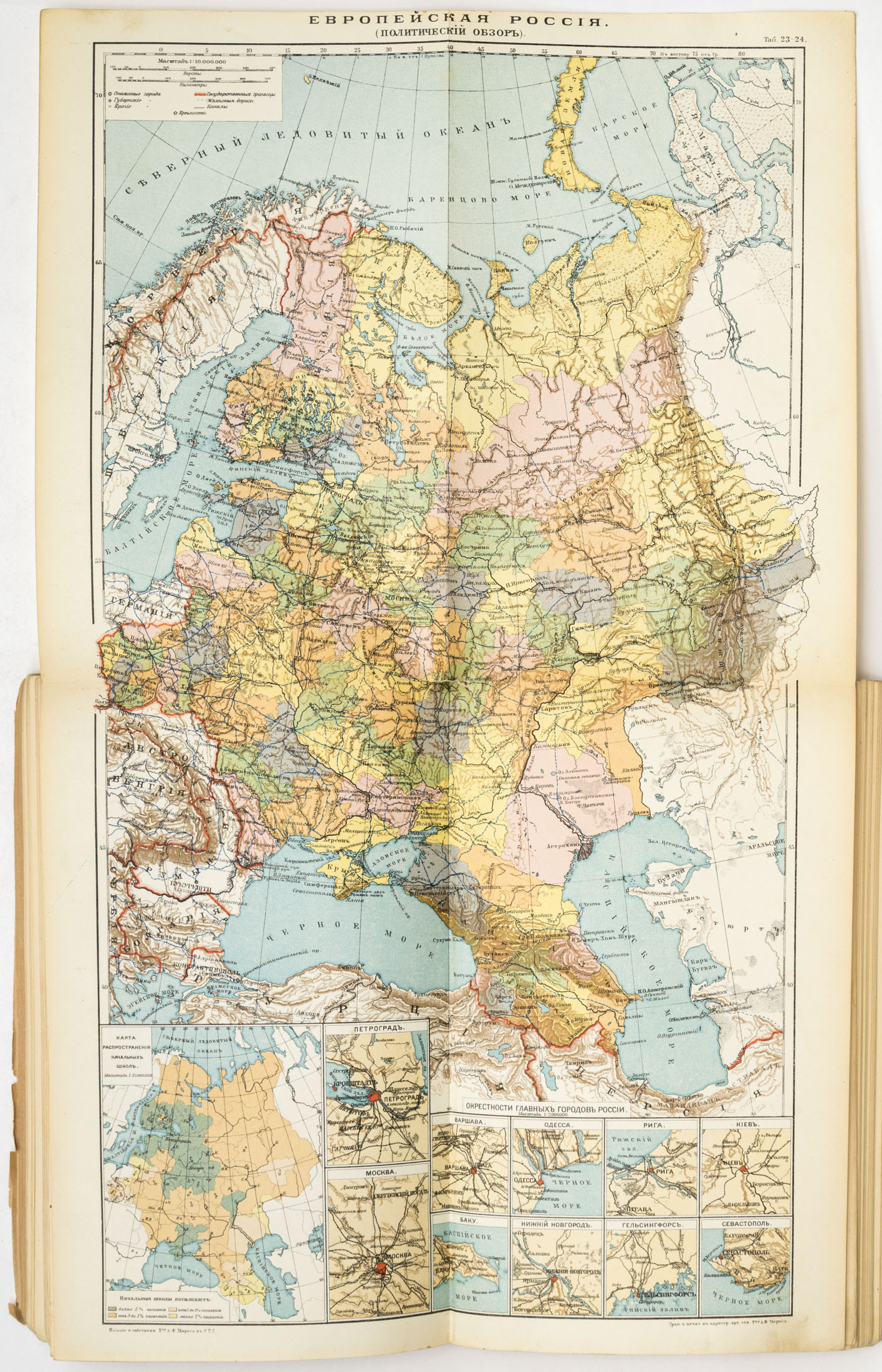 Сохранность: потертости переплета; утрата небольшого фрагмента оборотной обложки; титульный лист проклеен бумагой; пометки на лицевой обложке; на титульном листе и некоторых листах в блоке штампы несуществующей библиотеки; на пустых листах в блоке наклеены три газетные вырезки 1939 г.