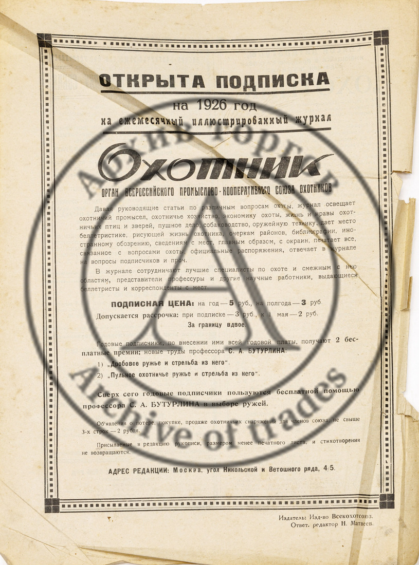 Приложена рекламная листовка подписки на журнал «Охотник» на 1926 г. (1 л.). Замины; надрывы по краям.
