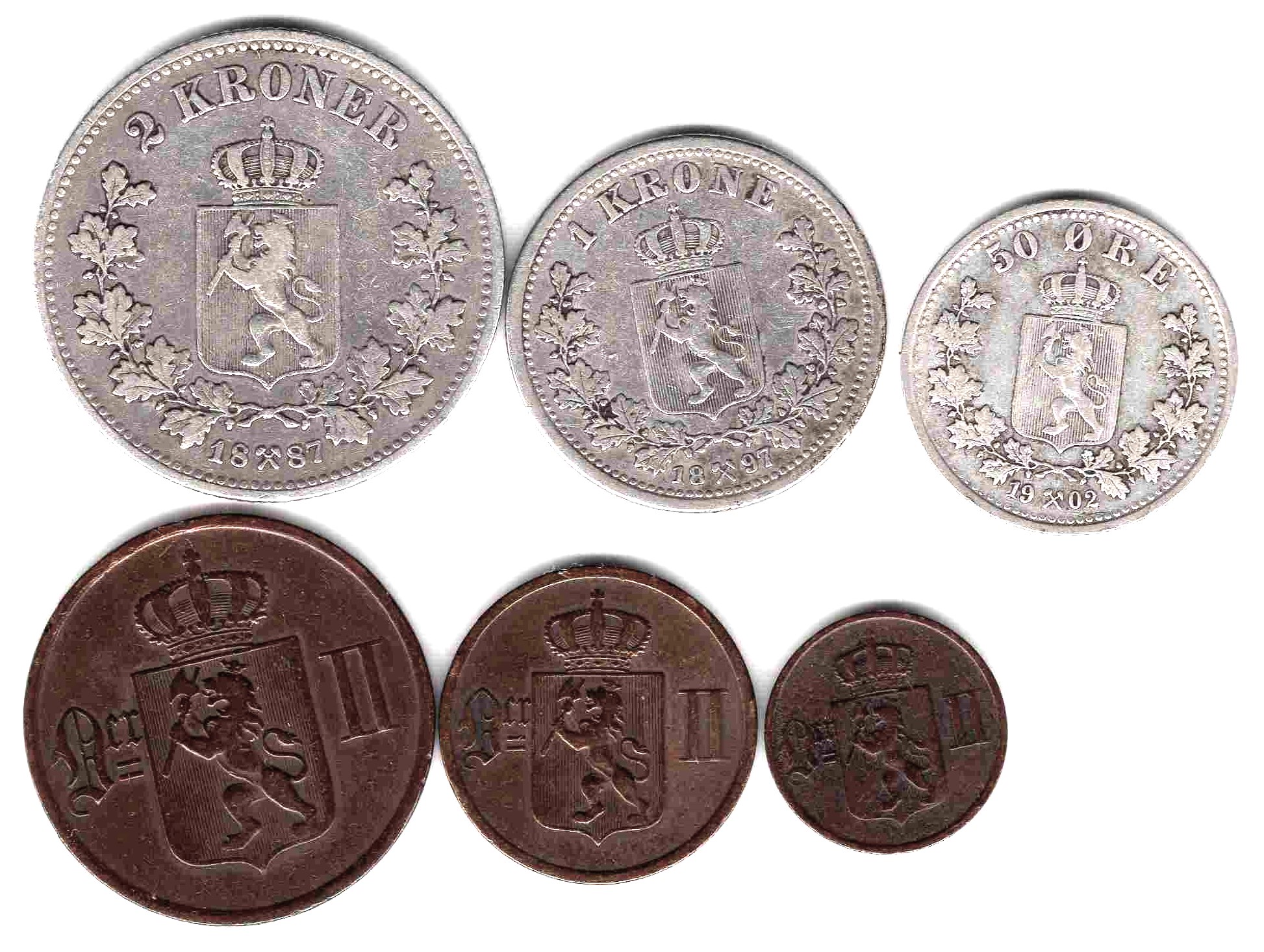 Очень интересная подборка норвежских монет, выпушенных до обретения Норвегией независимости в 1905 году. Монеты выпускались от имени норвежского короля Оскара II мизерными тиражами. В частности, тираж монеты номиналом 2 кроны составил в 1887 году 5000 штук. Медные монеты также редки в отличном состоянии.