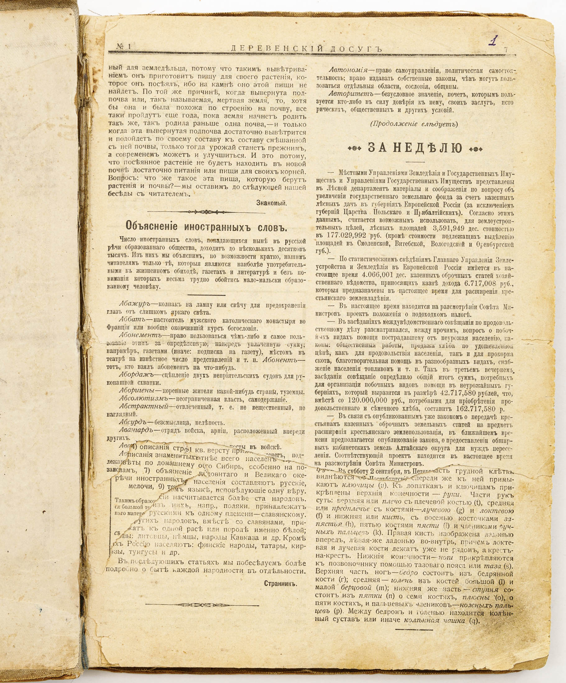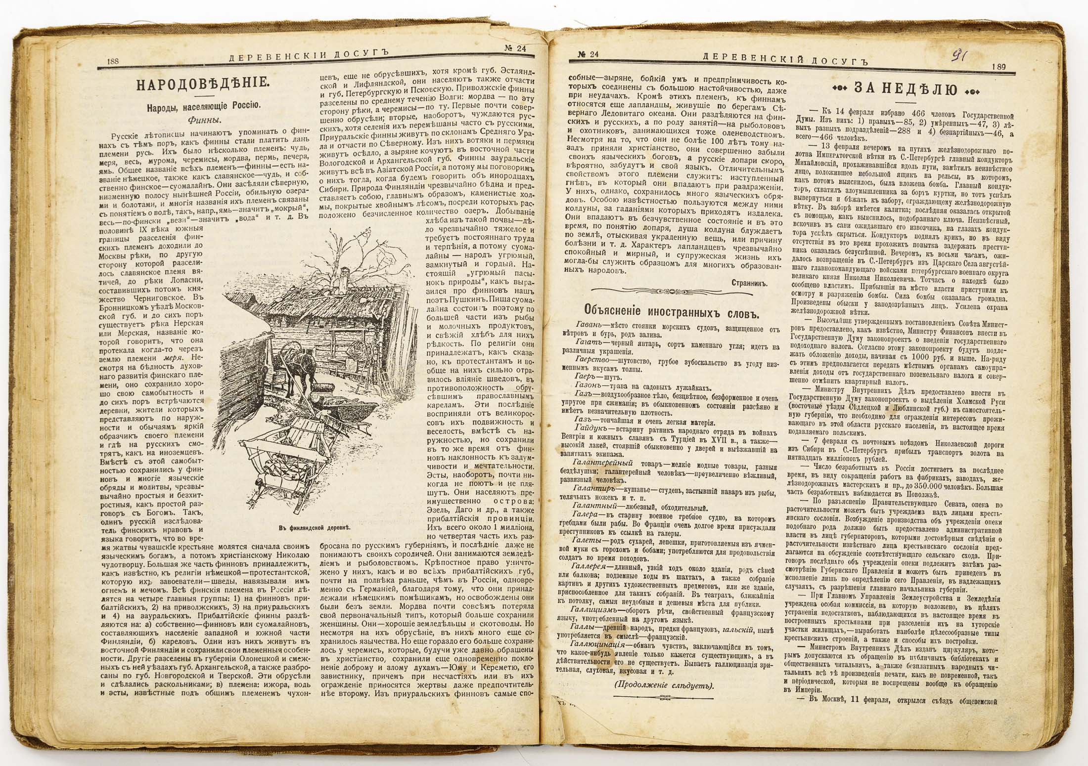 «Деревенский досуг. Журнал самообразования» издавался в Санкт-Петербурге еженедельно в 1906-1907 гг., всего вышло 68 выпусков. Из аннотации: «В журнале – в самом общедоступном изложении – будут помещаться: 1) статьи естественно-научного содержания, 2) исторические очерки, 3) статьи по земледелию, 4) описания стран, племен и народов, 5) жизнеописания знаменитых людей, 6) статьи и полезные советы по домашнему обиходу, ремеслам и промыслам, 7) объяснение встречающихся в русской речи иностранных слов, 8) смесь: анекдоты и мелочи, 9) текущие события за неделю и пр.». Редкость.