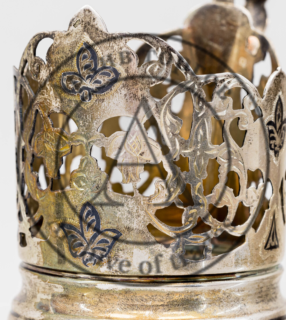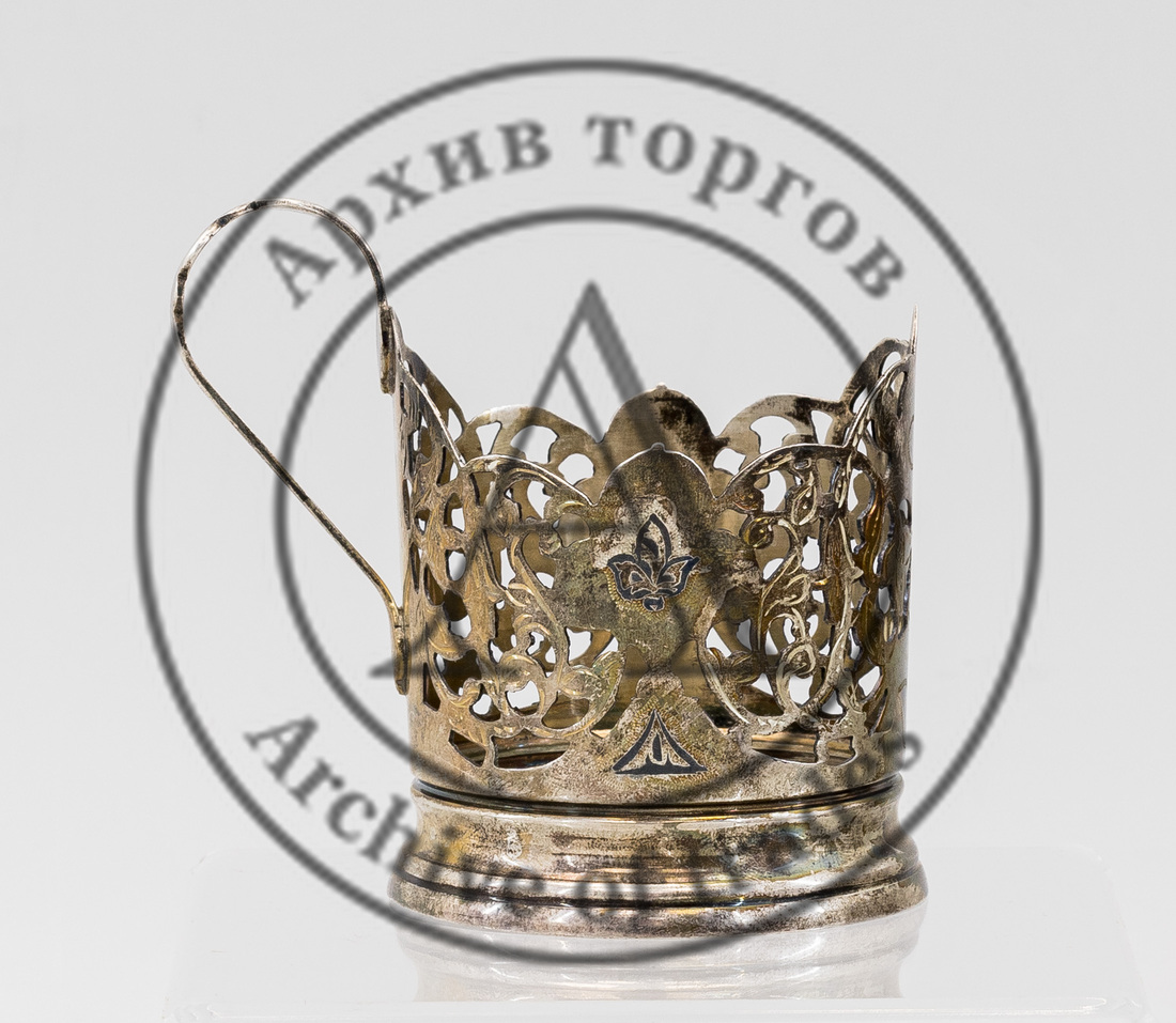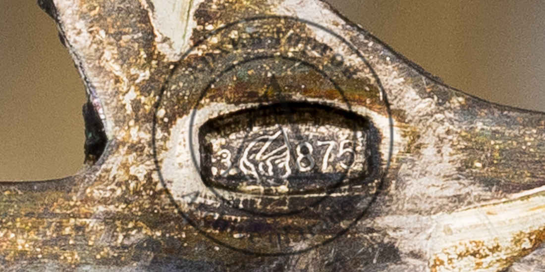 Клейма: 1) «литера «З» (шифр Прикаспийской пробирной инспекции, п. Кубачи), женская голова в кокошнике с обозначением 875-й пробы» в щитке в виде усеченно-овального с двух сторон эллипса; 2) «Д3ЛМ» в фигурном щитке.