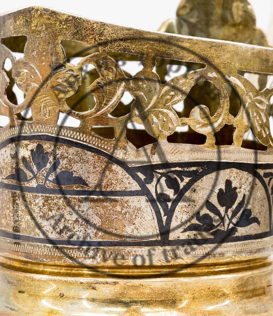 Серебро 875°, чернение, штихель, золочение.