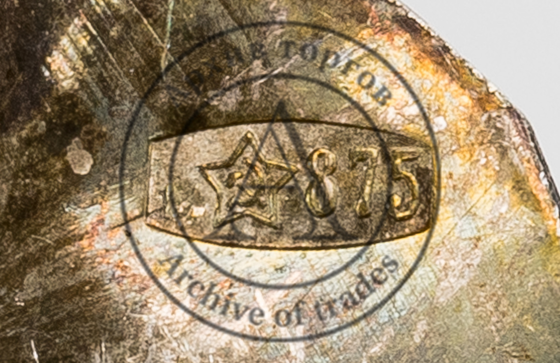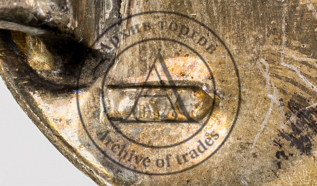 Клейма: 1) 875-й пробы с «серпом и молотом внутри пятиконечной звезды» и шифром московского пробирного управления (литерой «м») в щитке в виде прямоугольника с выпуклыми противоположными сторонами; 2) клеймо завода «КХК» (?) в фигурном щитке (слабо читаемо).