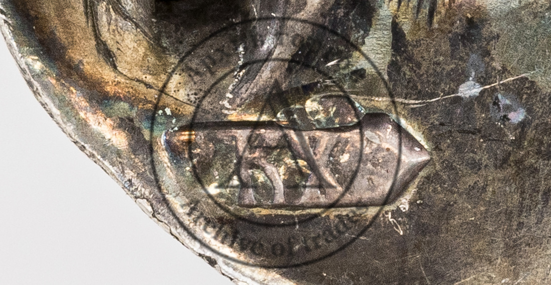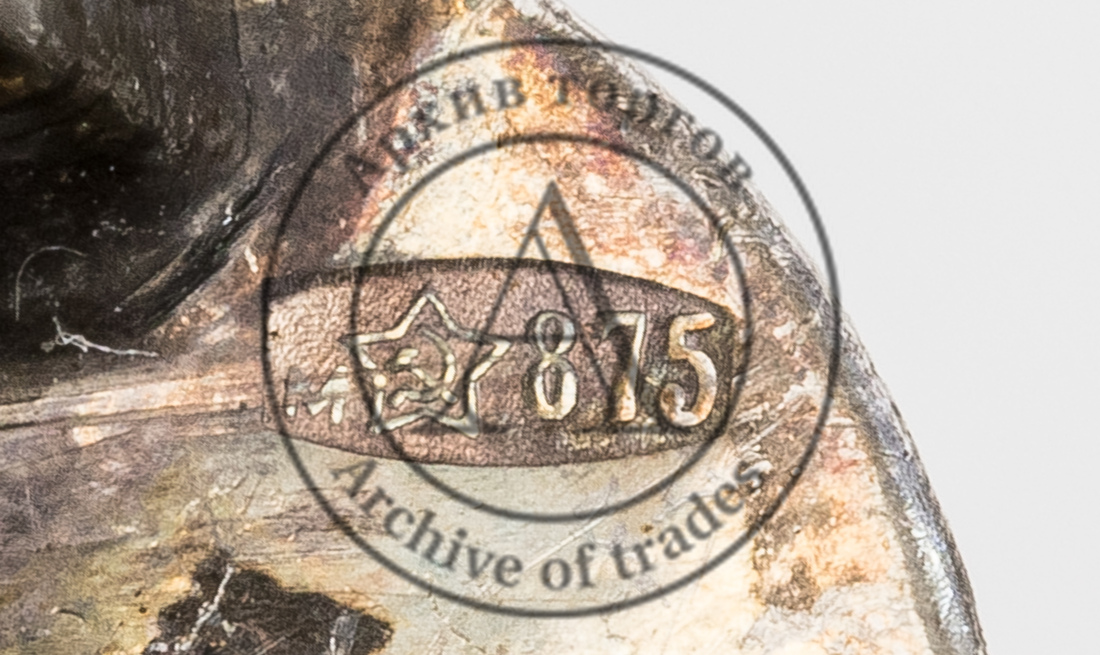 Клейма: 1) 875-й пробы с «серпом и молотом внутри пятиконечной звезды» и шифром московского пробирного управления (литерой «м») в щитке в виде прямоугольника с выпуклыми противоположными сторонами; 2) клеймо завода c датой изготовления «2КХК» (?) в фигурном щитке.
