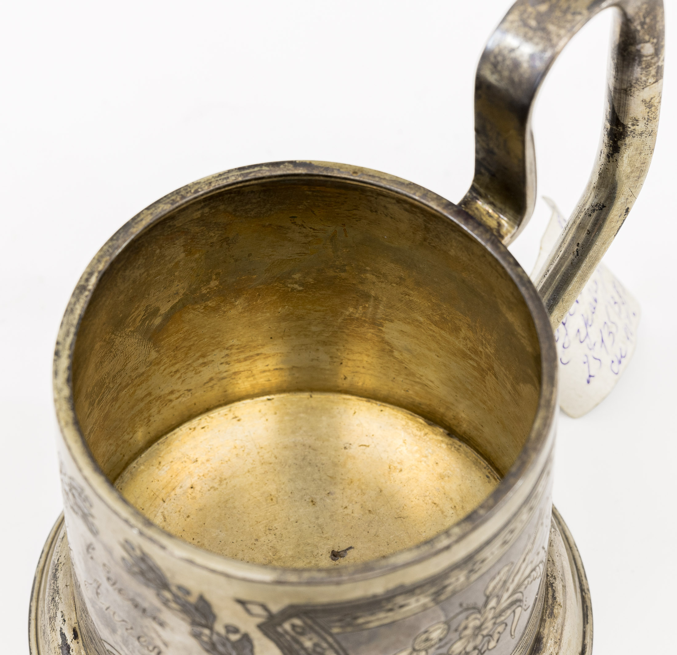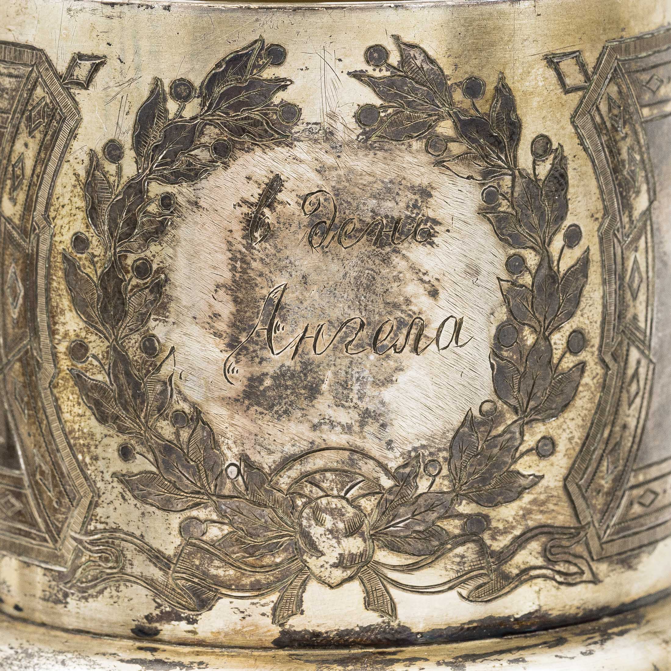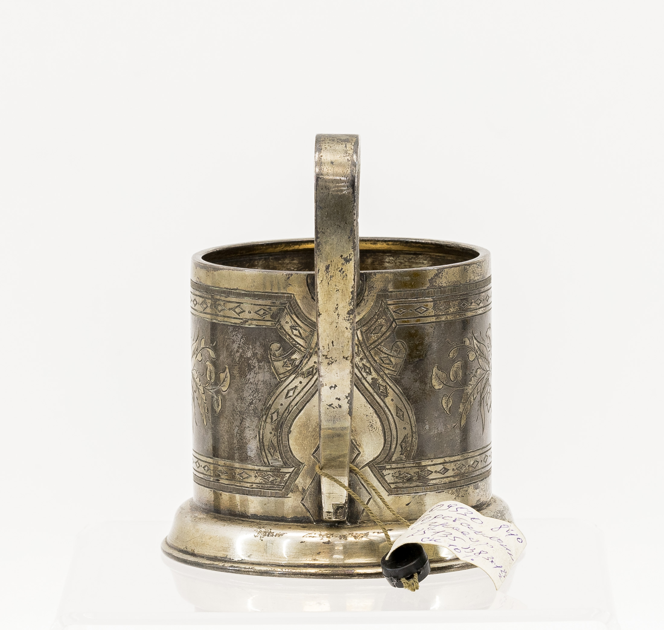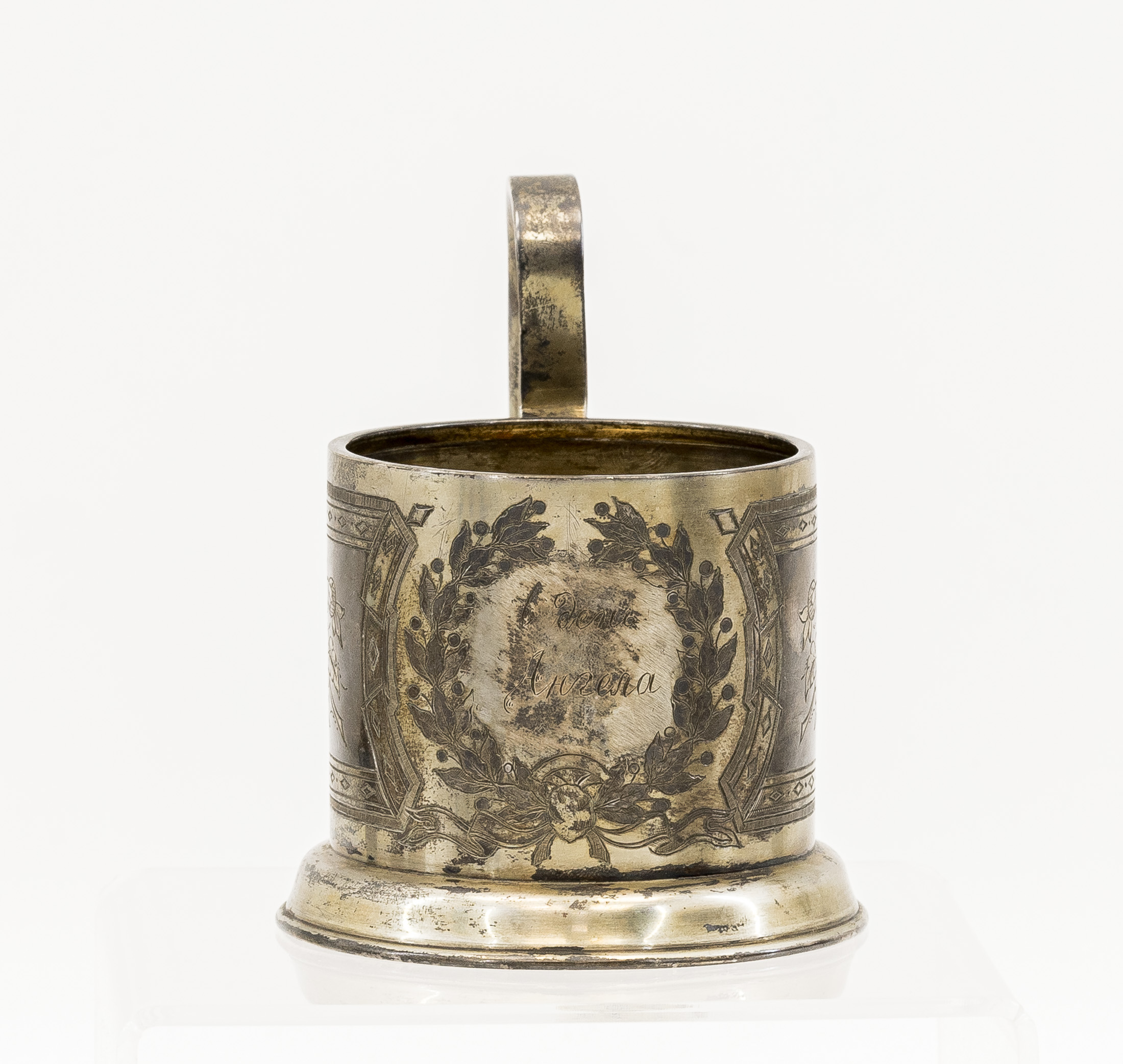 Клейма на исподе дна: 1-2) 84-й пробы, герб Москвы «Георгий Победоносец на коне, поражающий копьём дракона (обращен вправо)» в прямоугольных щитках со скошенными углами; 3) в прямоугольных щитках со скошенными углами клеймо пробирного мастера «А·Р» (Романов А.) над датой «1885»; 6-7) именник «В.В.» в прямоугольном щитке (неизвестный мастер, 1878–1885 гг.); на ручке фрагмент именника и клейма с гербом Москвы.