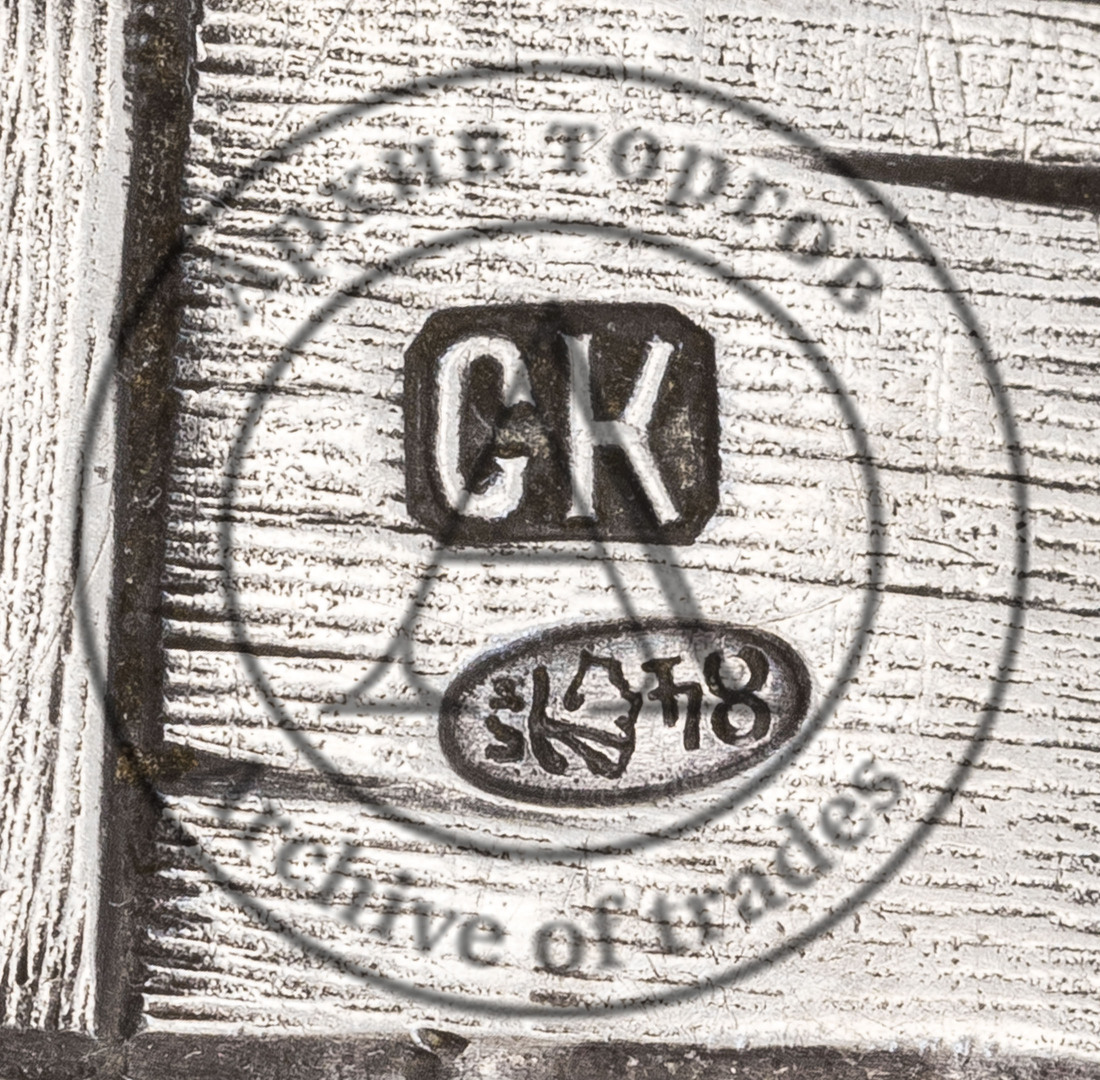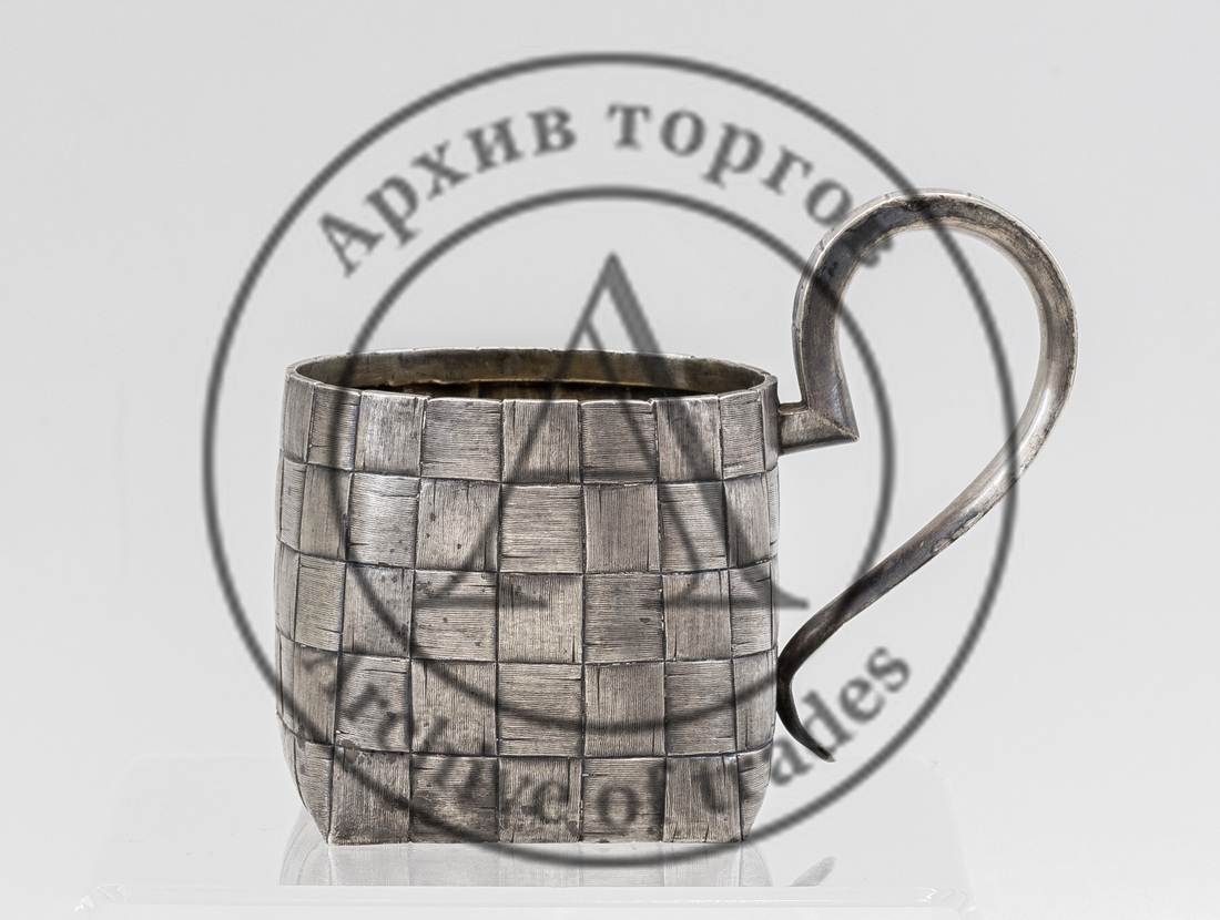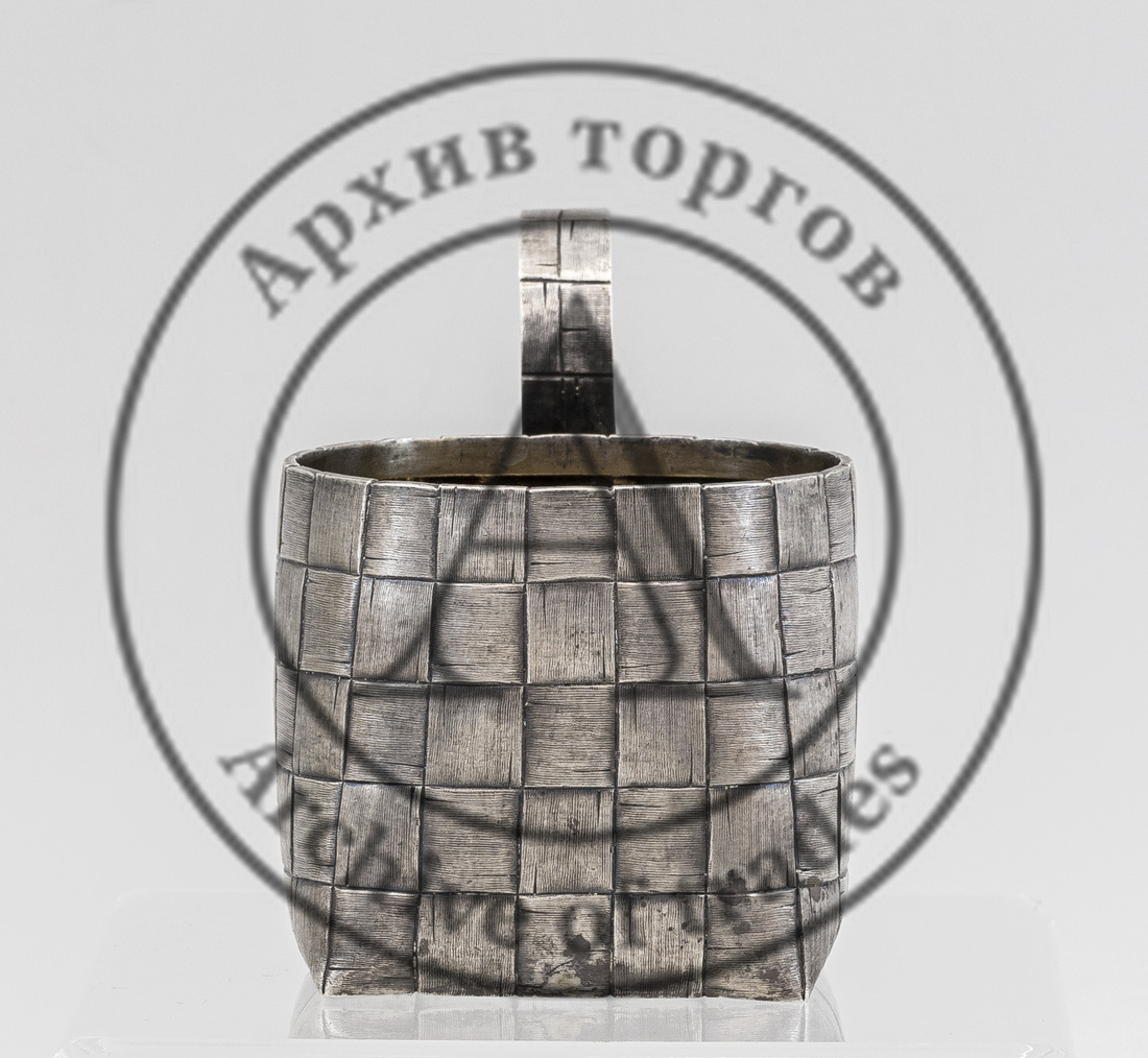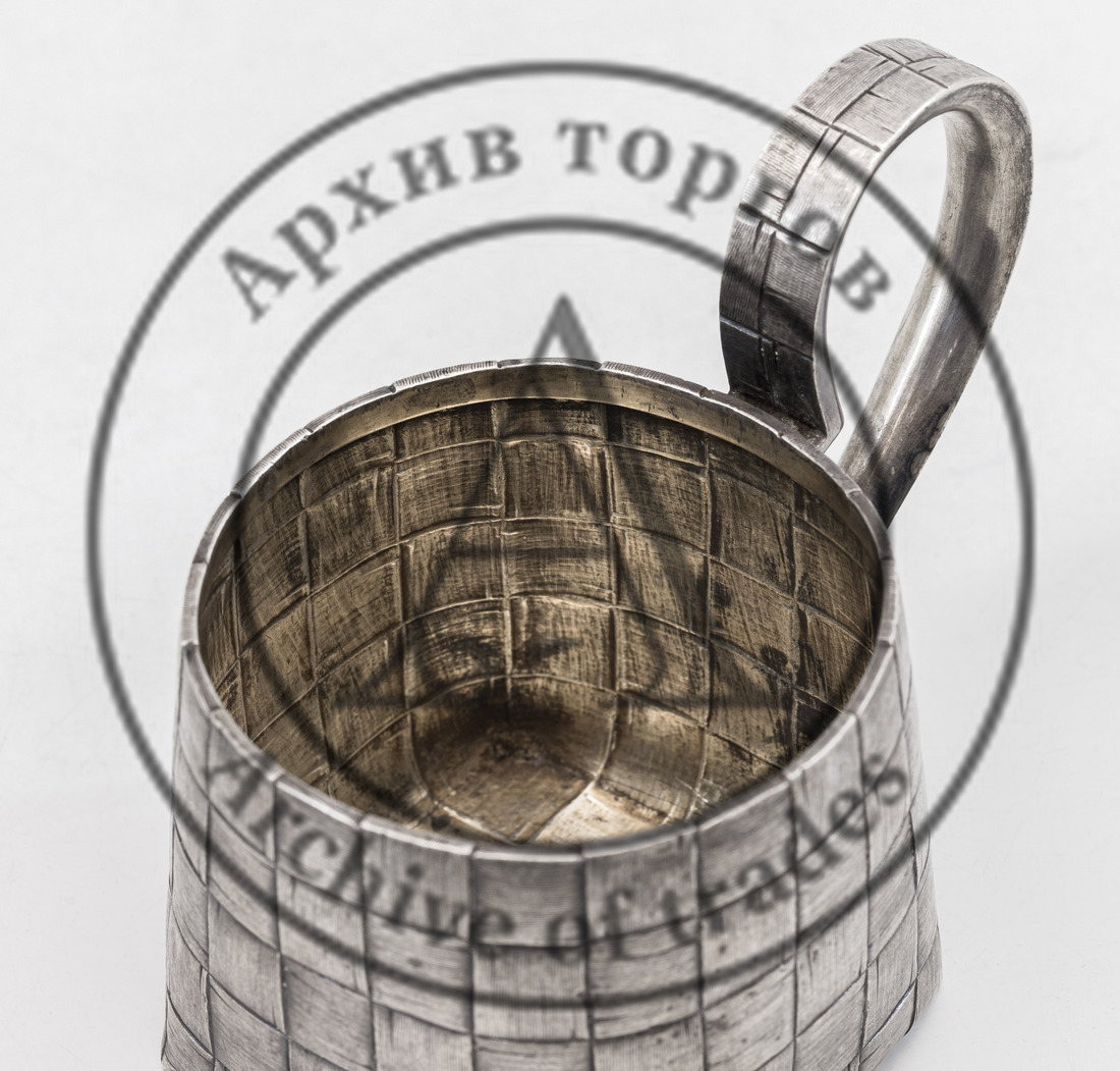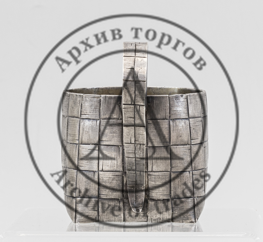 Клейма: 1) 84-я проба, «женская голова в кокошнике, обращенная влево» и инициалы «ИЛ» в овальном щитке (клеймо Московского пробирного управления, с инициалами пробирного инспектора Ивана Лебедкина 1898-1908 гг.); 2) на ручке «женская голова в кокошнике, обращенная влево» и инициалы «ИЛ» в круглом щитке; 3) «СК» в прямоугольном щитке со скошенными углами: мастер Казаков Семен (?), владелец мастерской серебряных изделий, 1889 г. — после 1908 г. работал на фирму Немирова-Колодкина, в 1900 г. участвовал на выставке в Париже.