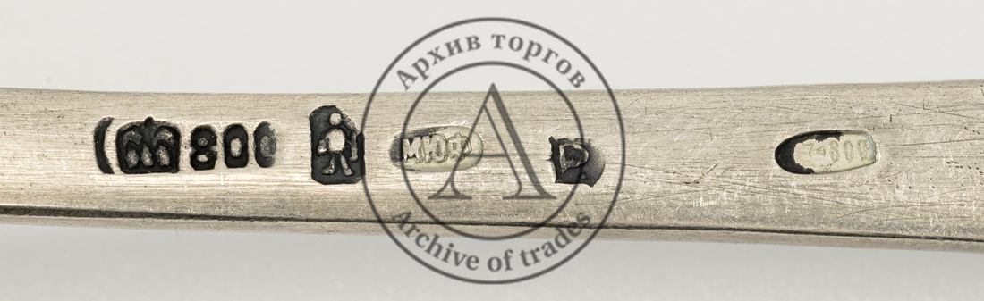 Клейма: 1-2) «800» и «полумесяц и корона» (немецкое клеймо пробы серебра); 3) «фигурка человечка» в прямоугольном щитке со скошенными углами (клеймо производителя);