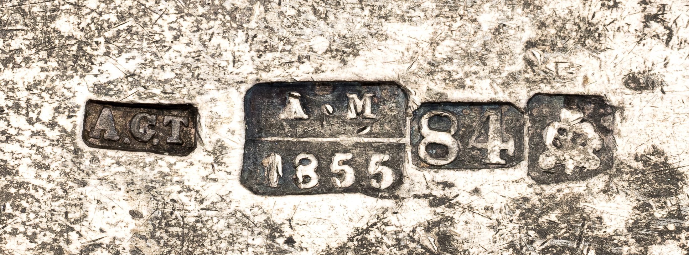 Клейма: 1-2) в прямоугольных щитках со скошенными углами «84» и герб Петербурга «два якоря и скипетр» (клеймо Пробирной палаты Санкт-Петербурга); 3) «А·М» над датой «1855» в прямоугольном щитке (клеймо пробирного мастера Александра Николаевича Митина, 1842–1877); 4) именник «А.С.Т.» в прямоугольном щитке со скошенными углами (Неизвестный мастер 1855–1861, имеются работы в ГИМе (согласно каталогу клейм М. М. Постниковой-Лосевой)).