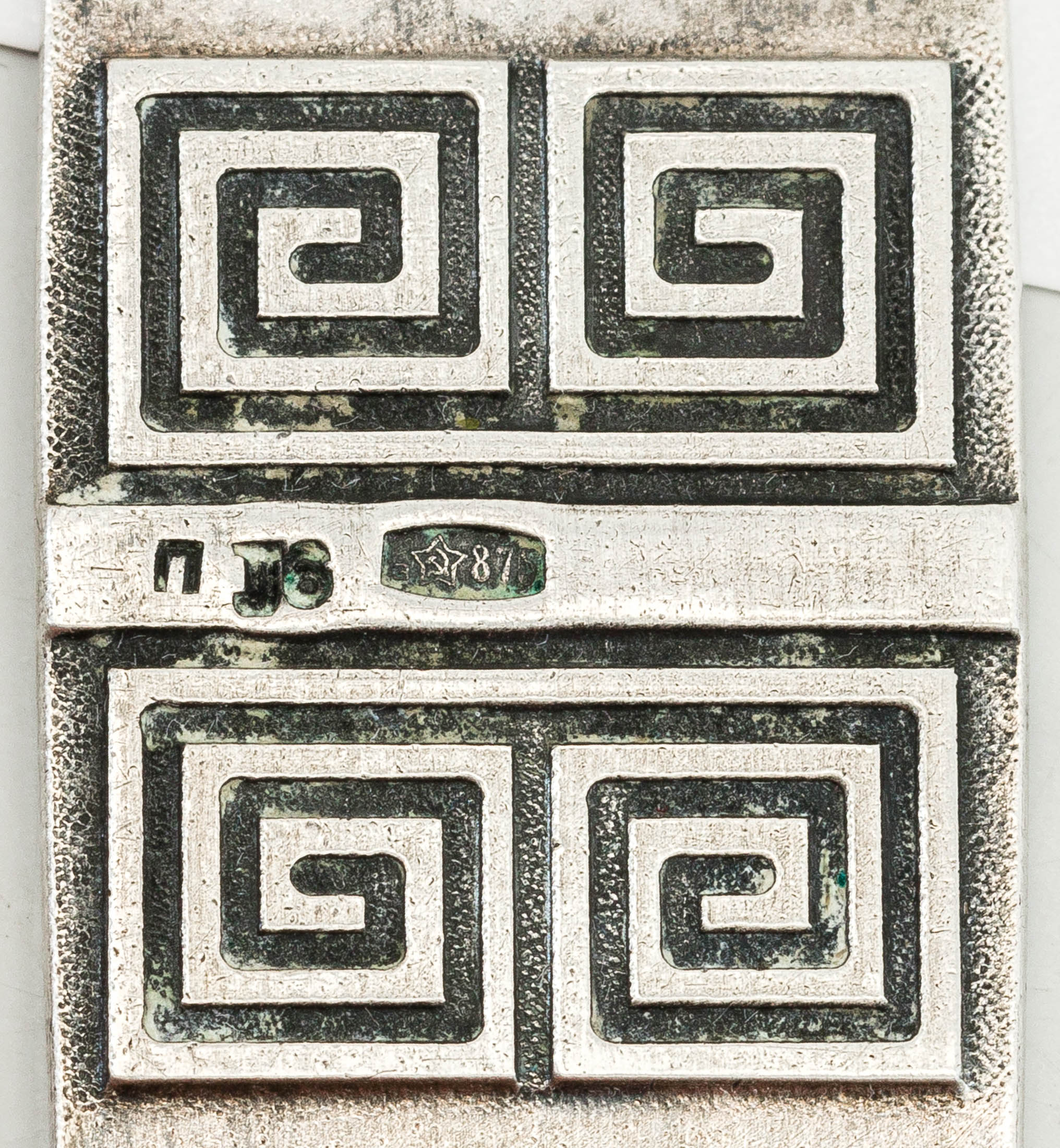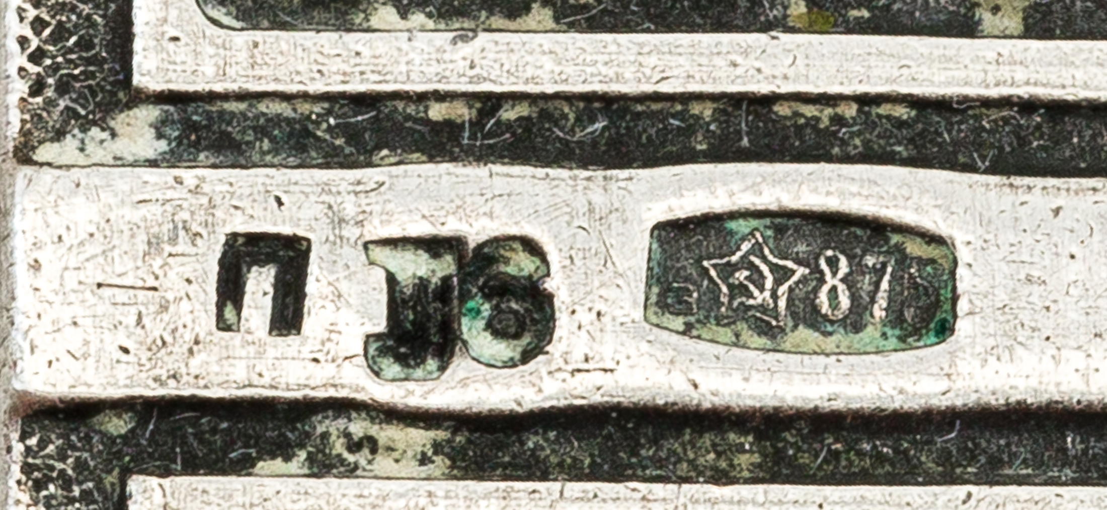 Клейма: 1) 875-й пробы с «серпом и молотом внутри пятиконечной звезды» и литерой «Э» (шифром Государственной инспекции пробирного надзора по Эстонской ССР, г. Таллин) в щитке в виде прямоугольника с выпуклыми противоположными сторонами (1958–1991 гг.); 2) клеймо завода с датой производства «TJ6»; 3) литера «П».