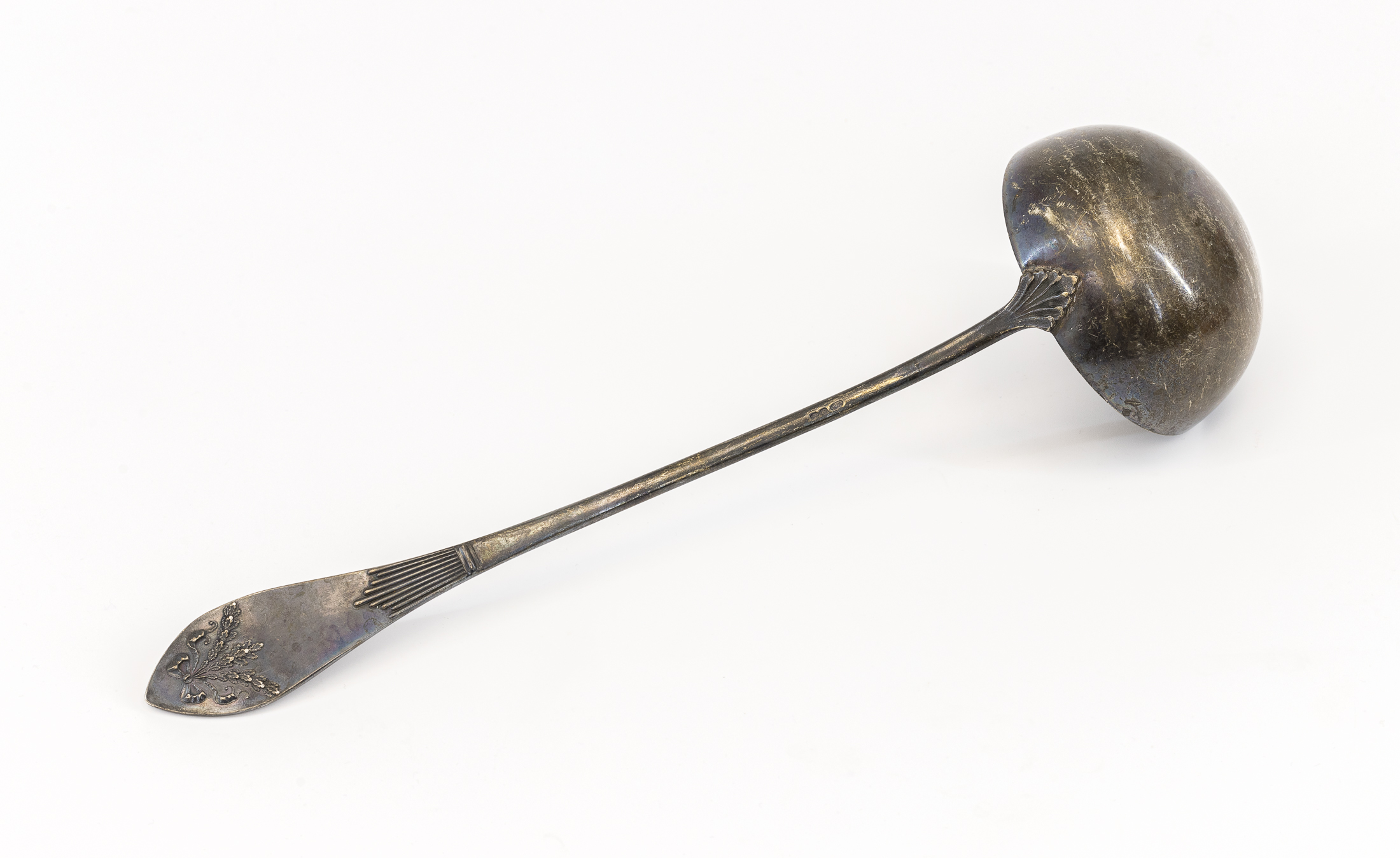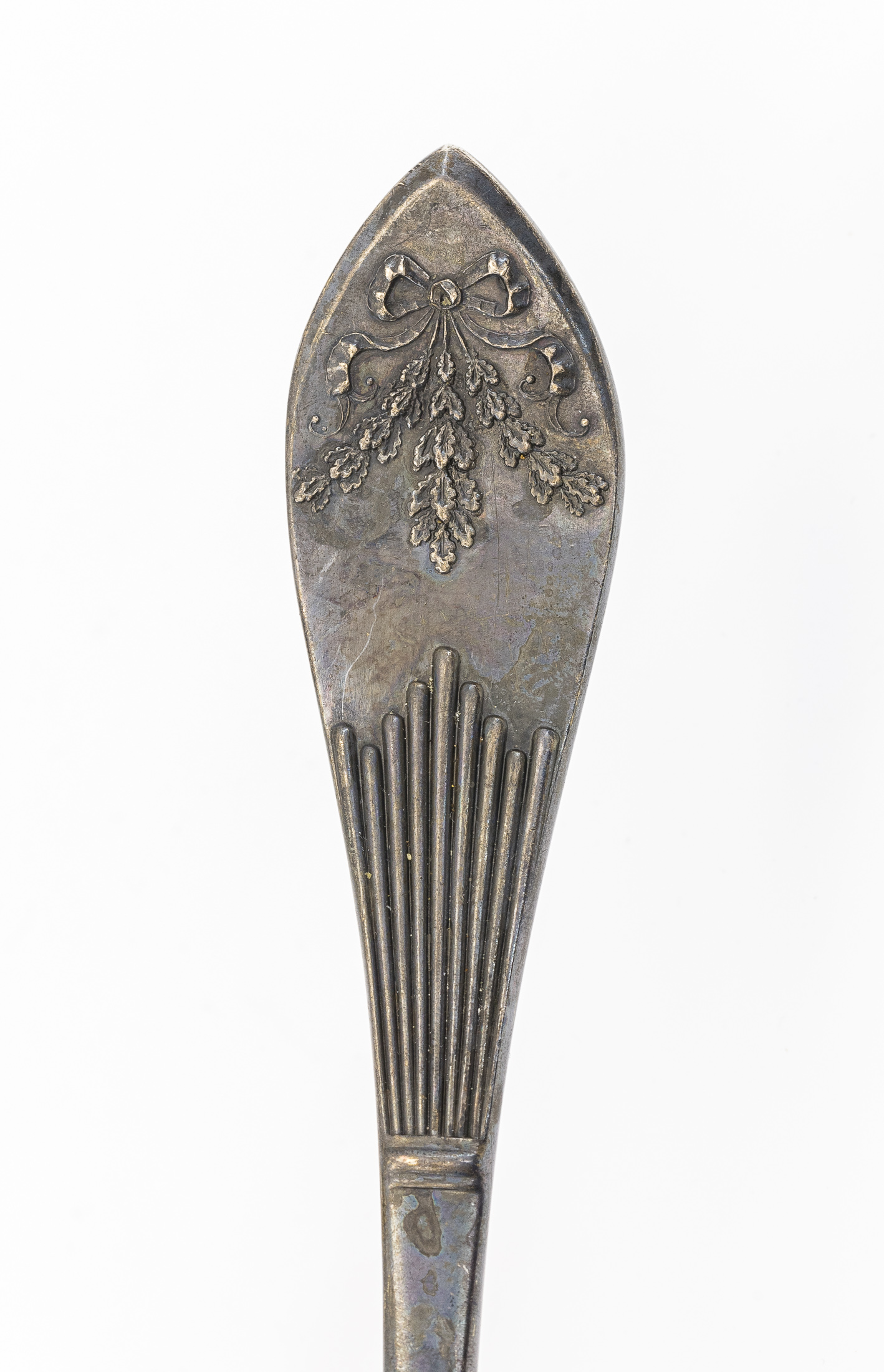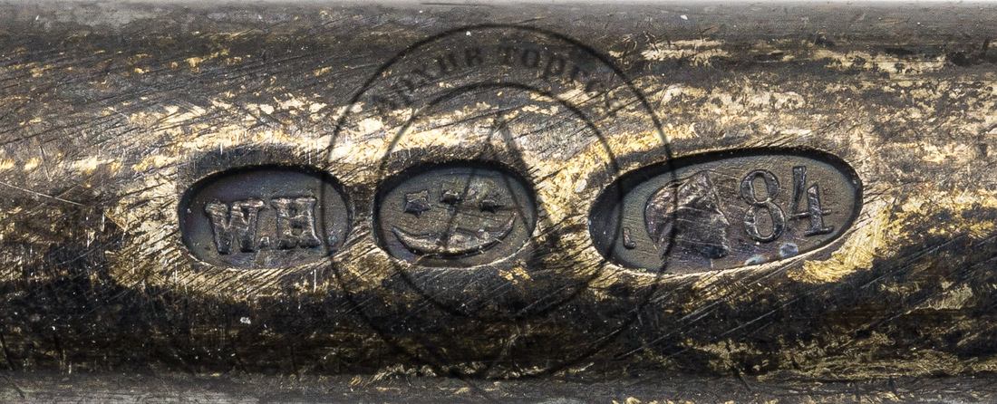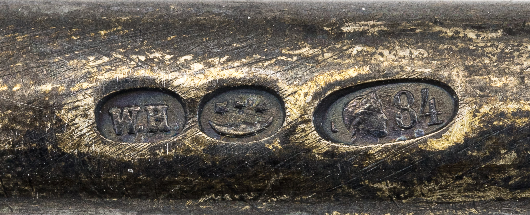Клейма: 1) в овальном щитке «женская голова в кокошнике, обращенная вправо», с обозначением пробы «84» и литерой «ι» («йота», шифр Варшавского пробирного управления, 1908–1917 гг.); 2) «женская голова в кокошнике, обращенная вправо, в круглом щитке; 3-4) клейма фирмы: именник «W.H.» (Wladyslaw Hempel) в овальном щитке, «полумесяц и три звезды над ним» в овальном щитке.