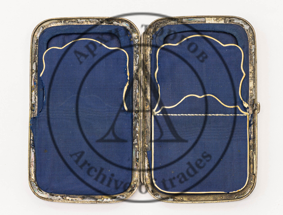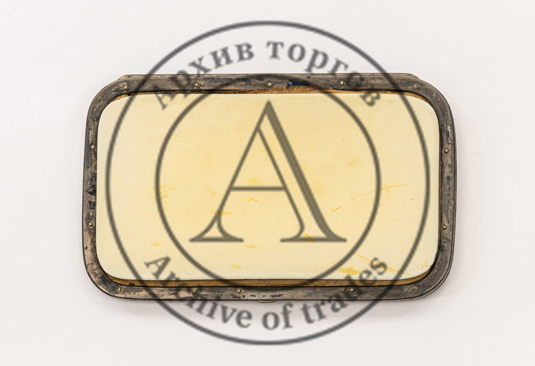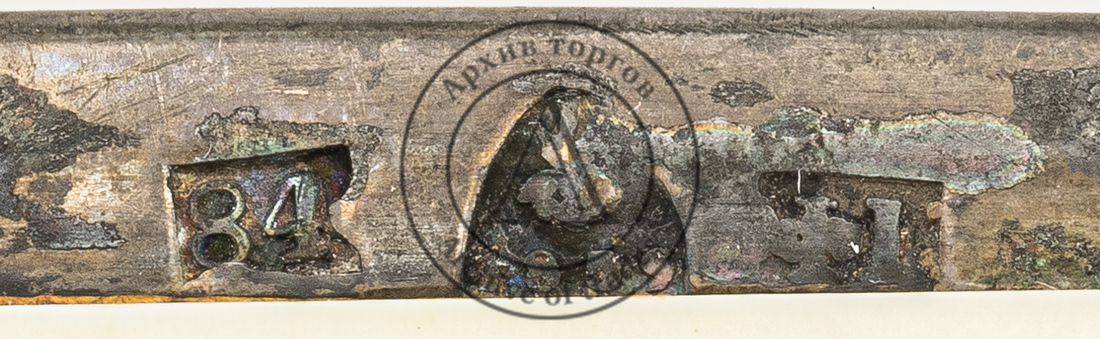 на маленькой широкой вилочке, ложке для икры, ноже-лопатке 1) «84» (обозначение пробы) и «женская голова в кокошнике, обращенная влево» и инициалами «ЯЛ» в овальном щитке (клеймо Петербургского пробирного управления, с инициалами пробирного инспектора Якова Ляпунова, 1899–1903 гг.); 2) именник «АК» в прямоугольном щитке со скошенными углами (мастер Карпов Александр Карпович, 1898-1908 гг.) (?);