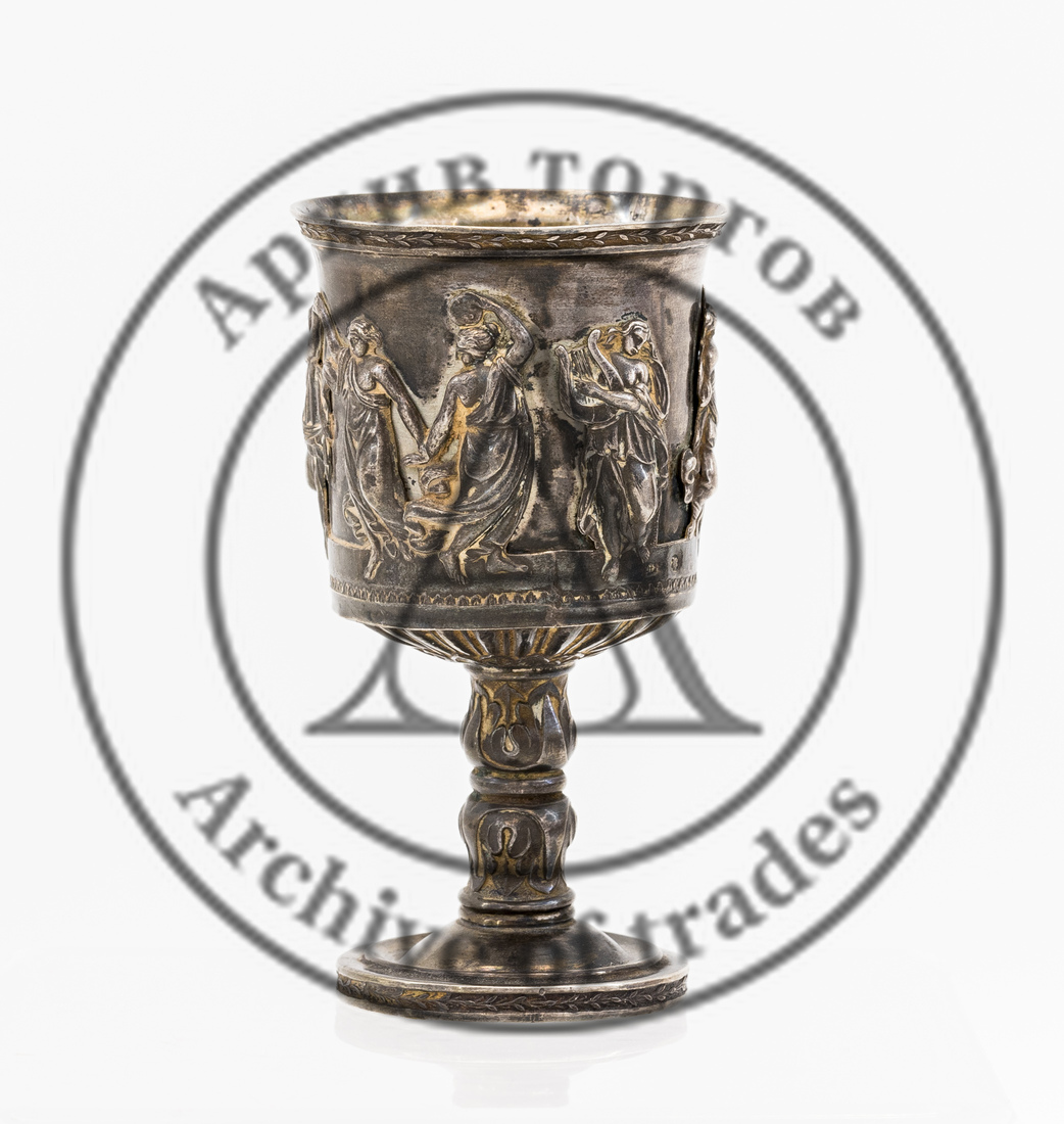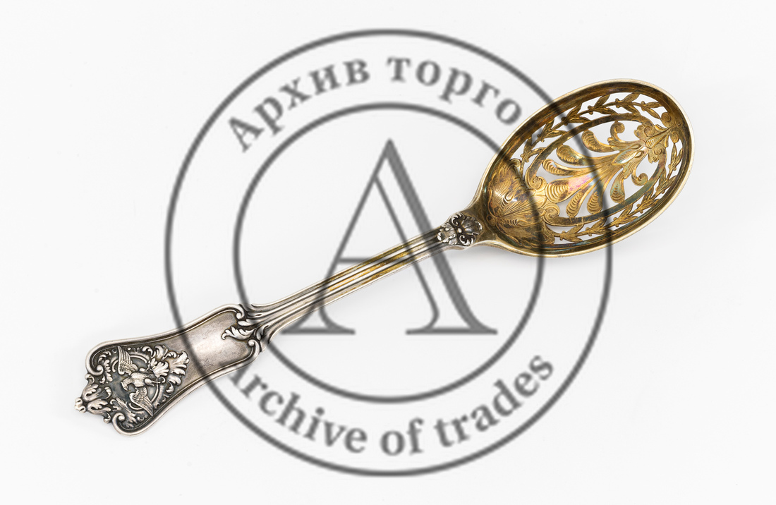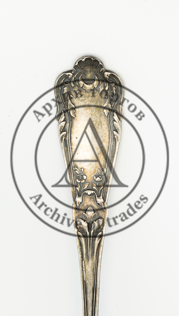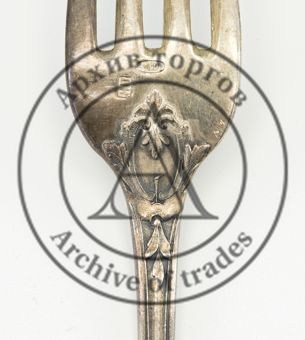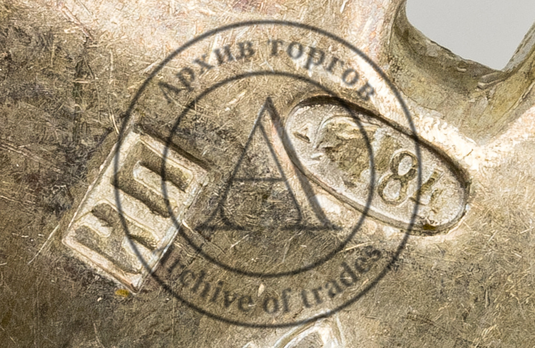 Клейма: 1) в овальном щитке «женская голова в кокошнике, обращенная вправо» с шифром московского пробирного округа («Δ», дельта) и обозначением пробы «84»; 2) именник «НП» в прямоугольном щитке (Павлов Николай Павлович (?), владелец мастерской по производству золотых и серебряных изделий, 1885–1917 гг.).