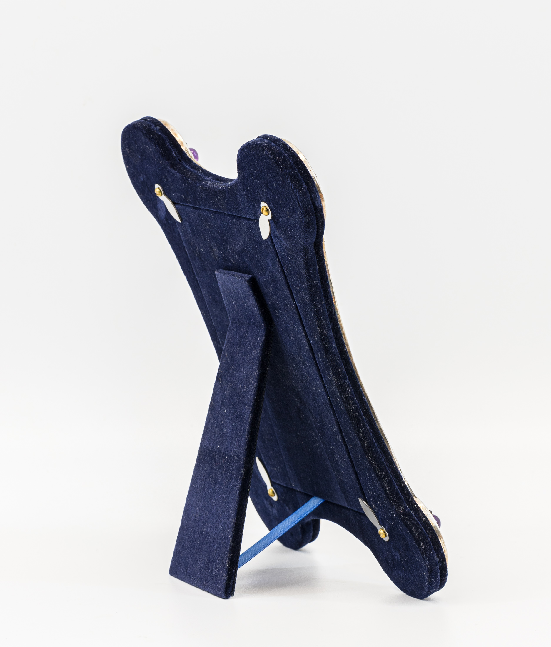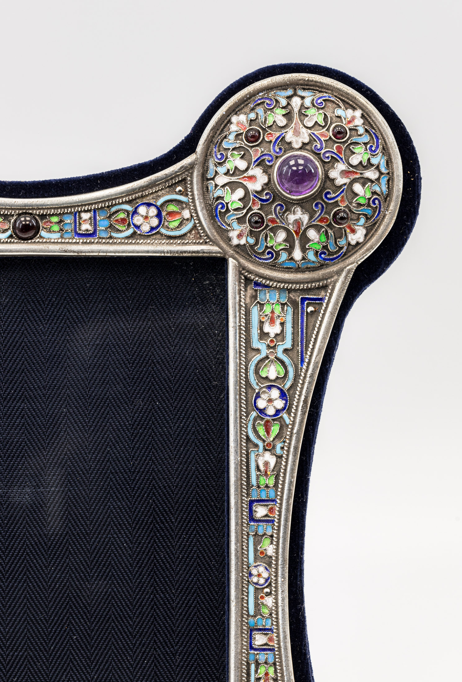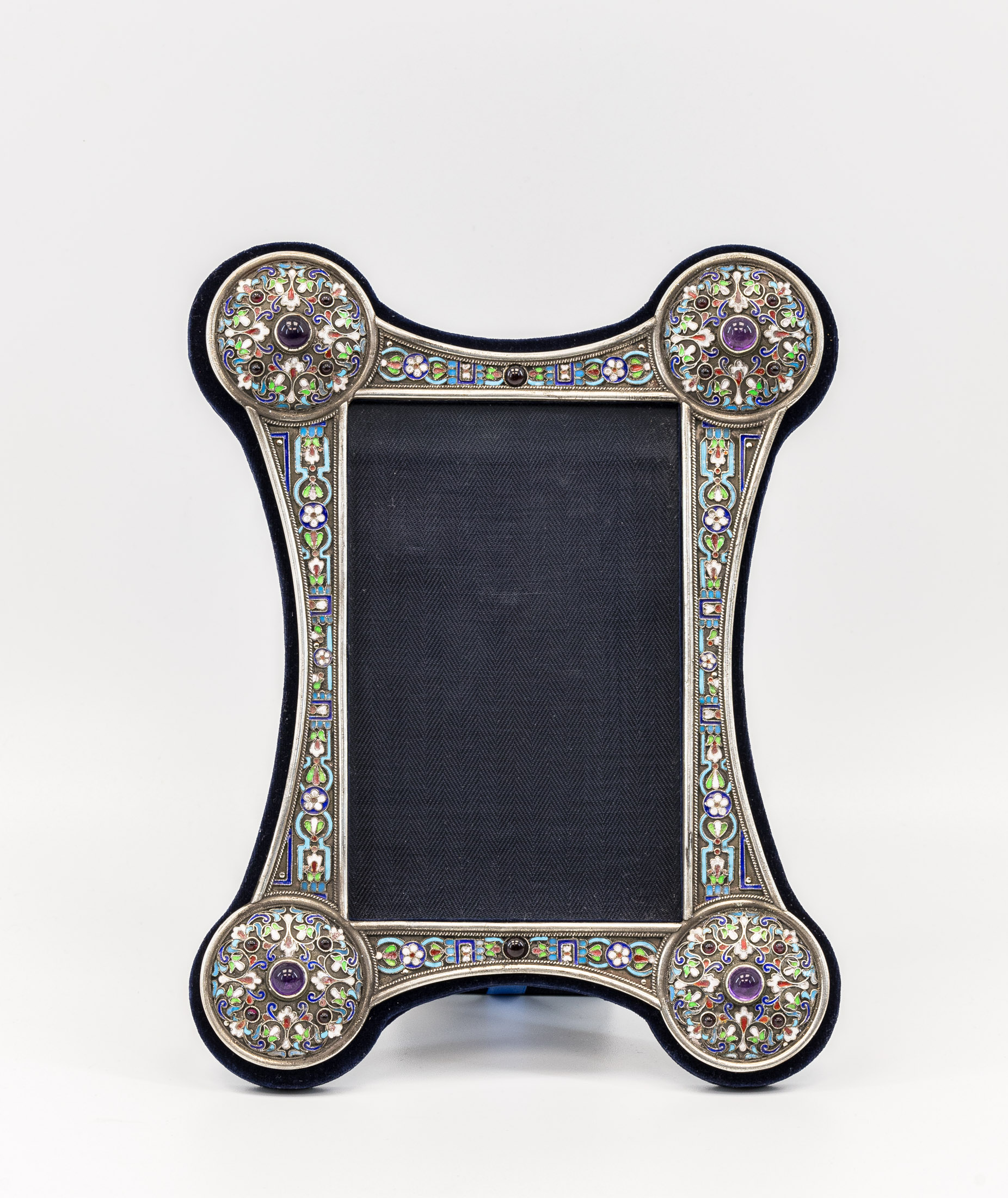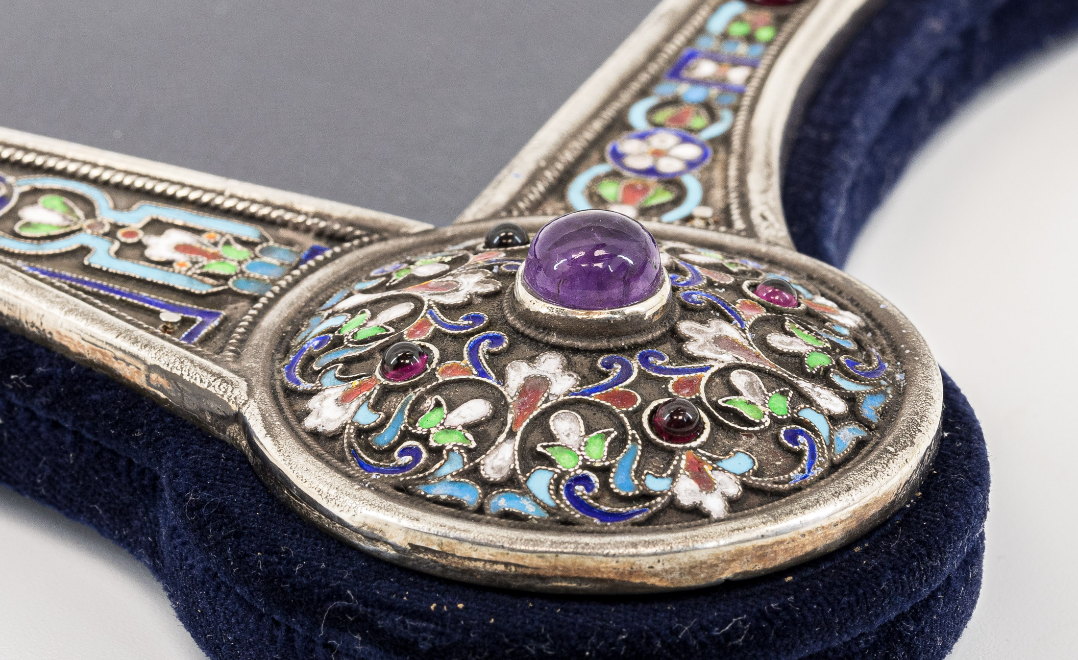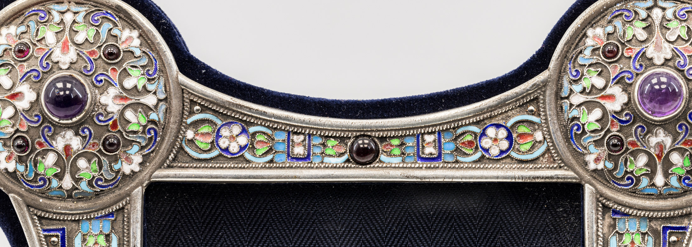 Серебро (?), скань, камни, цветные эмали; бархат, ткань.