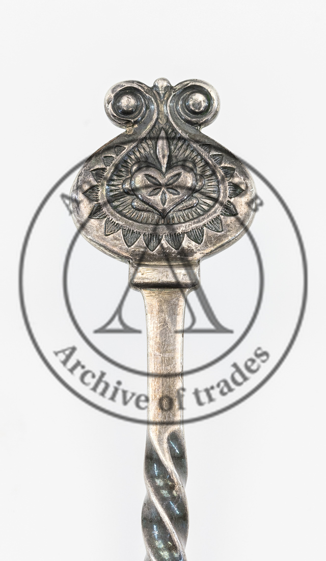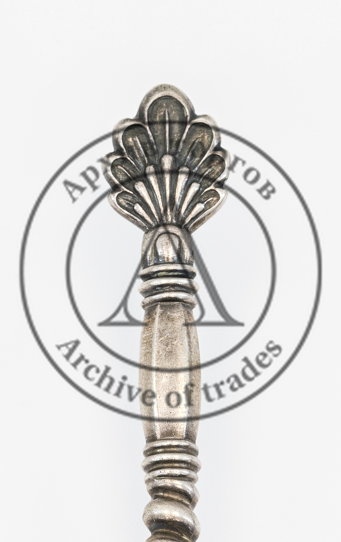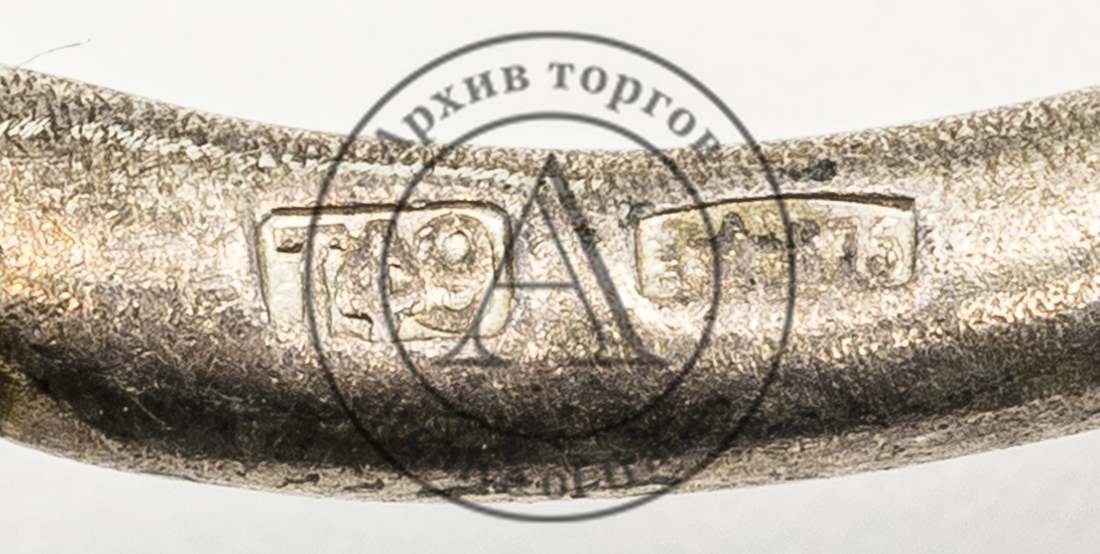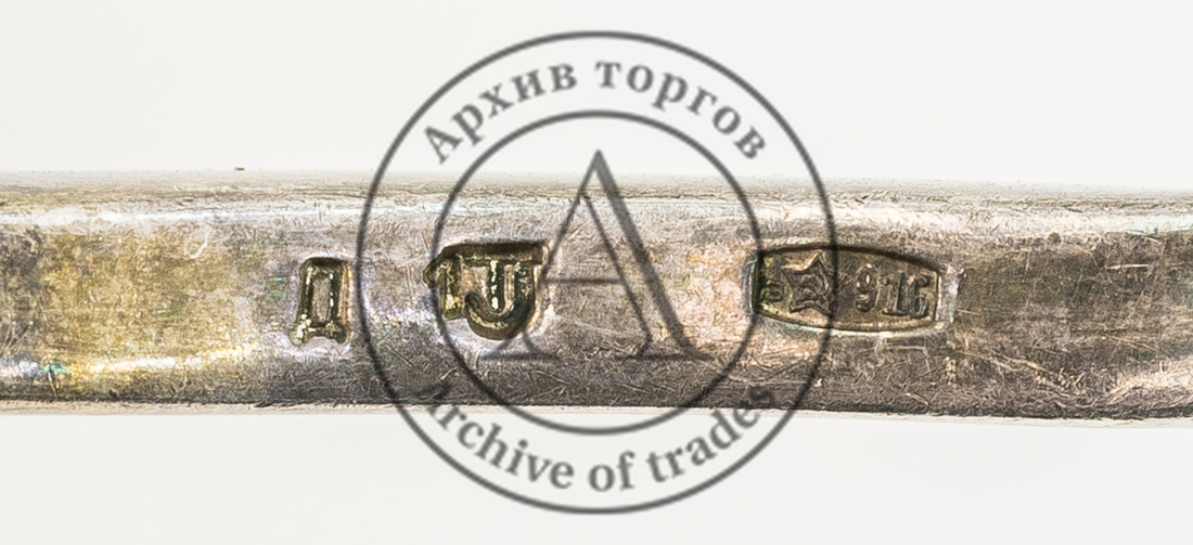 Клейма: 1) 875-й пробы с «серпом и молотом внутри пятиконечной звезды» и литерой «Э» (шифром Государственной инспекции пробирного надзора по Эстонской ССР, г. Таллин) в щитке в виде прямоугольника с выпуклыми противоположными сторонами (1958–1991 гг.); 2) клеймо завода с датой производства «ТФ9» (1959) в прямоугольном щитке; 3) клеймо завода с датой производства «1TJ» (1971); 3) литера «Д».