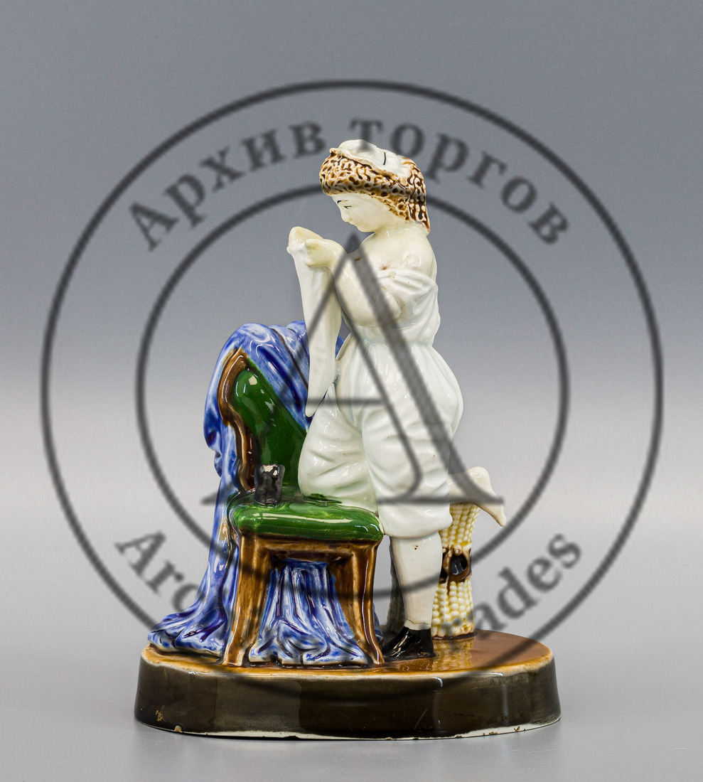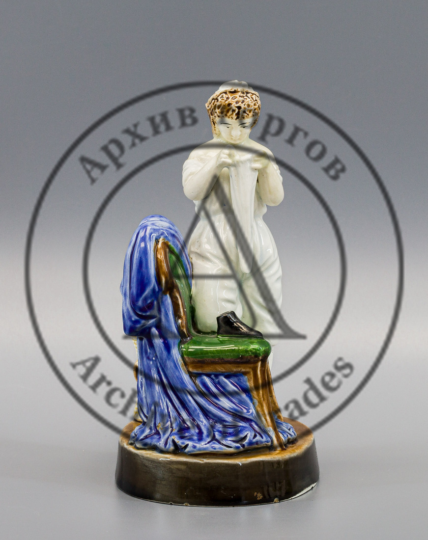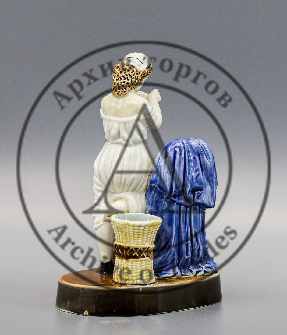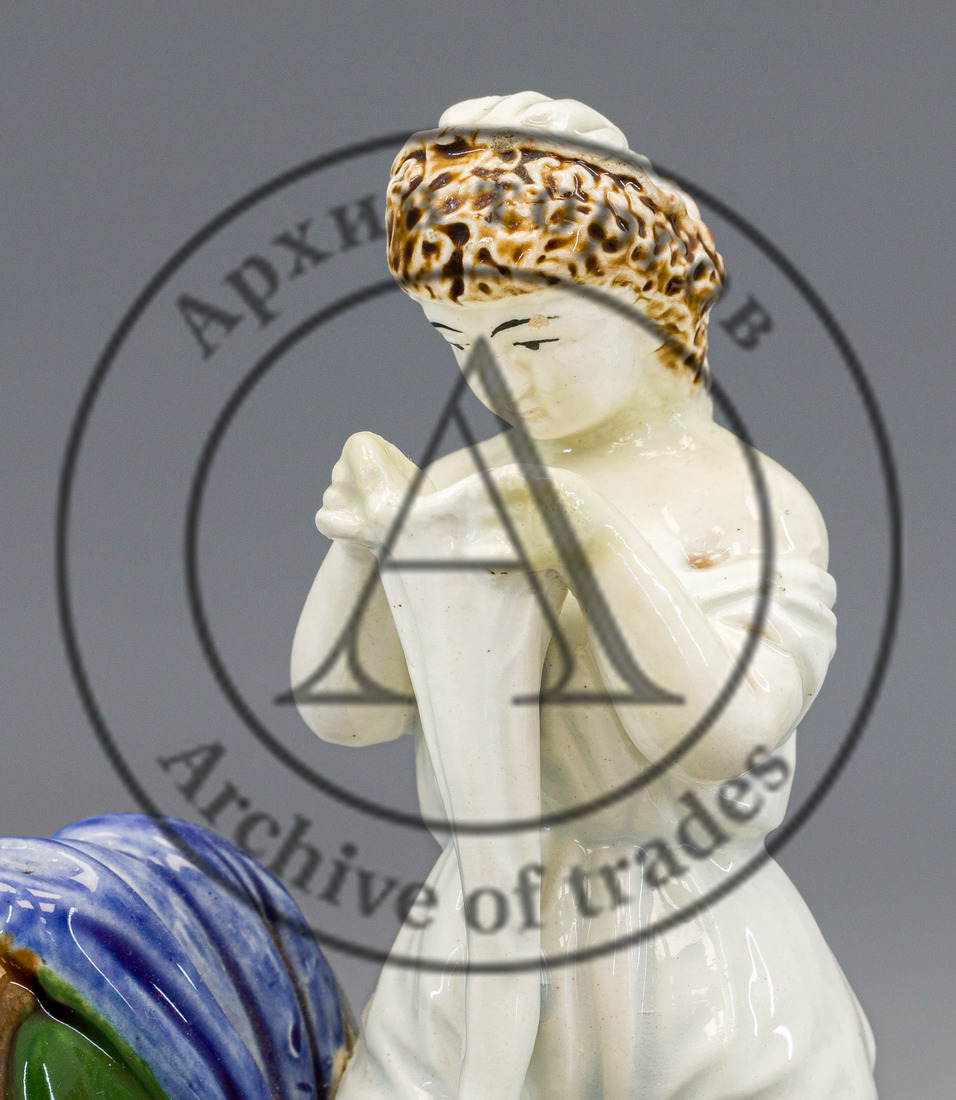Сохранность: реставрационные вмешательства (у девушки левая щиколотка со следом склейки, руки, шея; небольшой фрагмент корзины), небольшие скольчики на ткани и голове (глазурь), на постаменте и на исподе дна.