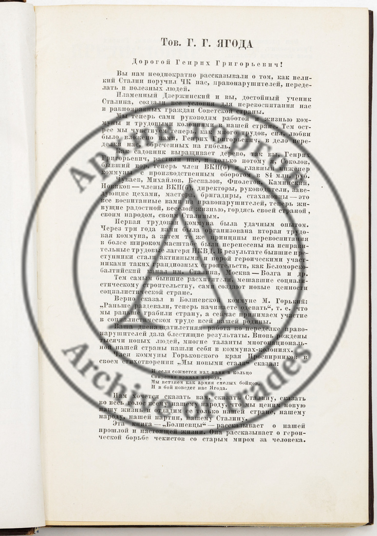 Болшевская трудовая коммуна для малолетних правонарушителей была создана на основании приказа Г.Г. Ягоды в 1924 г. и просуществовала до 1937 г., когда Ягода был снят со всех постов и арестован. Книга о Болшевской коммуне, изданная годом ранее по инициативе М. Горького, была запрещена и изымалась. Во многих сохранившихся экземплярах утрачен портрет Ягоды и письмо к нему членов коммуны. Данный экземпляр – комплектный (редкость!!).