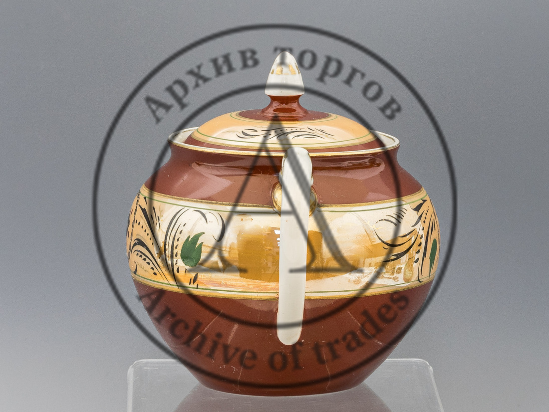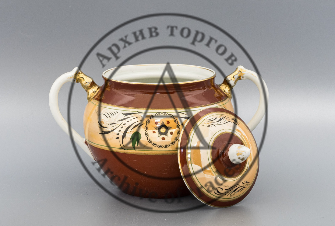 Сохранность: потертости золочения и крытья, реставрационные вмешательства, царапины на глазури на внутренней части крышки и сахарницы.