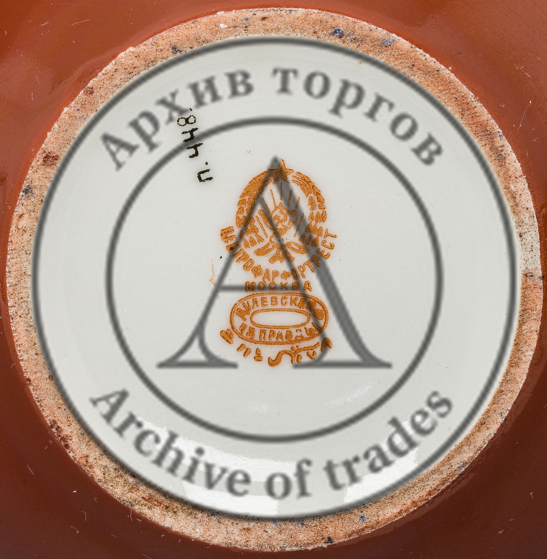 Марка: 1) под серпом и молотом в чайнике “ЦЕНТРОФАРФОРТРЕСТ // МОСКВА» в овале «ДУЛЕВСКАЯ Ф. ИМ. ПРАВДЫ”, ниже надпись на арабском (красная печать, для экспортных товаров) 2) «п.чч8.» (черным).