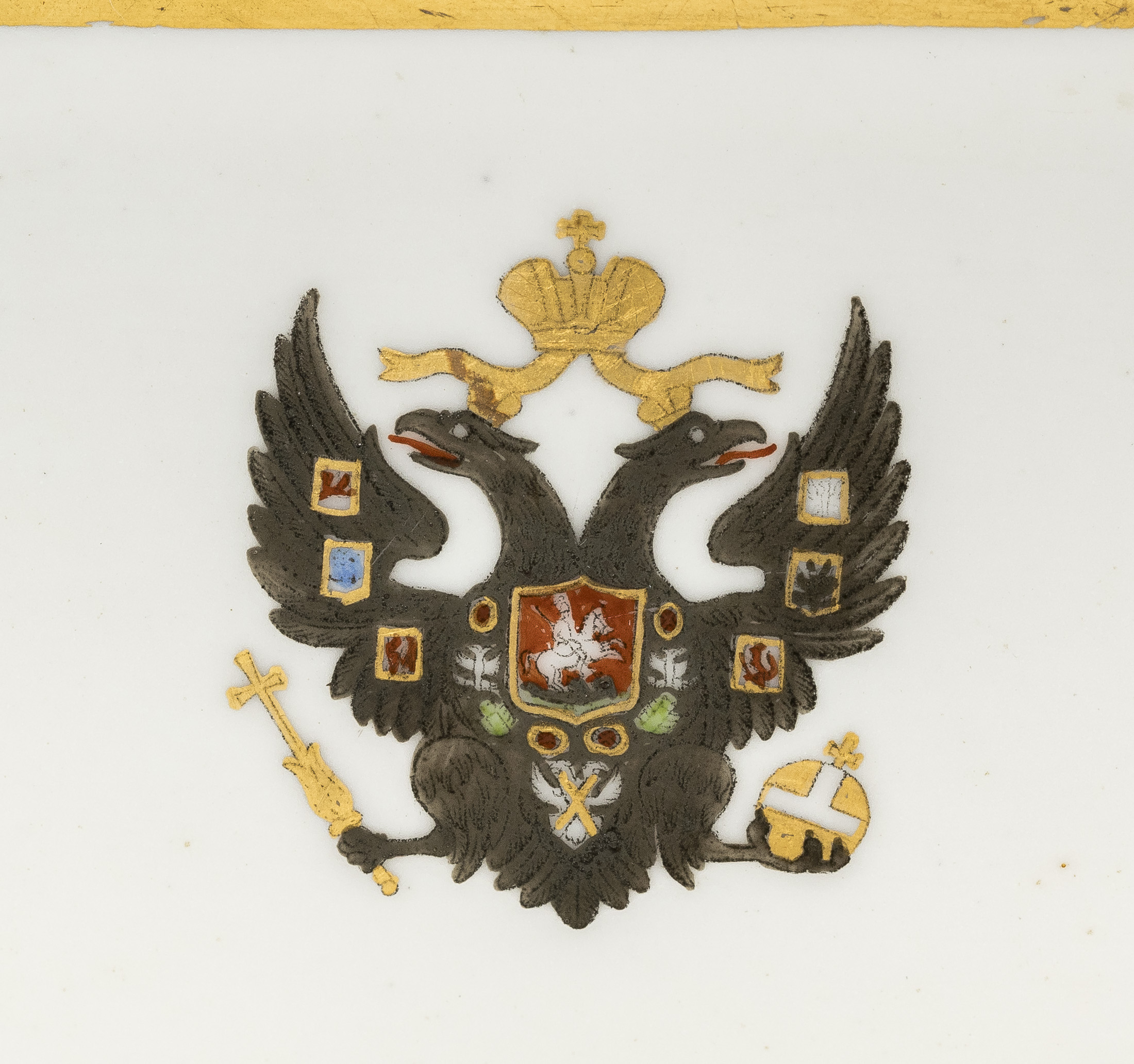 Герб «старого образца»: двуглавый орёл со скипетром и державой под тремя коронами с изображением Св. Георгия на груди в щитке в обрамлении цепи ордена Св. Андрея Первозванного. С расправленными крыльями, на крыльях — титульные гербы по три на каждом: на правом — Казанский, Астраханский и Сибирский, на левом — Польский, Таврический и Финляндский.