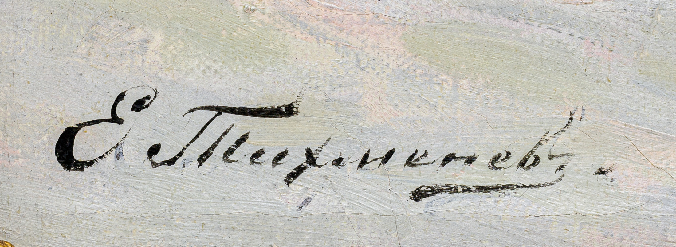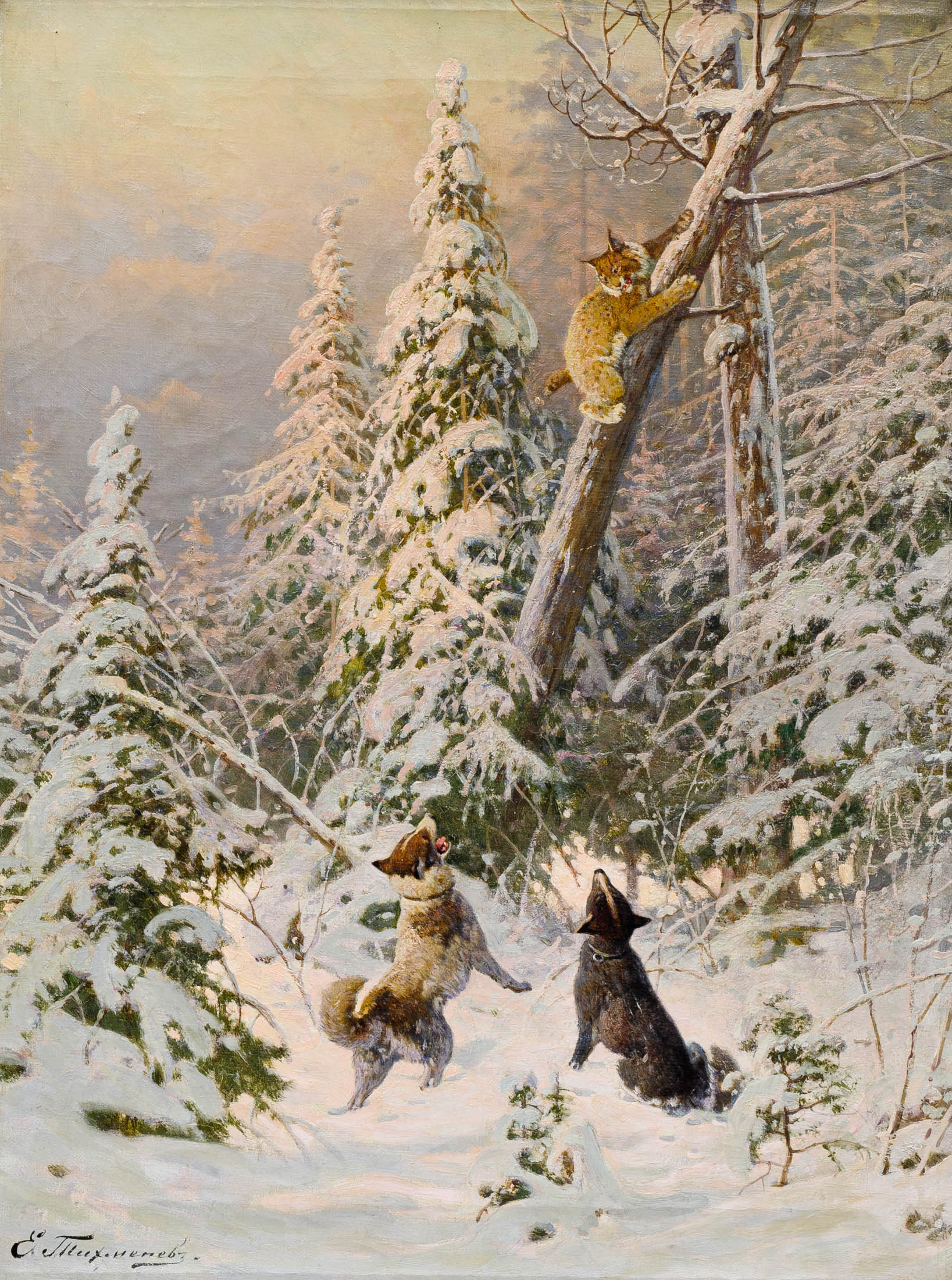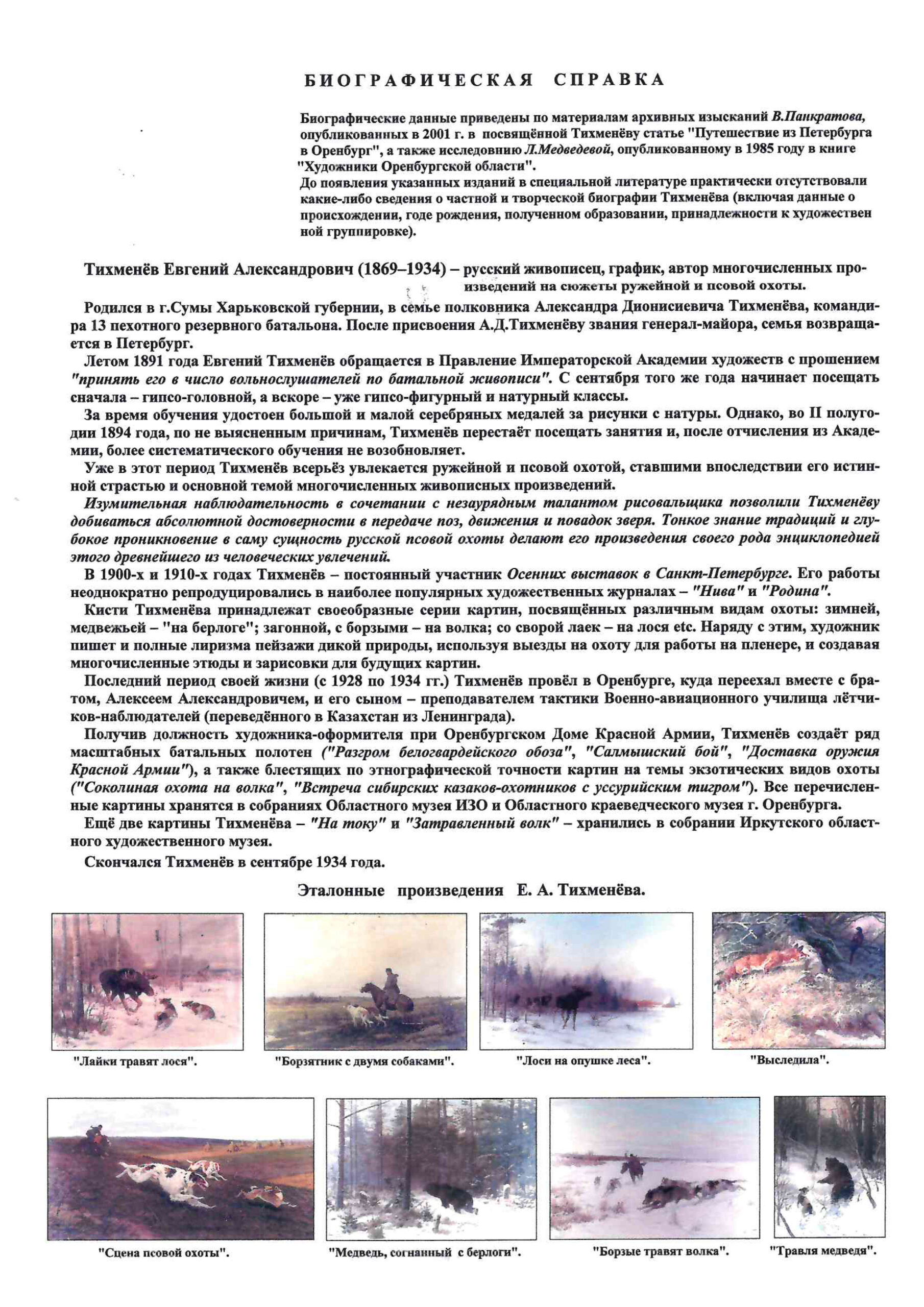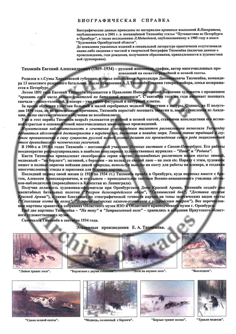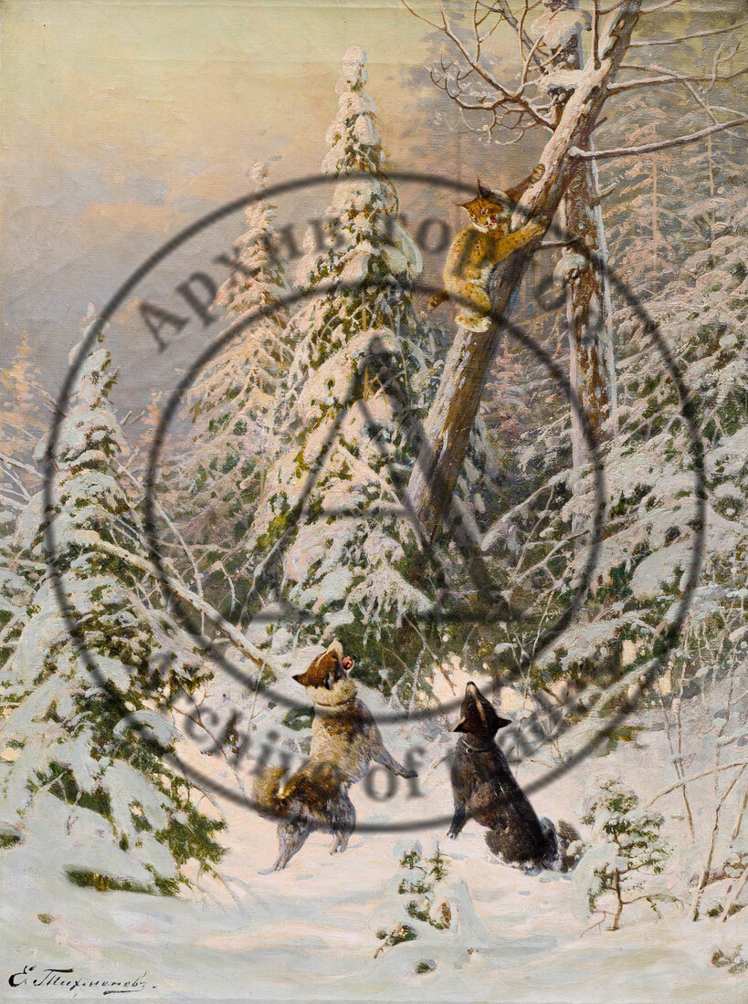 Тихменёв Евгений Александрович (1869-1934) - русский живописец, график, анималист. Евгений Александрович Тихменев происходит из старинного дворянского рода Тихменевых, восходящего ко второй половине XVI века. Отец будущего художника — полковник Александр Дионисиевич Тихменев — был командиром 13-го пехотного резервного батальона в городе Сумы (Харьковская губерния, ныне - Украина). Когда его произвели в генерал-майоры, семья переехала в Петербург, в просторную квартиру на Разночинной улице.