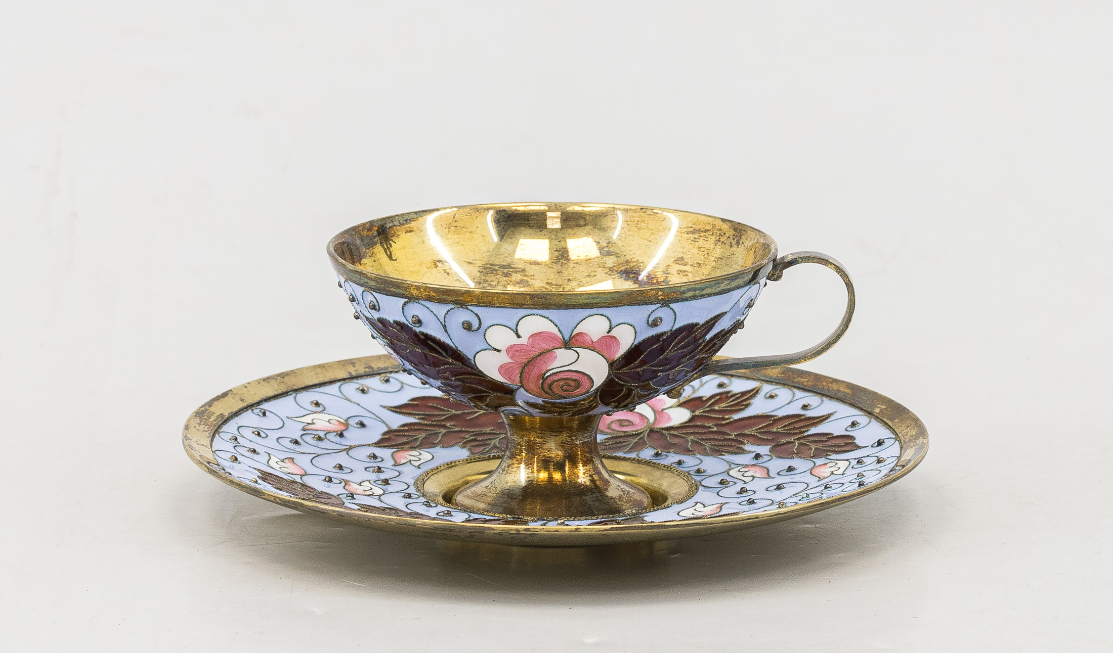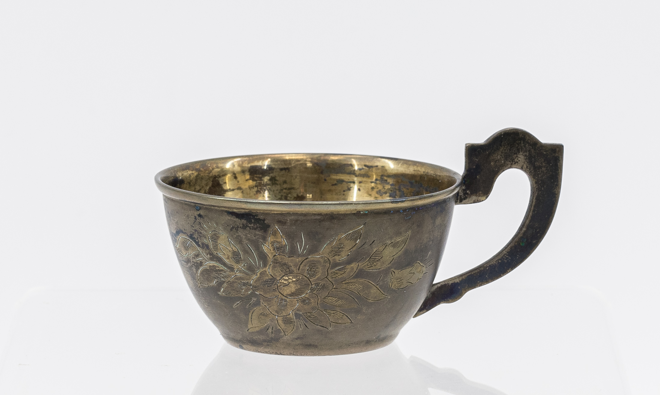 Клейма: 1) 916-й пробы с серпом и молотом на фоне пятиконечной звезды и литерой «л» (Северо-Западная государственная инспекция, г. Ленинград, 1958-1991 гг.), в щитке в виде прямоугольника с выпуклыми противоположными горизонтальными сторонами; 2) в прямоугольных щитках клейма изготовителя с указанием года производства: «·9ЛЮ» (на стопке на высокой ножке); «8ЛЮ» (на остальных восьми стопках).